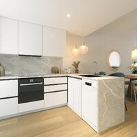 Deze luxe verdieping appartementen worden trapsgewijs gebouwd. De woningen zijn voorzien van 2 slaapkamers en 2 badkamers waarvan 1 badkamer en suite. De living heeft een moderne open keuken waarbij de keukenapparatuur deels inclusief is. Het terras is 23 m2. De parking is deels ondergronds en deels bovengronds met een pre-installatie voor elektrische auto’s. De gemeenschappelijke ruimte heeft een gezellige binnentuin met een prachtig zwembad. Het complex heeft een centrale conciërge.