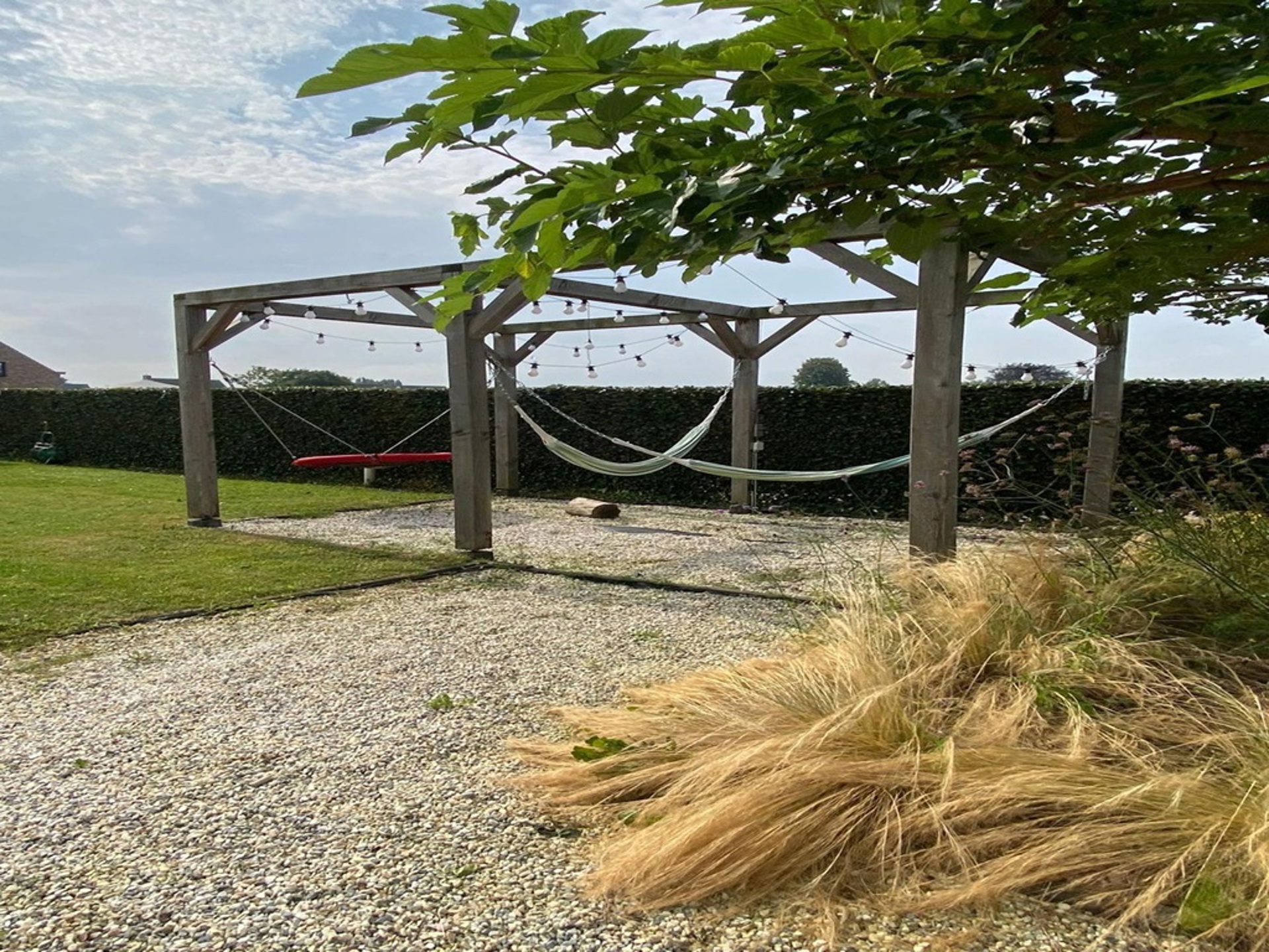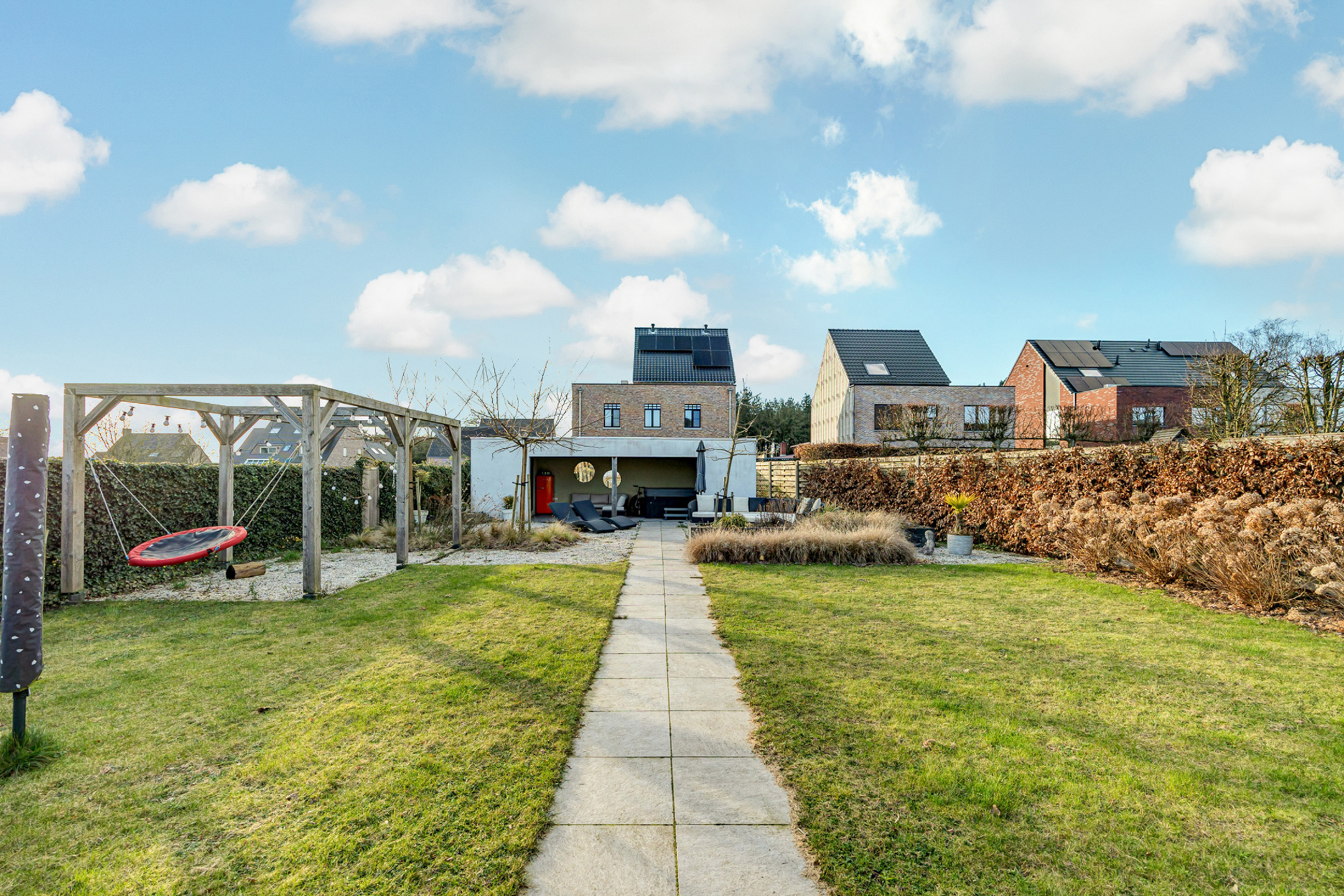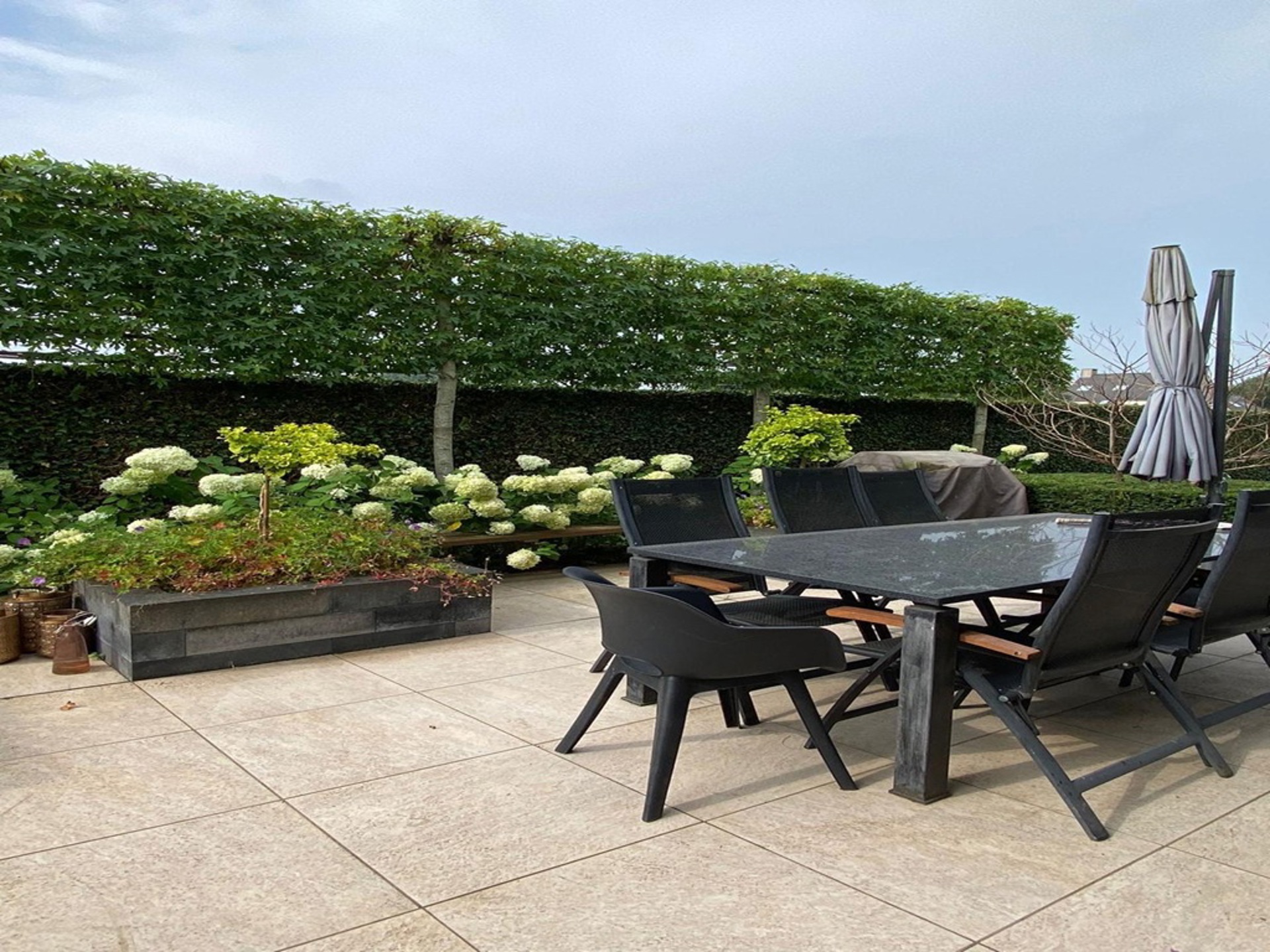 Tot slot hebben we nog de tuin waar we zowaar de ganse dag wel ergens een plekje in het zonnetje terug kunnen vinden. Achter de woning, grenzend aan de keuken, is een apart terras voorzien dat pal op het Zuiden ligt. Hier ook nog een ruime tuinberging. Ook is het gezellig vertoeven in de voorziene poolhouse! Voor de auto is er een carport voorzien en daarnaast nog ruim voldoende staanplaatsen.
