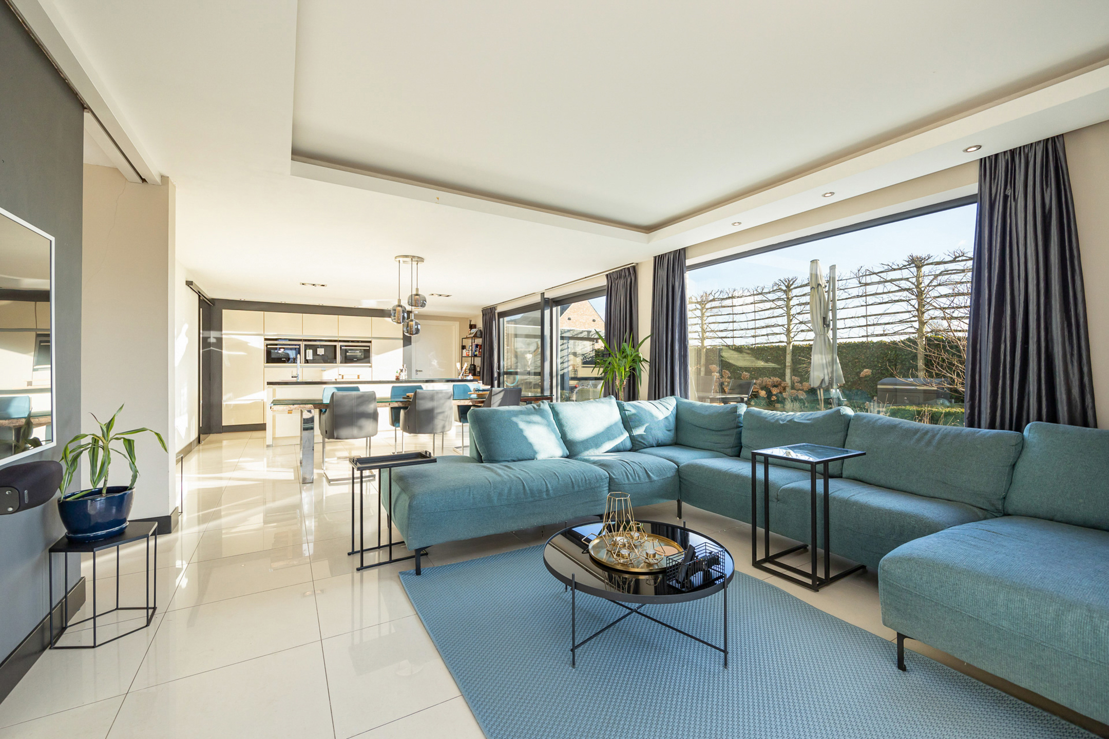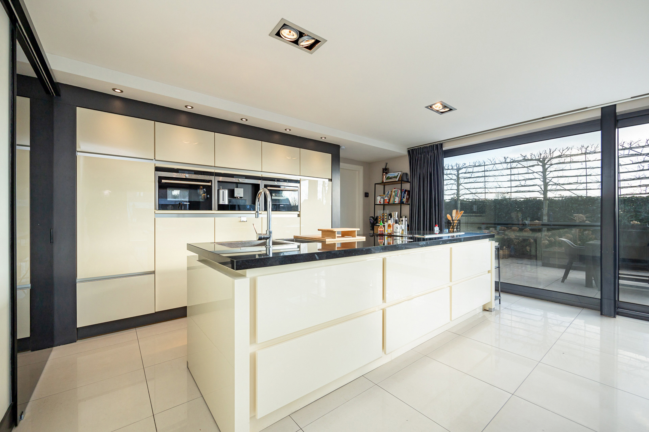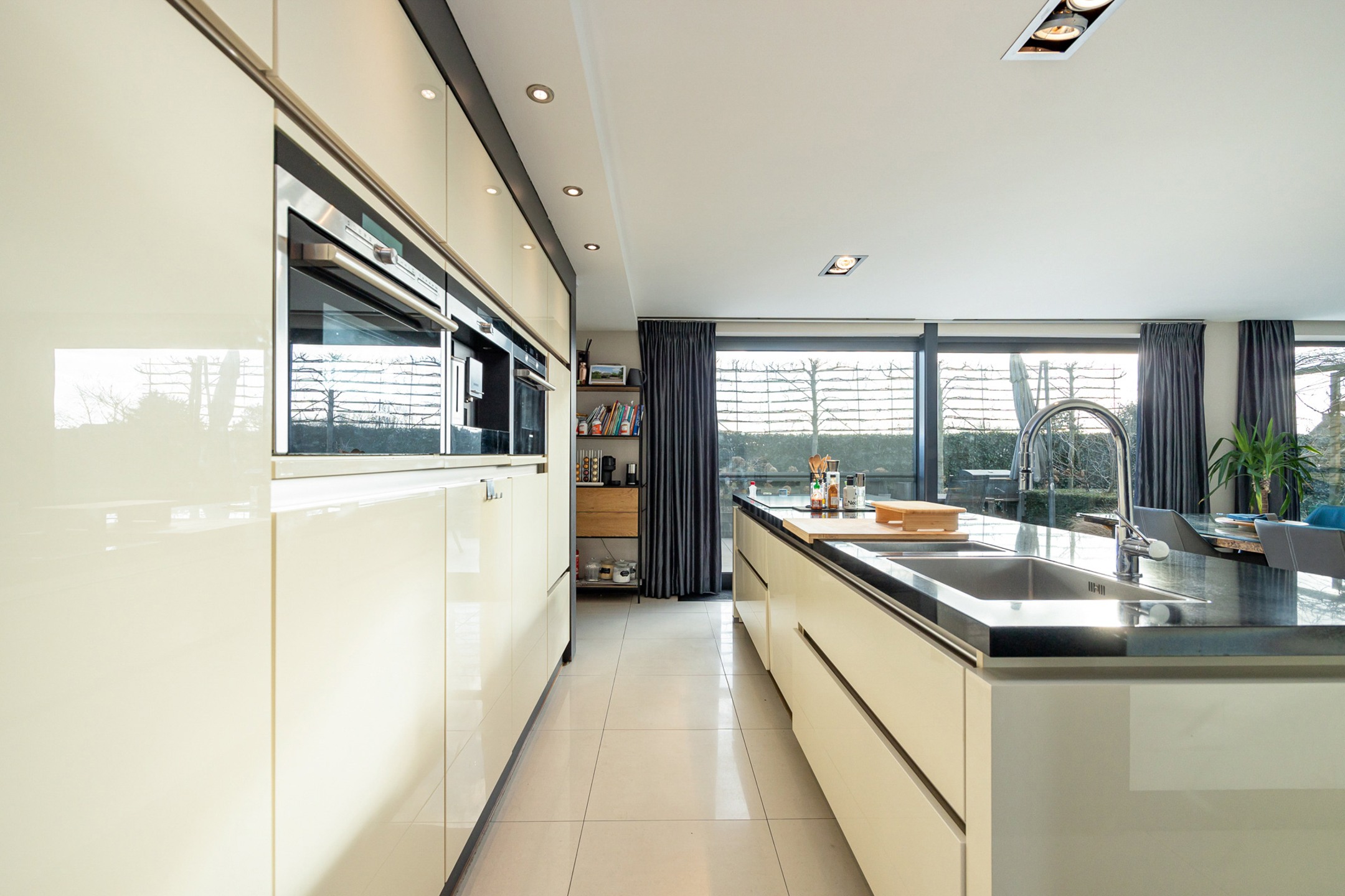 Omschrijving: we betreden de woning via de ruime inkomhal met apart gastentoilet. Bij binnenkomst begeven we ons in een zeer lichtrijke ruimte die momenteel ingericht is als een tweede zithoek. Hier heeft u indelingsgewijs natuurlijk nog tal van andere mogelijkheden gezien de centrale woonkamer zich net om de hoek bevindt. Deze is geconnecteerd met de open keuken en wordt overgoten in natuurlijk licht dankzij de vele grote raampartijen. De keuken is volledig uitgerust met hoogwaardige apparatuur en biedt een ideale combinatie van functionaliteit en design. De keuken beschikt over een combi-oven, een stoomoven, een inbouw koffiemachine, een vaatwasser en een ruime ingebouwde koelkast. In het keukeneiland zijn naast de vele ingemaakte kasten ook anderhalve spoelbak en een kookvuur met geïntegreerde dampkap voorzien. Achteraan zit nog een aparte bijkeuken. Via de keuken komen we ook bij de bureauruimte vooraan, die opnieuw naar wens en zelfs tot gelijkvloerse slaapkamer ingericht kan worden. Deze is ook apart te bereiken via de inkomhal.