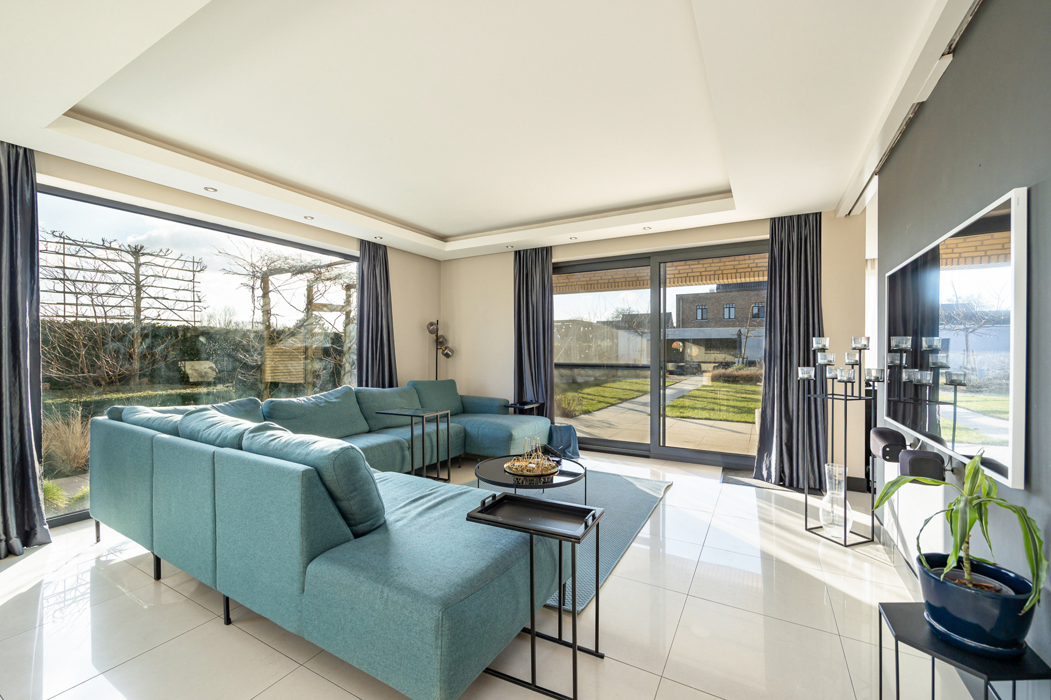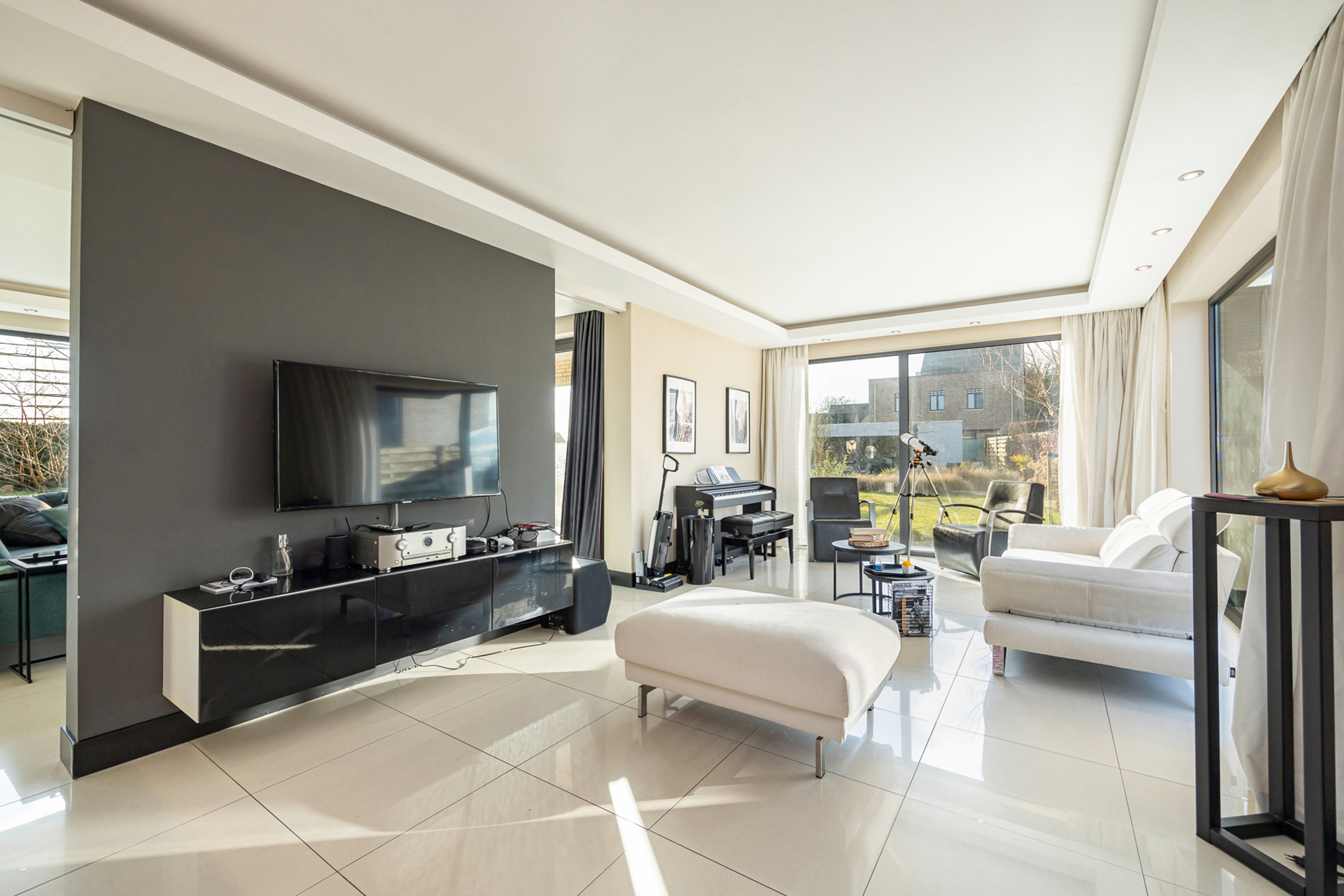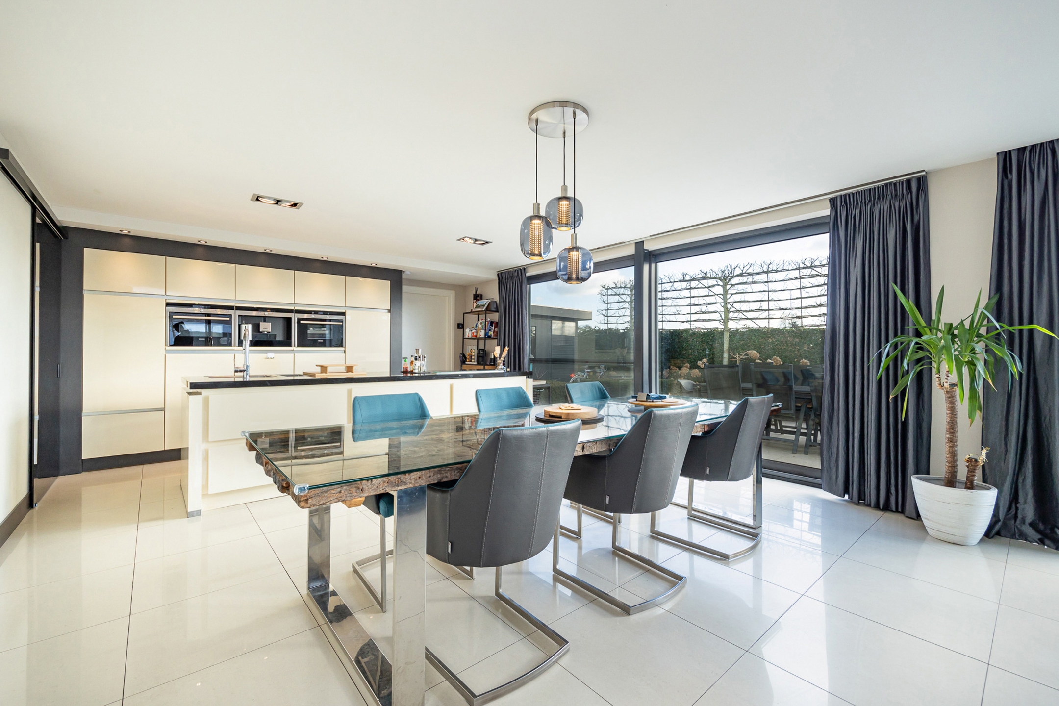 Omschrijving: we betreden de woning via de ruime inkomhal met apart gastentoilet. Bij binnenkomst begeven we ons in een zeer lichtrijke ruimte die momenteel ingericht is als een tweede zithoek. Hier heeft u indelingsgewijs natuurlijk nog tal van andere mogelijkheden gezien de centrale woonkamer zich net om de hoek bevindt. Deze is geconnecteerd met de open keuken en wordt overgoten in natuurlijk licht dankzij de vele grote raampartijen. De keuken is volledig uitgerust met hoogwaardige apparatuur en biedt een ideale combinatie van functionaliteit en design. De keuken beschikt over een combi-oven, een stoomoven, een inbouw koffiemachine, een vaatwasser en een ruime ingebouwde koelkast. In het keukeneiland zijn naast de vele ingemaakte kasten ook anderhalve spoelbak en een kookvuur met geïntegreerde dampkap voorzien. Achteraan zit nog een aparte bijkeuken. Via de keuken komen we ook bij de bureauruimte vooraan, die opnieuw naar wens en zelfs tot gelijkvloerse slaapkamer ingericht kan worden. Deze is ook apart te bereiken via de inkomhal.