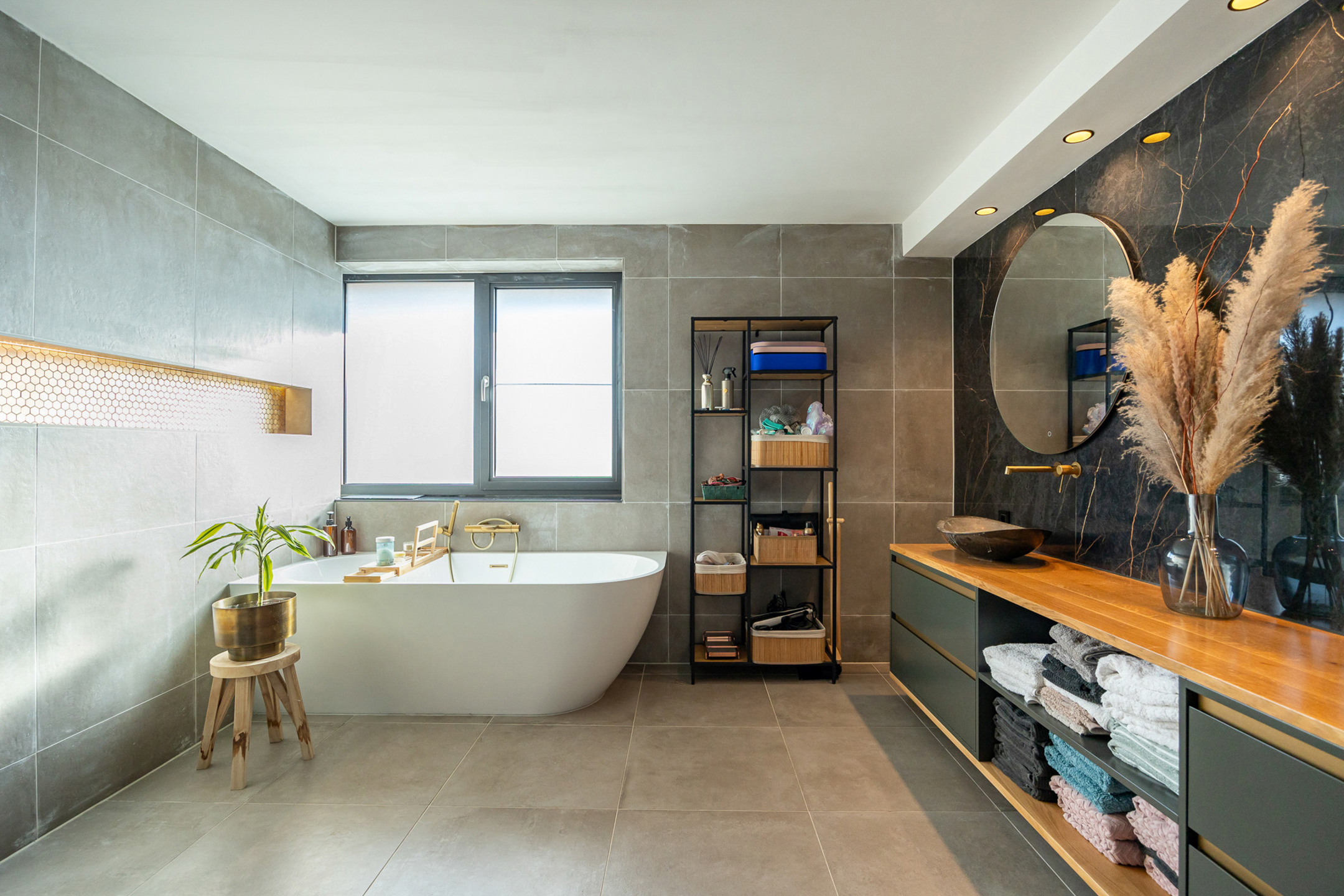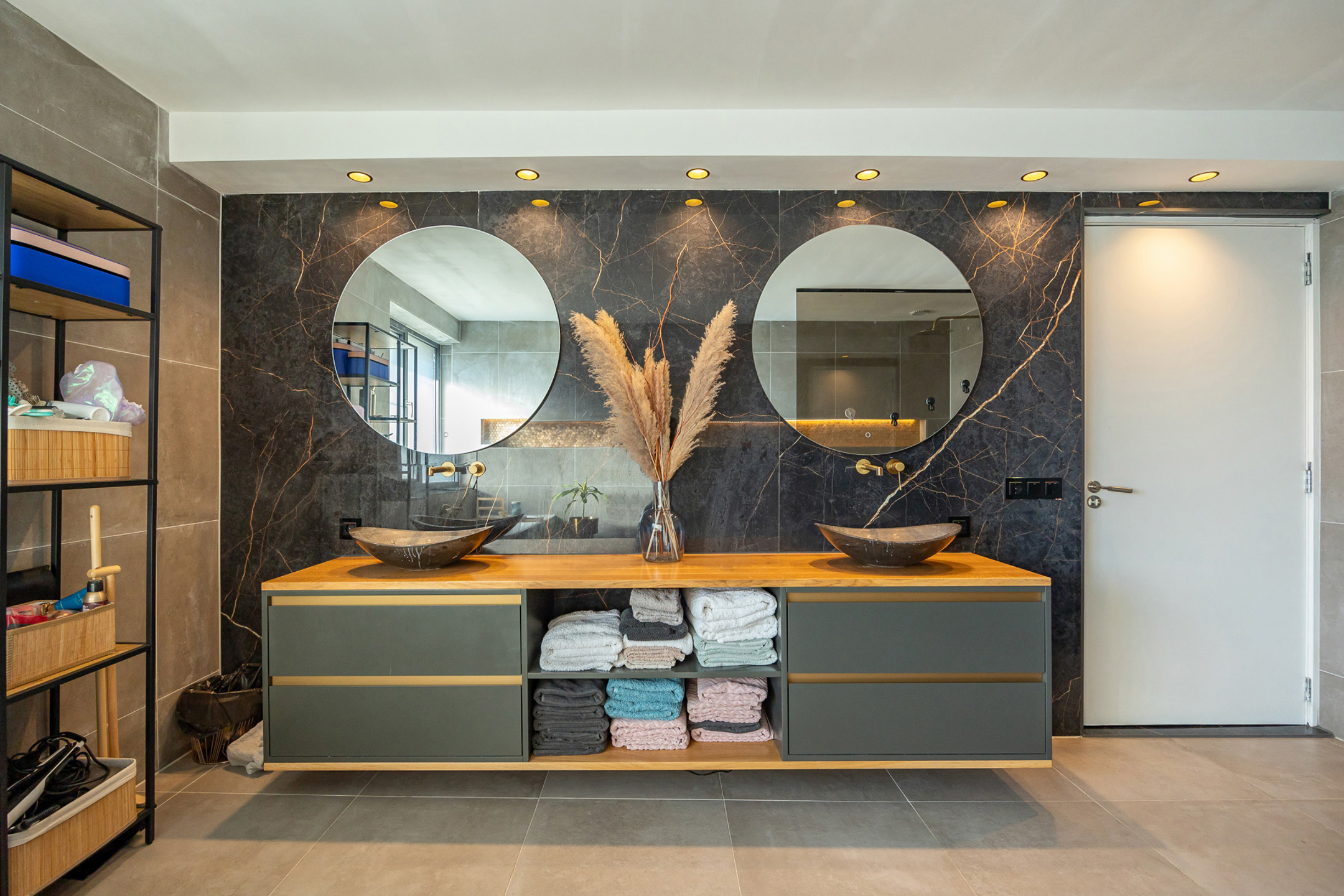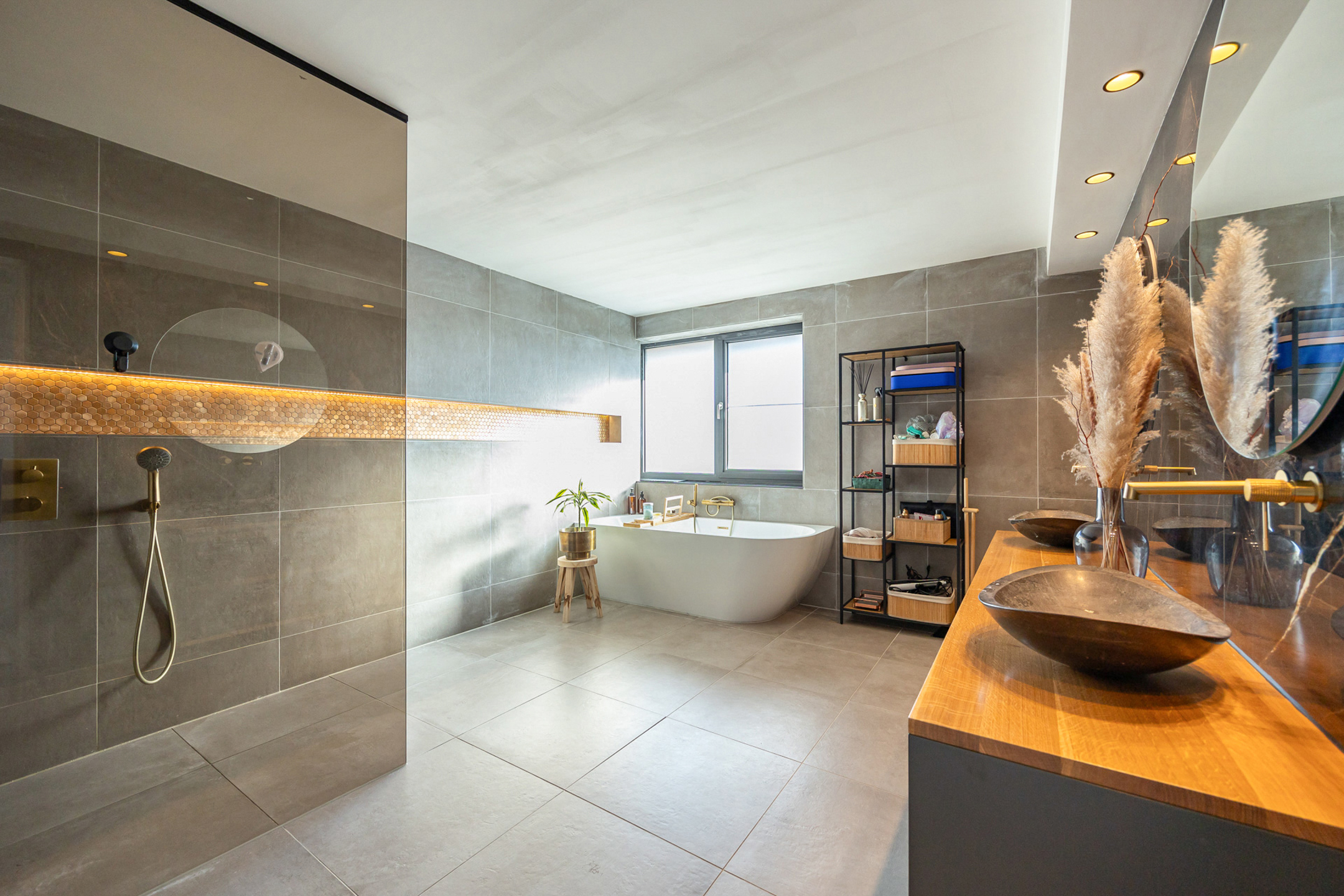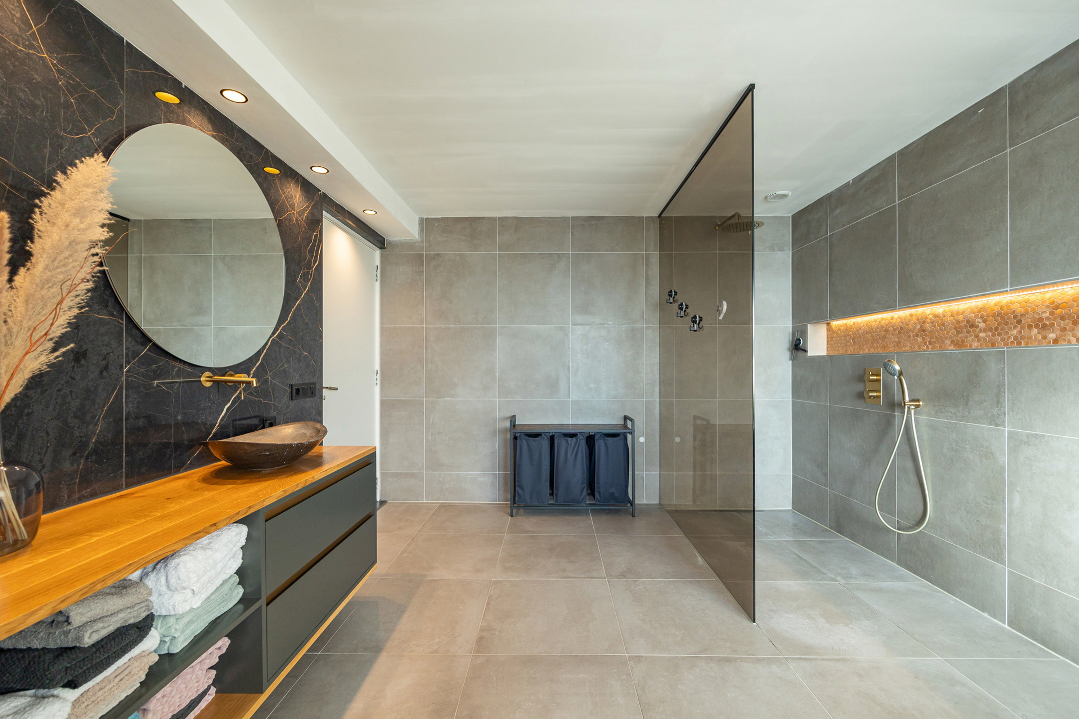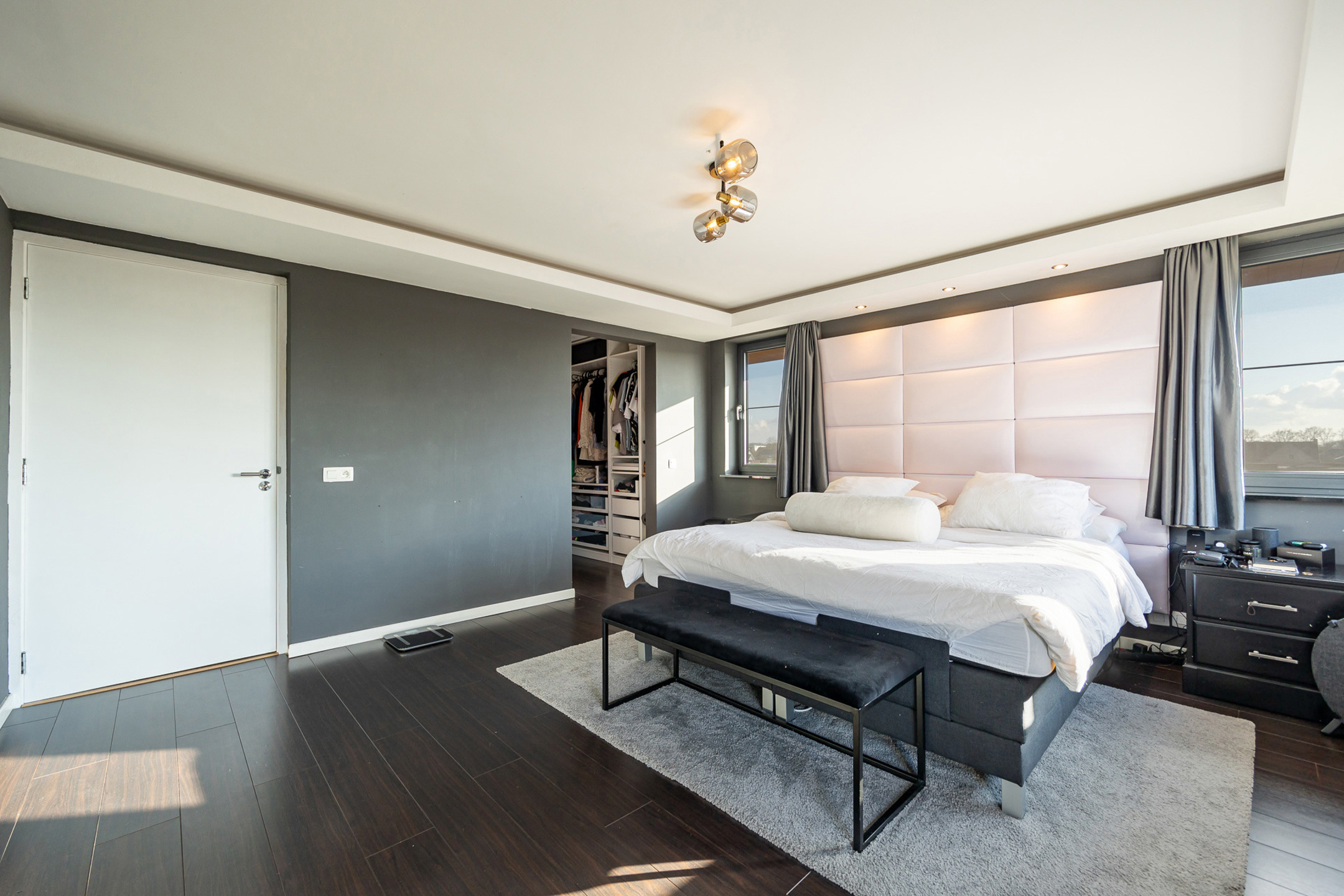 Op de eerste verdieping hebben we drie ruime slaapkamers. De twee grootste hebben een oppervlakte van 19,5 m², waarvan er ook nog eentje over een aparte dressing beschikt, en de “kleinste” heeft een oppervlakte van 15,5 m². De luxueus afgewerkte badkamer beschikt over een ligbad, een ruime inloopdouche en een lavabomeubel met twee lavabo’s. Op deze verdieping is ook nog eens een apart toilet voorzien.