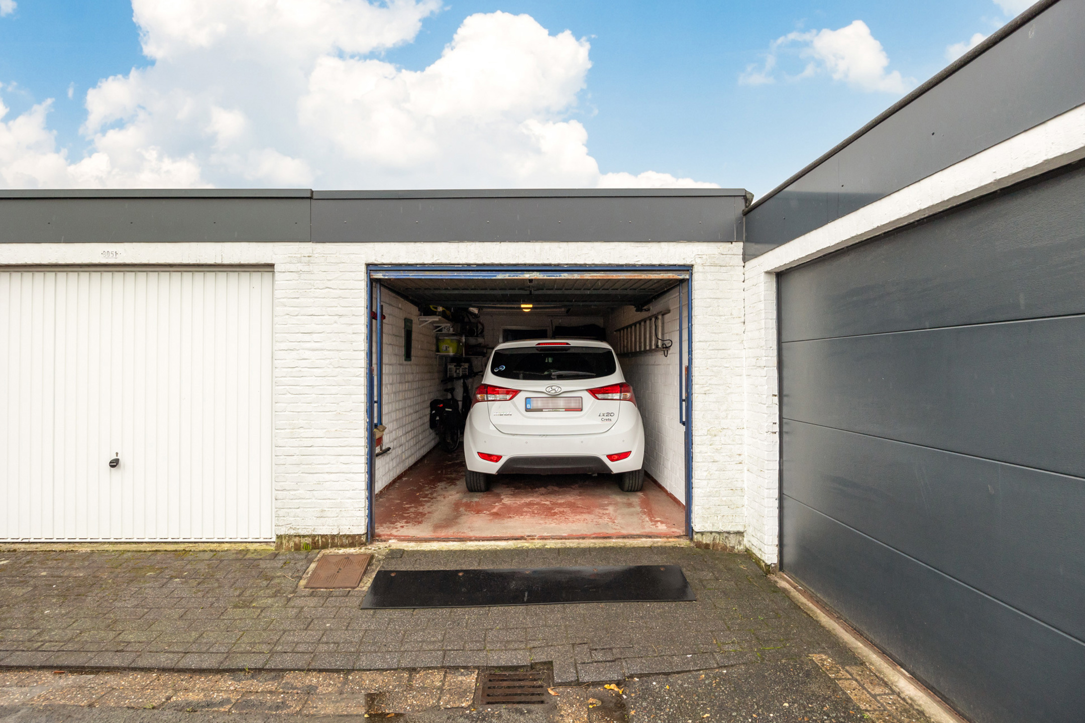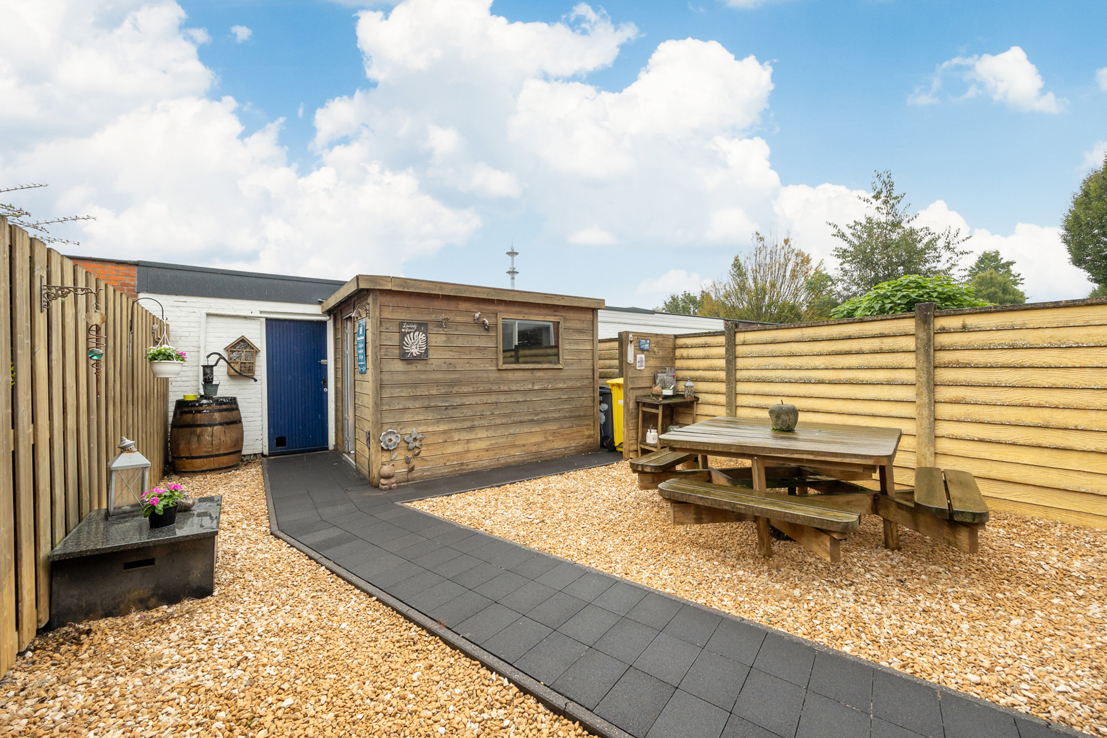 Achteraan een terras met tuin, tuinberging en een garage met handmatige poort.