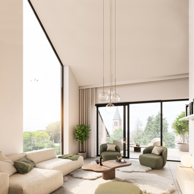 Dankzij verzonken schuiframen vloeien de leefruimtes naadloos over naar de terrassen, waar men in alle rust kan ontspannen zonder inkijk. De twee bovenste appartementen vallen bovendien extra op door hun indrukwekkende leefruimte - open tot in de nok - en de bijkomende ruime bergzolder.