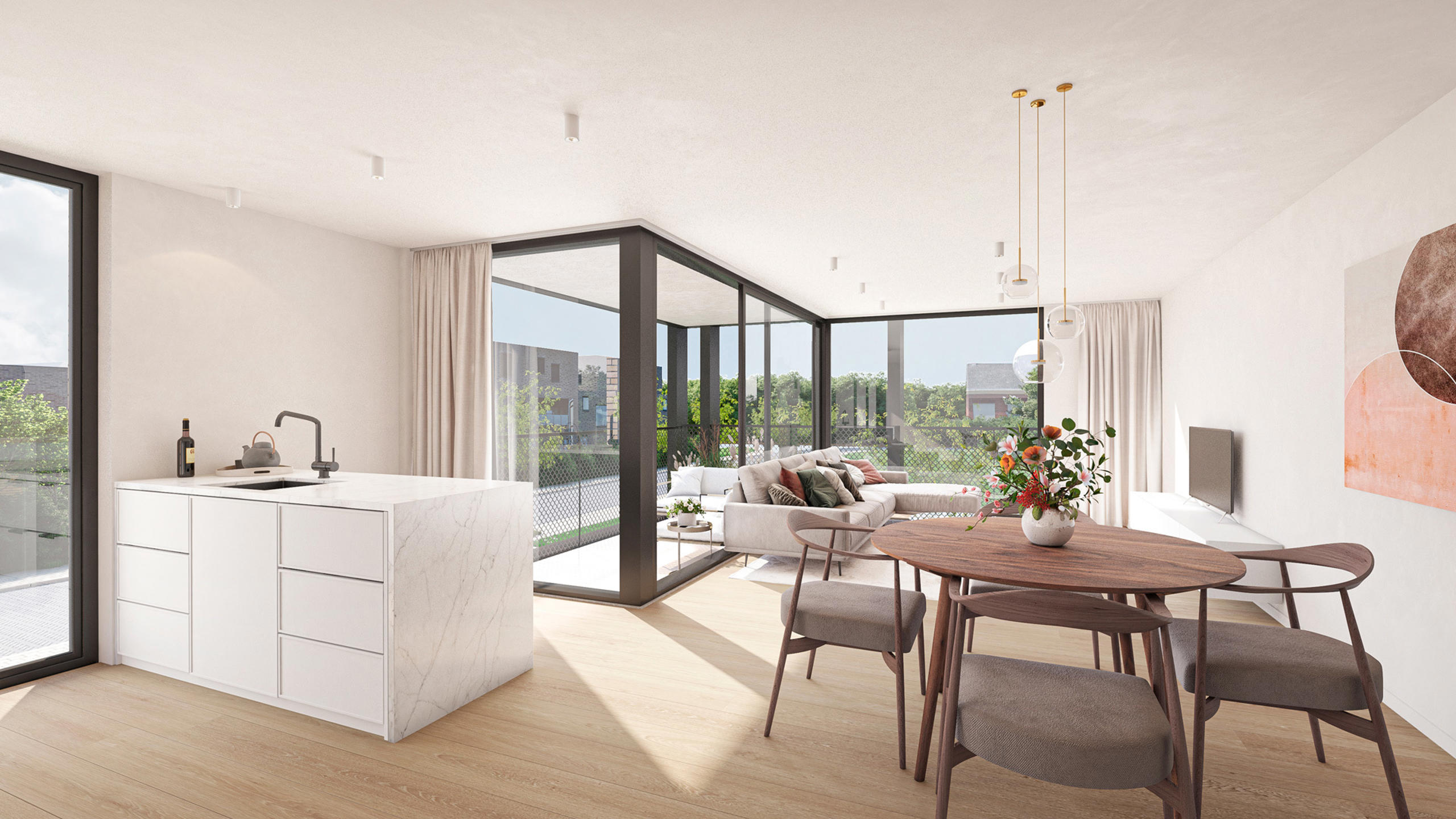 Appartement A3.4 bevindt zich op de derde verdieping en heeft een oppervlakte van 93m². Het beschikt over een open ingerichte keuken, 2 slaapkamers en een terras van 10m².