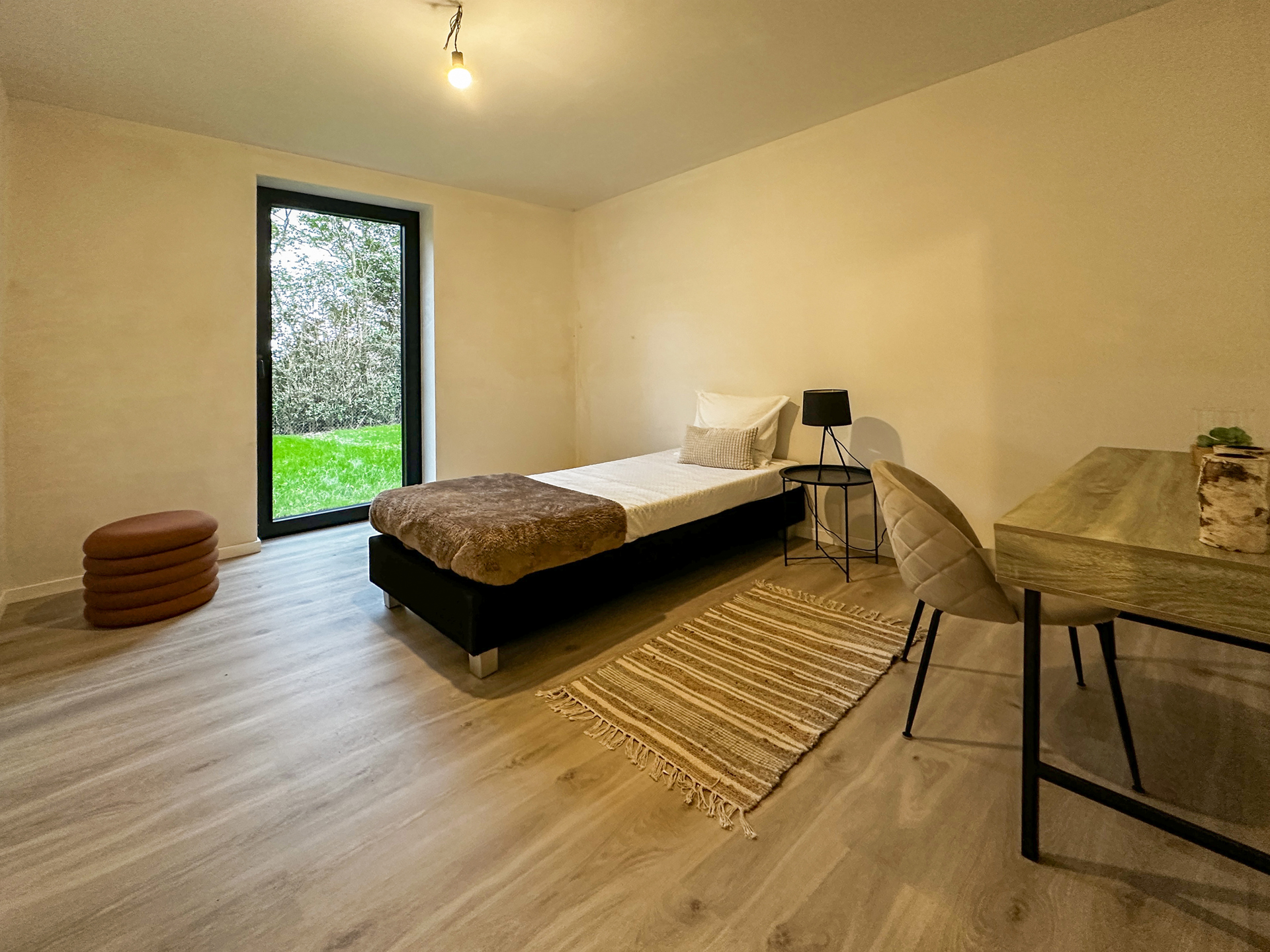 Appartement C.0.2 bevindt zich op het gelijkvloers in gebouw C en heeft een oppervlakte van 117m². Het beschikt over een open ingerichte keuken, 3 slaapkamers en een terras van 16m² en tuin van 184m².