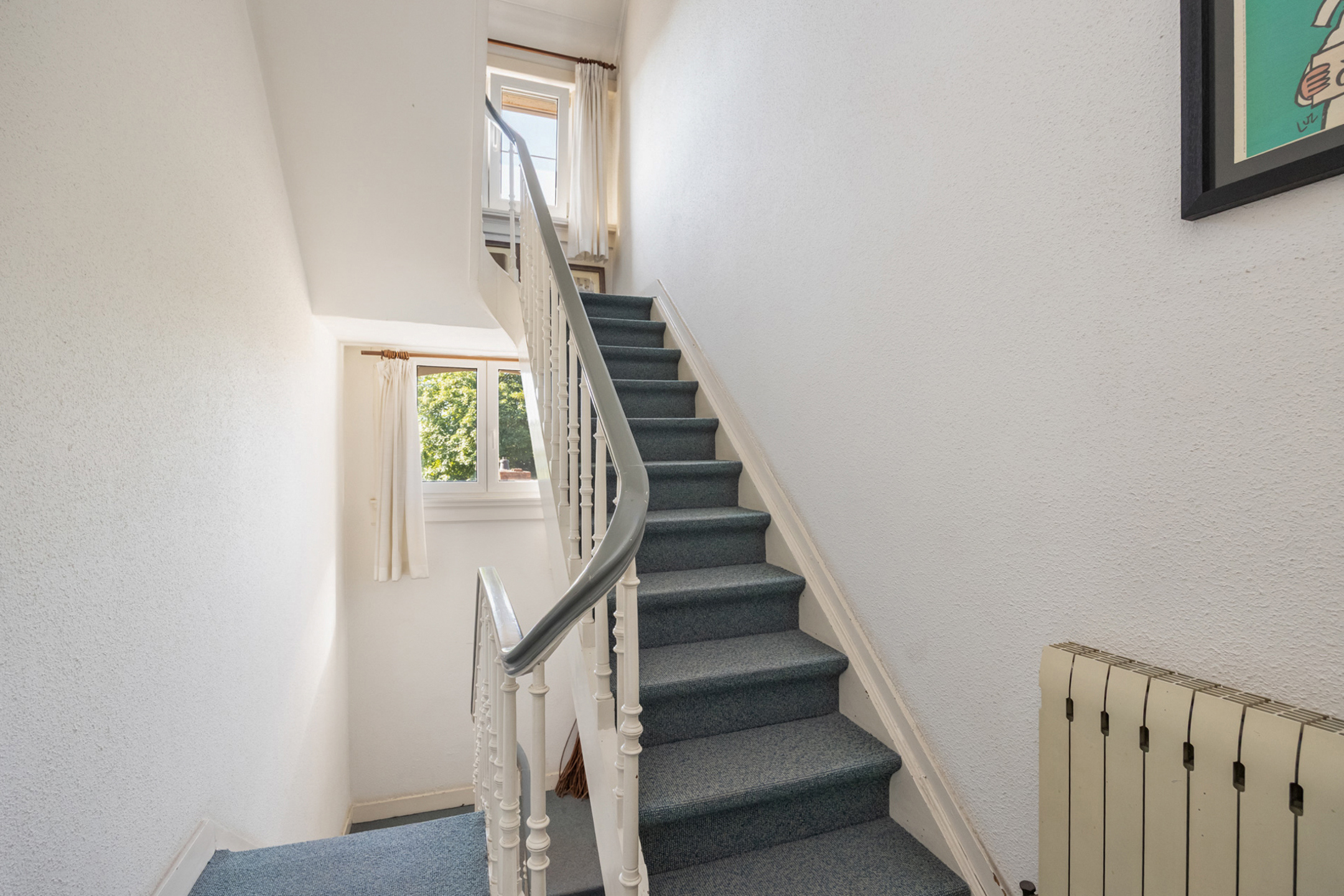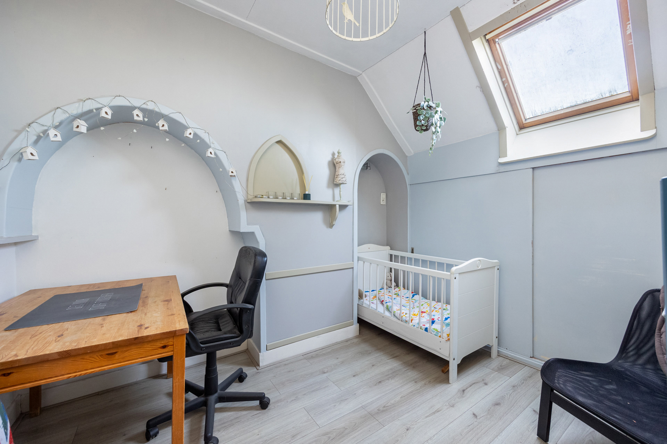 Eerste verdieping met 2 slaapkamers en een badkamer met inloopdouche, badkamermeubel en toilet.