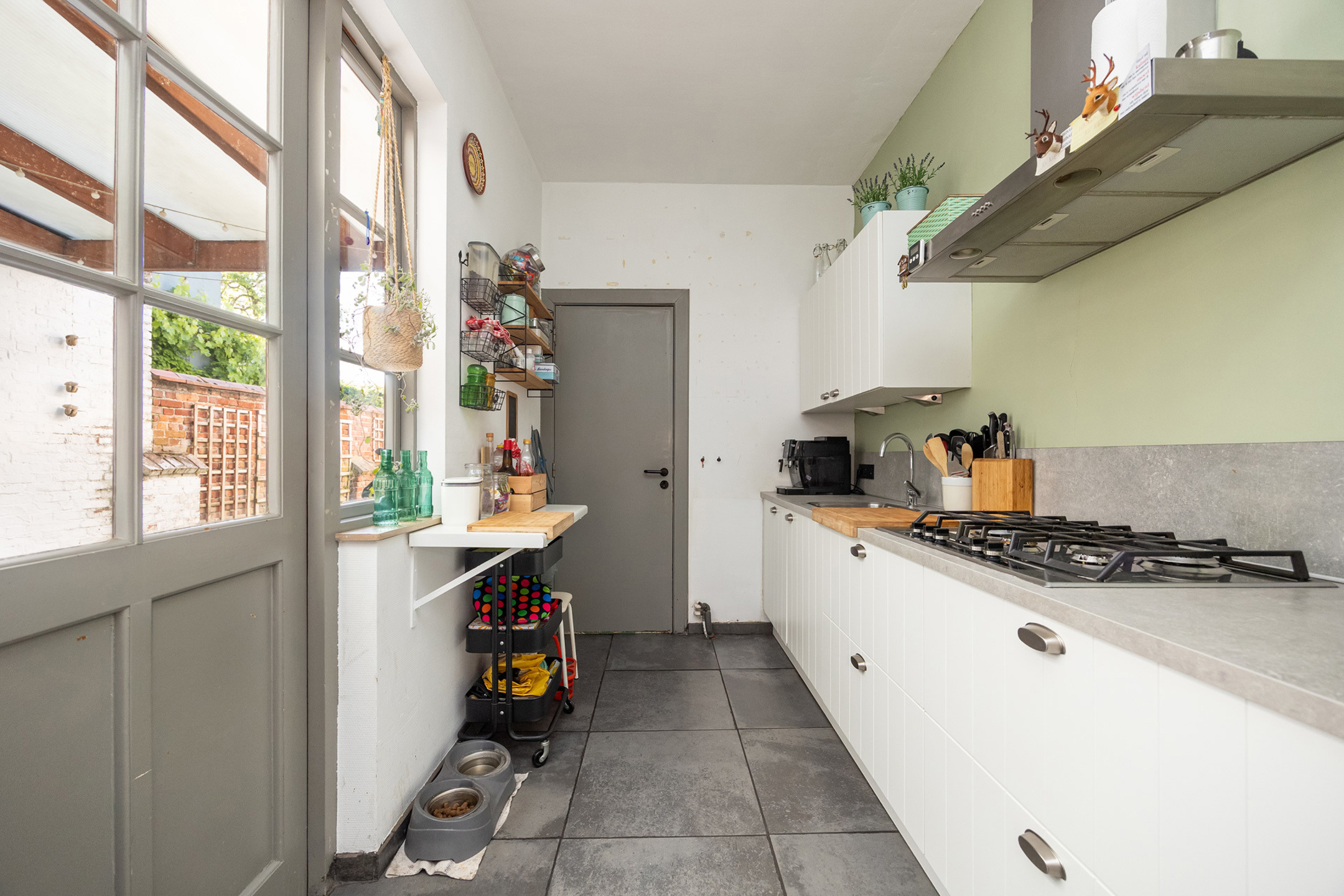 Omschrijving: charmant herenhuis op een invalsweg naar het centrum. Meerdere scholen in de onmiddellijke omgeving, openbaar vervoer vrijwel voor de deur. Herenhuis met de typische hoge plafonds. Indeling: inkomhal met plaats voor fietsen, leefruimte bestaande uit een bureauruimte of zitkamer vooraan, tv kamer en vervolgens een eetkamer met doorgang naar het gedeeltijk overdekte terras en tuin. Mooie parketvloeren over de volledige leefruimte beneden. Keuken met kastwerk en toestellen (oven, koelkast, diepvries, gasvuur, vaatwasser) Aansluitend tv en wasplaats met cv ketel en extra bergruimte. Extra opslagruimte in de 3 koele en droge kelders.
