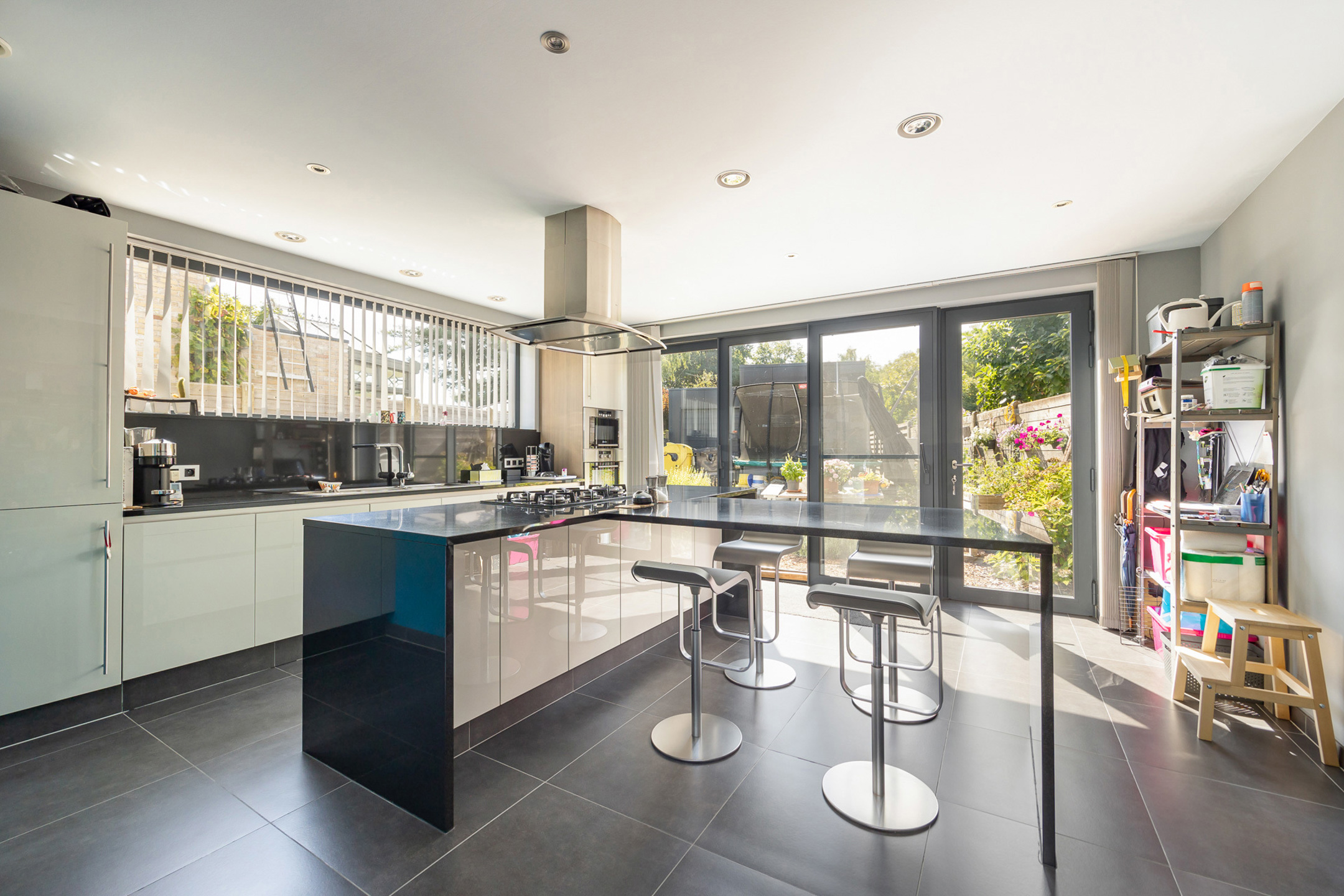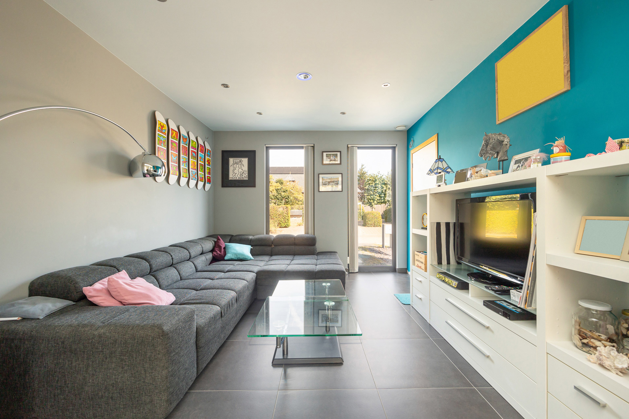 Via de inkomhal met gastentoilet en trap betreedt u de woning. Van hieruit is er aansluitig naar het leefgedeelte dewelke bestaat uit een zithoek, eethoek en leefkeuken. Deze vormen samen een erg ruim en open geheel en genieten van heel wat lichtinval. De keuken bevindt zich achteraan de woning en heeft een fijne connectie met de tuin door de grote schuifraam.