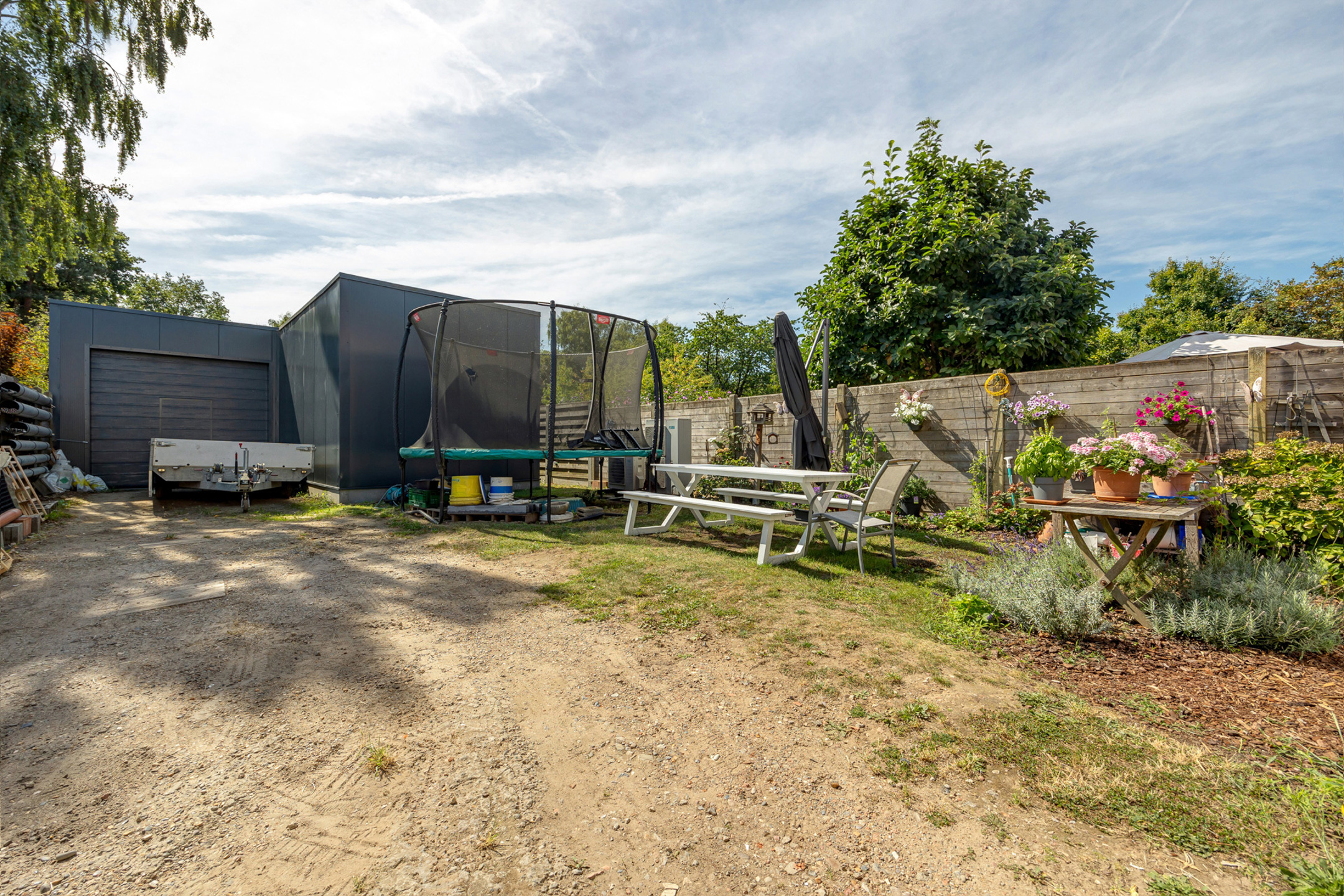 Eenmaal buiten valt de rustige en groene omgeving onmiddelijk op. Een vergund magazijn van 100 m² is hier aanwezig. Het plan hiervan vindt u terug op onze website bij documenten. Deze beschikt over 3-fase aansluiting, een elektrische autolift, en er werd voorzien in een extra mezannine van +- 50m². Ook een sanitair gedeelte is hierin voorzien.