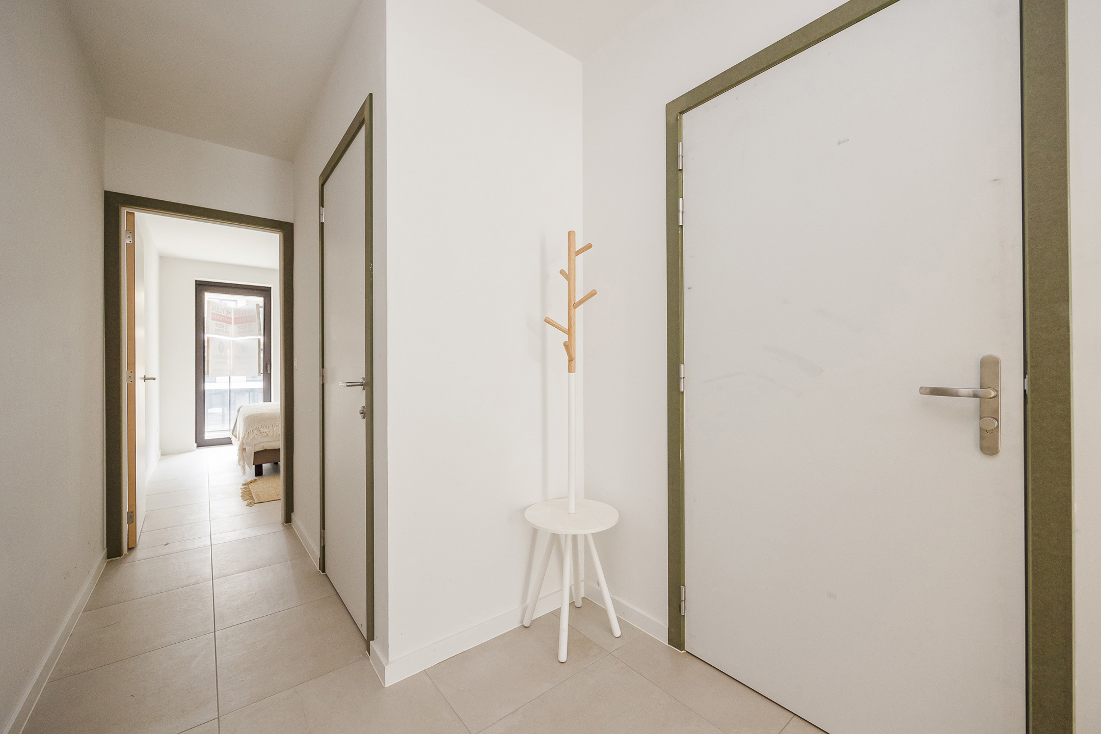 Indeling: Inkomhal, toilet, badkamer, woonkamer, open keuken, berging, twee slaapkamers, terras, kelderberging, ondergrondse autostaanplaats.