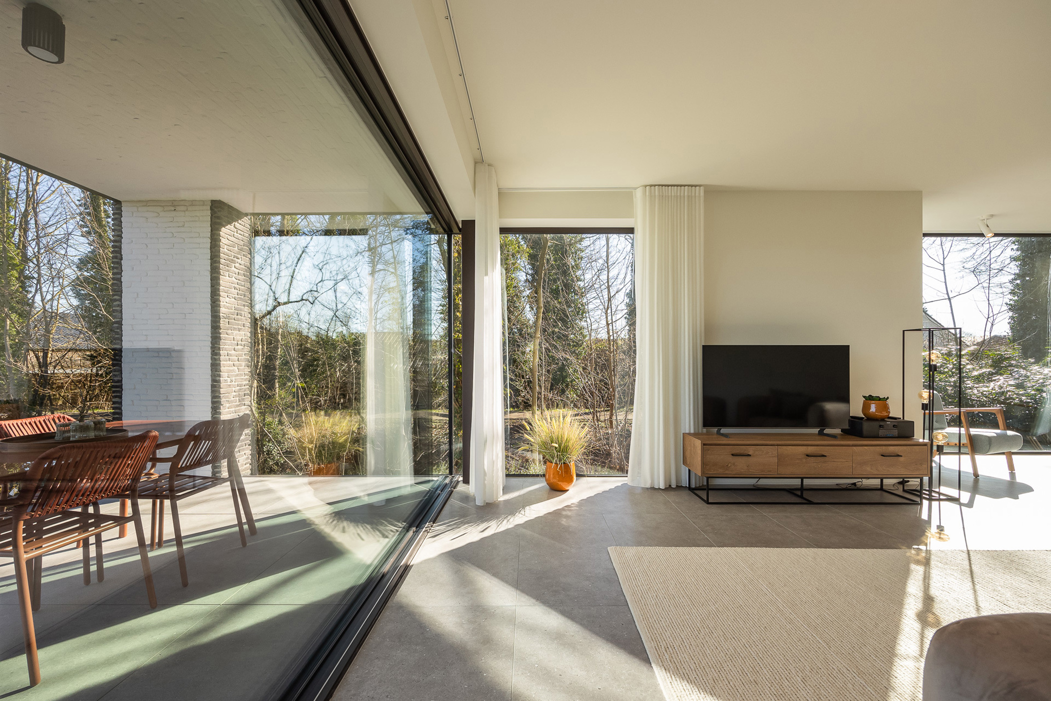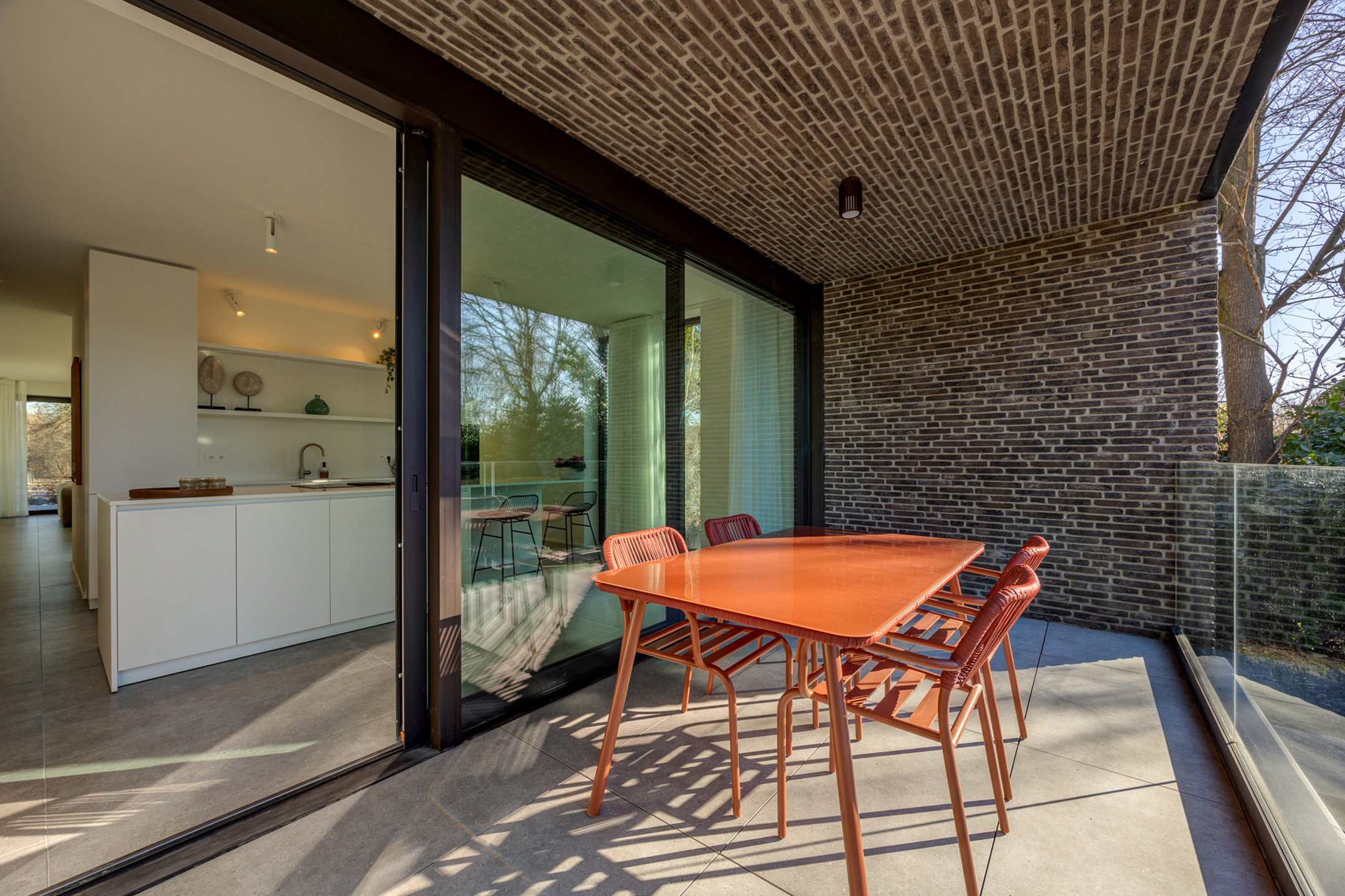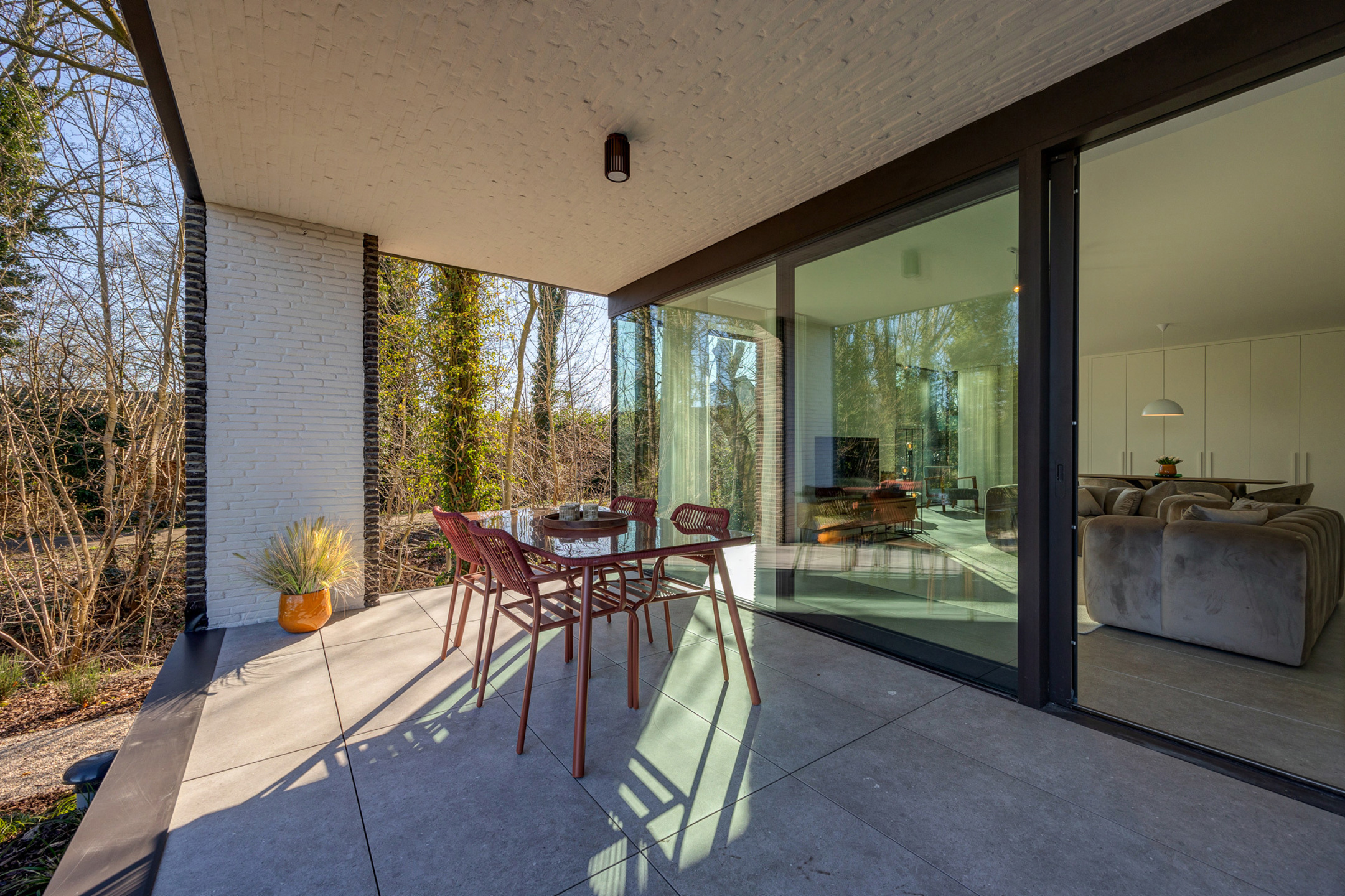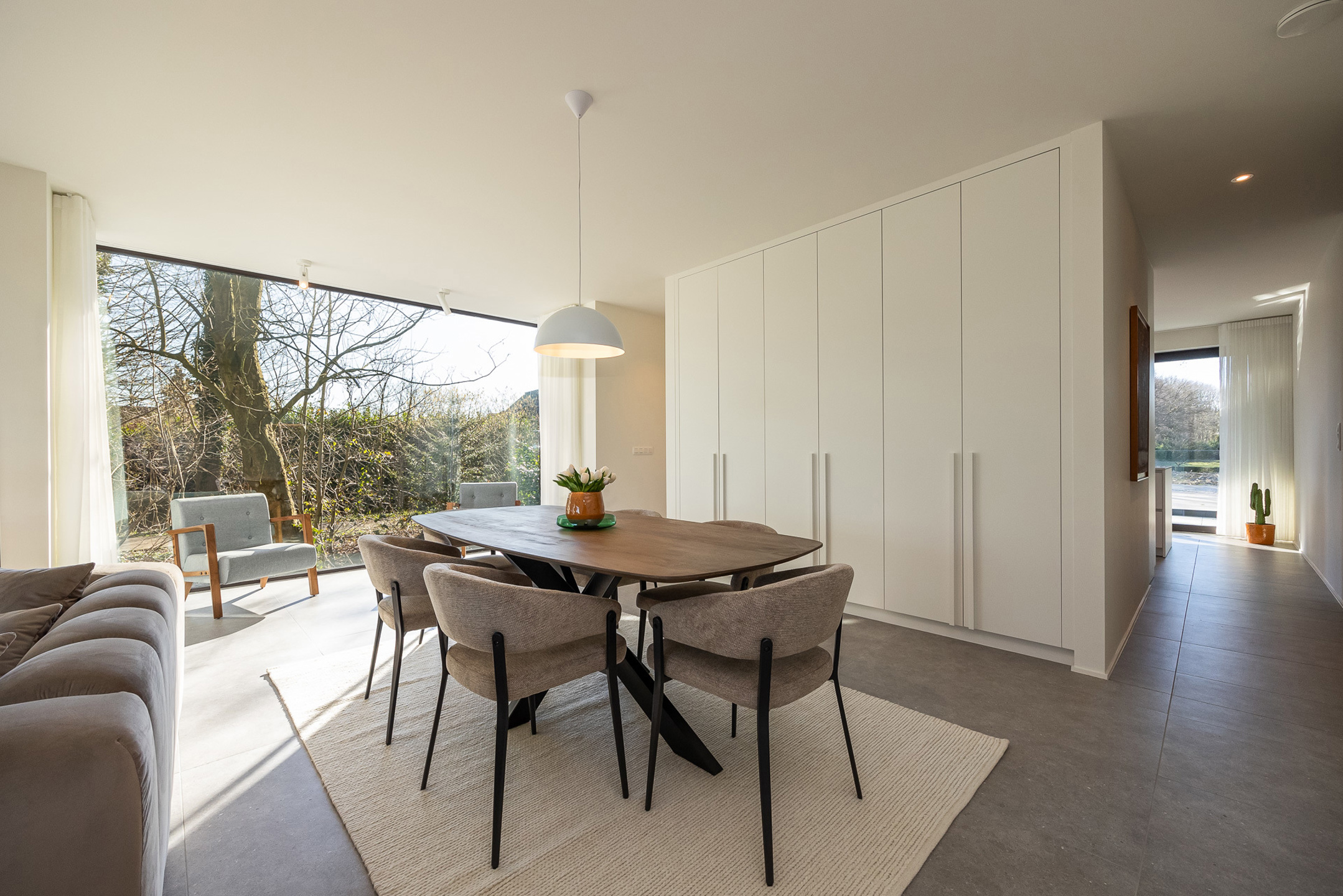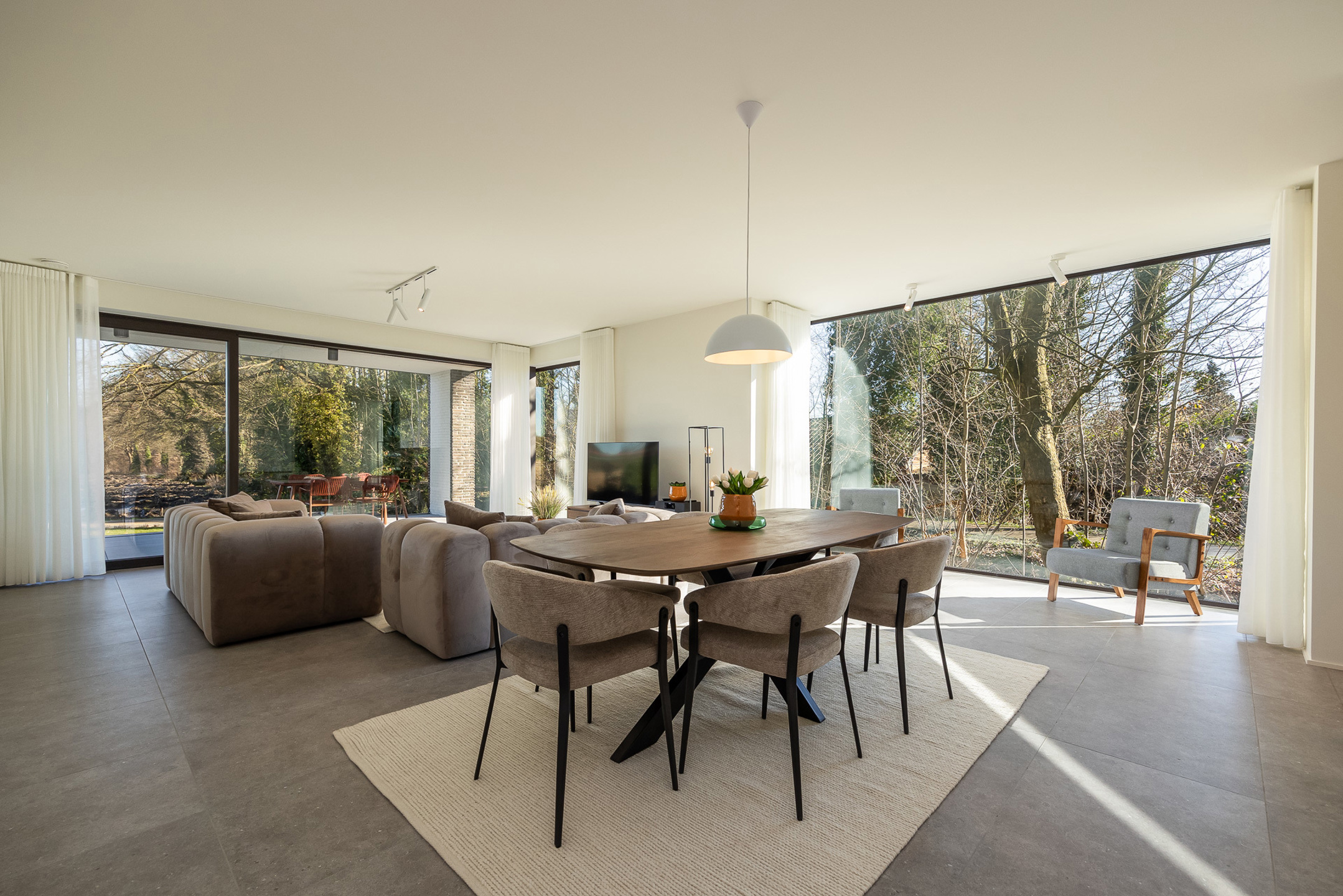 Omschrijving: Dit luxueuze hoekappartement heeft een bewoonbare oppervlakte van maar liefst 153 m² en beschikt over een ruim terras aan zowel de voor- als de achterkant van het gebouw (samen 36 m²). Het bevindt zich op het gelijkvloers maar is naar de tuin/terras toe verhoogd, wat het gevoel creëert dat u op een hoger niveau zit. Hierdoor geniet u van een beter zicht en meer privacy. De doorzonwoonkamer met erker zorgt voor veel natuurlijke lichtinval en een aangenaam open gevoel.