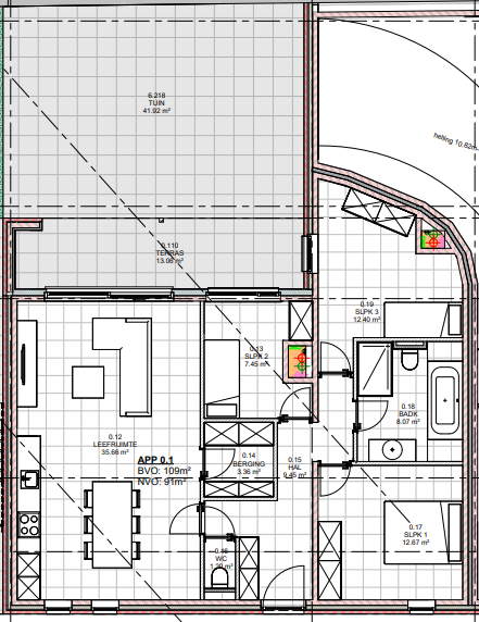 Duurzaam gelijkvloers appartement met 3 slaapkamers, terras met eigen tuin, kelderberging, autostaanplaats en verschillende gemeenschappelijke ruimtes.