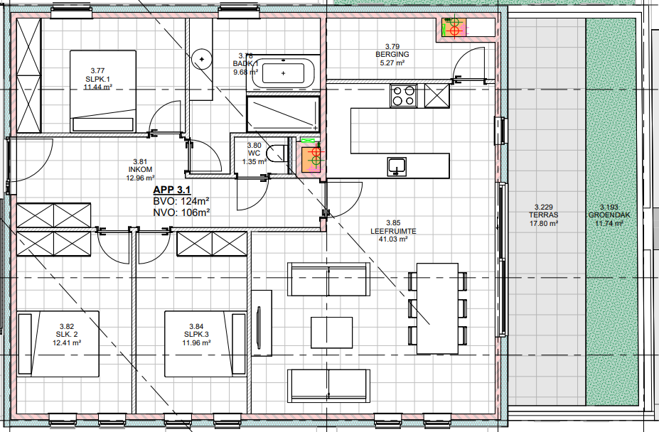 Beschrijving: U betreedt het appartement op de derde verdieping via de inkomhal met apart toilet. Aansluitend bevindt zich de leefruimte met open keuken, die uitgerust is met koelkast, kookplaat, dampkap en oven. Verder bevinden zich de 3 slaapkamers en badkamer die voorzien is van een inloopdouche, lavabo in meubel en bad. Het appartement beschikt ook over een technische berging, autostaanplaats en een kelderberging. Op een deel van het dak zijn zonnepanelen geplaatst, de opgewekte energie wordt gebruikt voor de werking van het collectieve verwarmingssysteem. Er zijn verschillende gemeenschappelijke ruimtes voorzien: