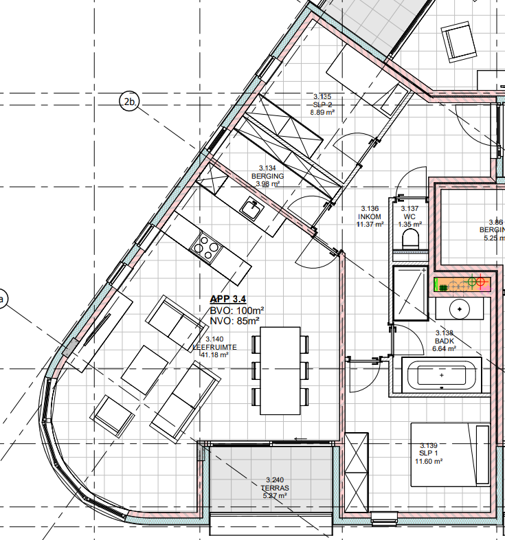 Beschrijving: U betreedt het appartement op de derde verdieping via de inkomhal met aparte berging. Aansluitend bevindt zich de leefruimte met open keuken, die uitgerust is met koelkast, kookplaat, dampkap en oven. Verder bevindt zich een hal die leidt naar de 2 slaapkamers, apart toilet en de badkamer. De badkamer is voorzien van een inloopdouche, lavabo in meubel. Het appartement beschikt ook over een technische berging, een autostaanplaats en een kelderberging. Op een deel van het dak zijn zonnepanelen geplaatst, de opgewekte energie wordt gebruikt voor de werking van het collectieve verwarmingssysteem. Er zijn verschillende gemeenschappelijke ruimtes voorzien: