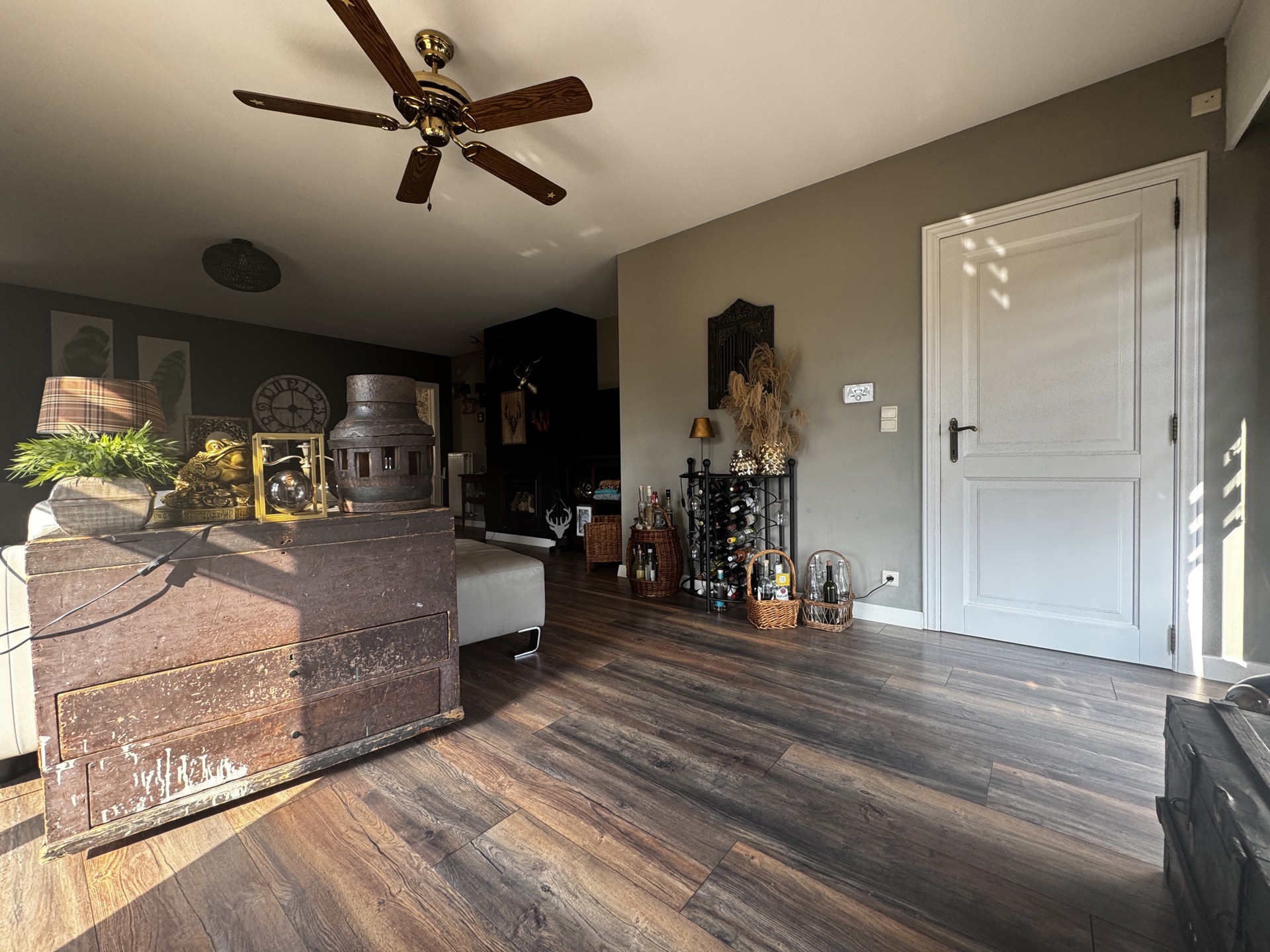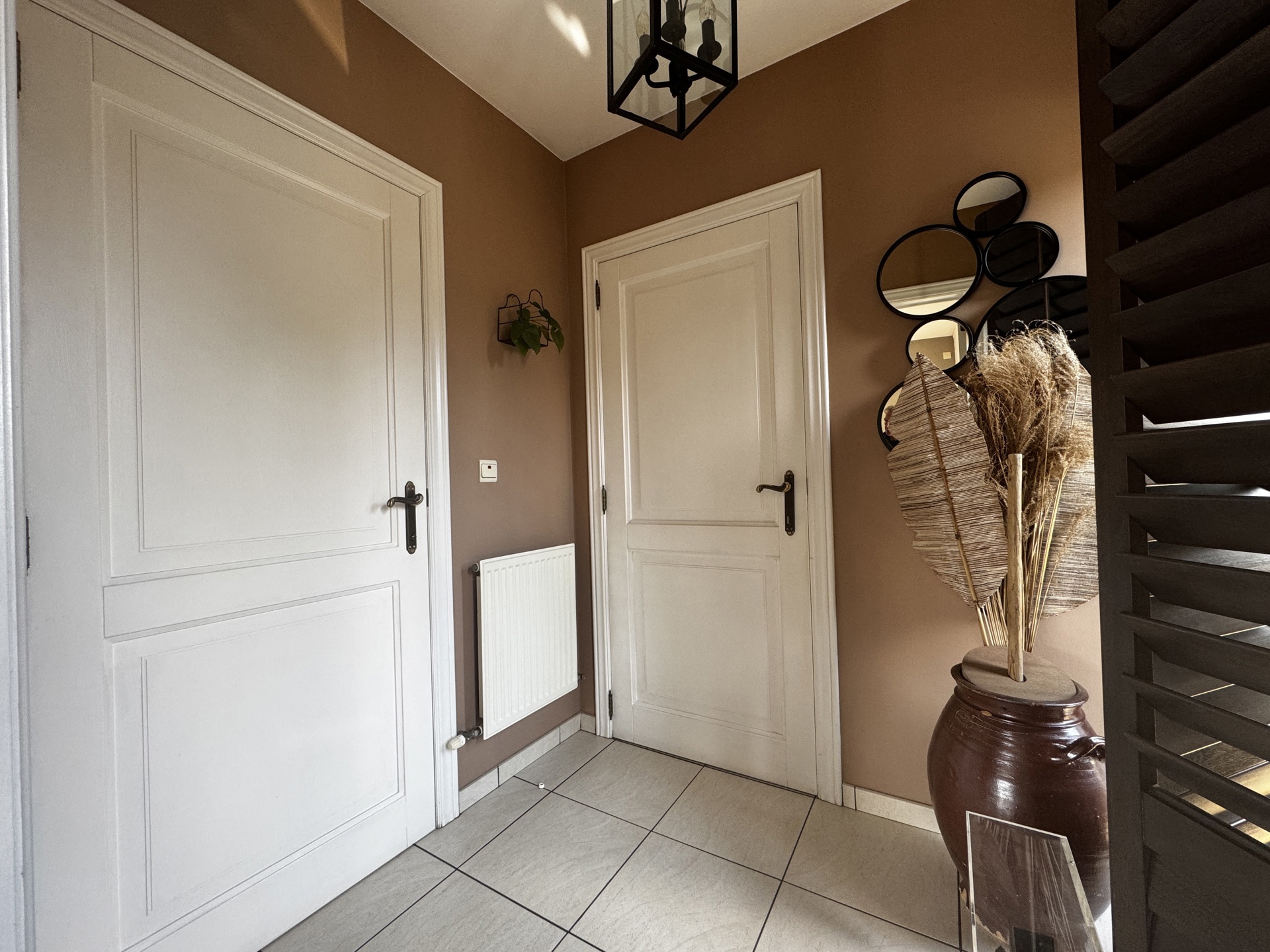 Beschrijving: in deze ruime energiezuinige woning van de jaren 90 zijn alle woonlokalen op het gelijkvloers. De inkomhal geeft aansluiting naar de inpandige garage met elektrische poort en aansluitingen voor wasmachine en droogkast. Hier zit tevens een vaste trap naar de zeer ruime bergzolder van meer dan 150m². Verder biedt de inkomhal toegang tot het gastentoilet met handenwasser en de leefruimte. De woonkamer is opgedeeld in een zit- en eethoek. Voor extra comfort en sfeer is hier een gashaard, wandverlichting met dimmers en aansluitingen voor muziekboxen voorzien. Vervolgens de keuken met achter inkom. Deze is uitgerust met een gasvuur, dampkap, ingebouwde koelkast & oven. De keuken geeft verder aansluiting naar een polyvalente kamer (slaapkamer/bureau/hobbykamer/...) en de nachthal die 2 slaapkamers, de berging en de badkamer met elkaar connecteert. De badkamer is voorzien van toilet, enkele wastafel in meubel, douche & ligbad. De berging beschikt over ingemaakte kasten. 1 slaapkamer is uitgerust met een ingemaakte kleerkast en vast bed-meubel met nachtkastjes. Achter de woning is een zeer ruim beklinkerd terras voorzien en de extra uitpandige garage. Ten slotte hoort ook het achter- en naastgelegen weiland erbij, waar in samenspraak verschillende dieren gehouden kunnen worden. Voor paarden is dit beperkt tot maximaal 1 paard en 2 pony’s. Ook een tuinberging en serre zijn voorzien.