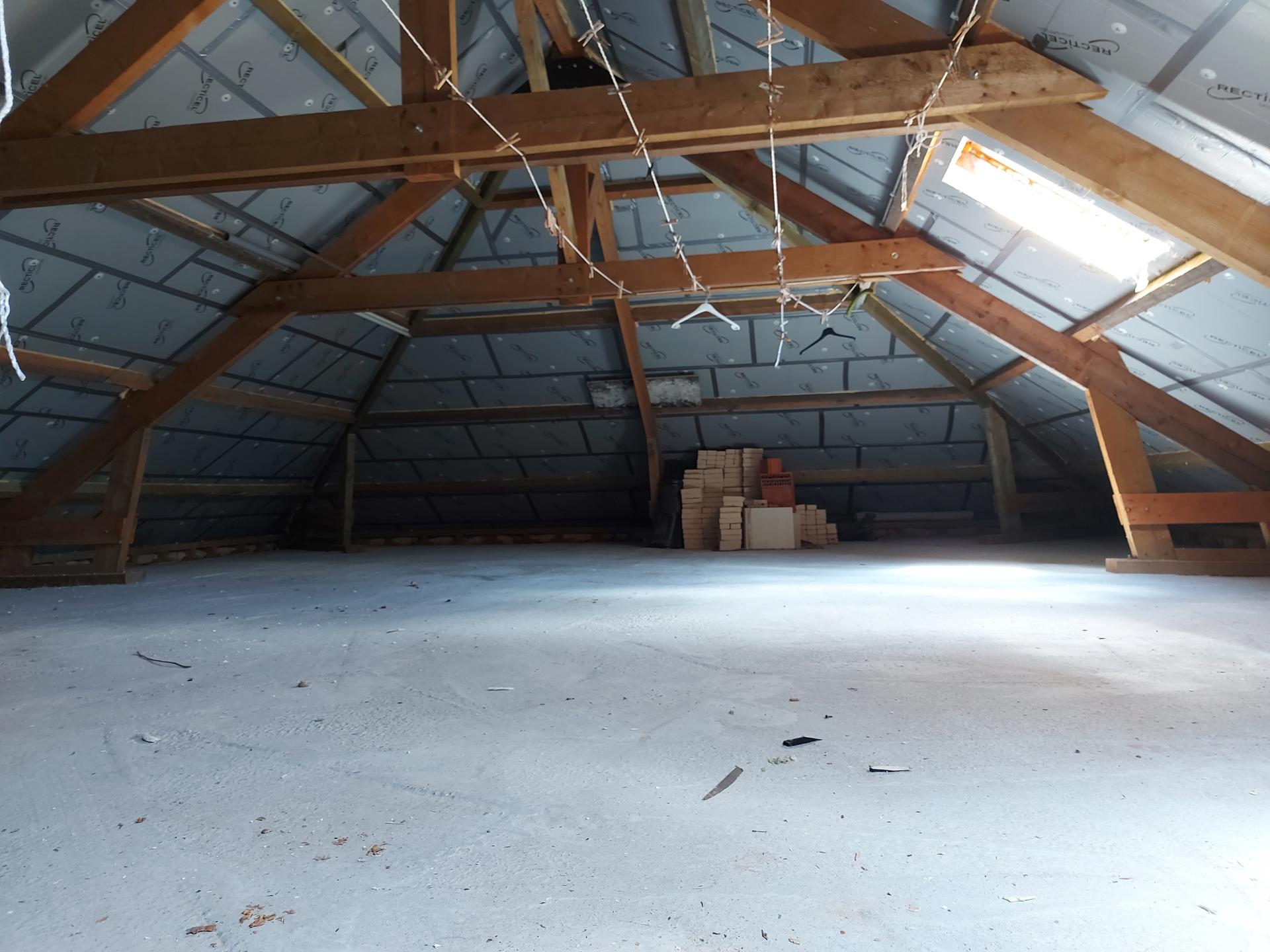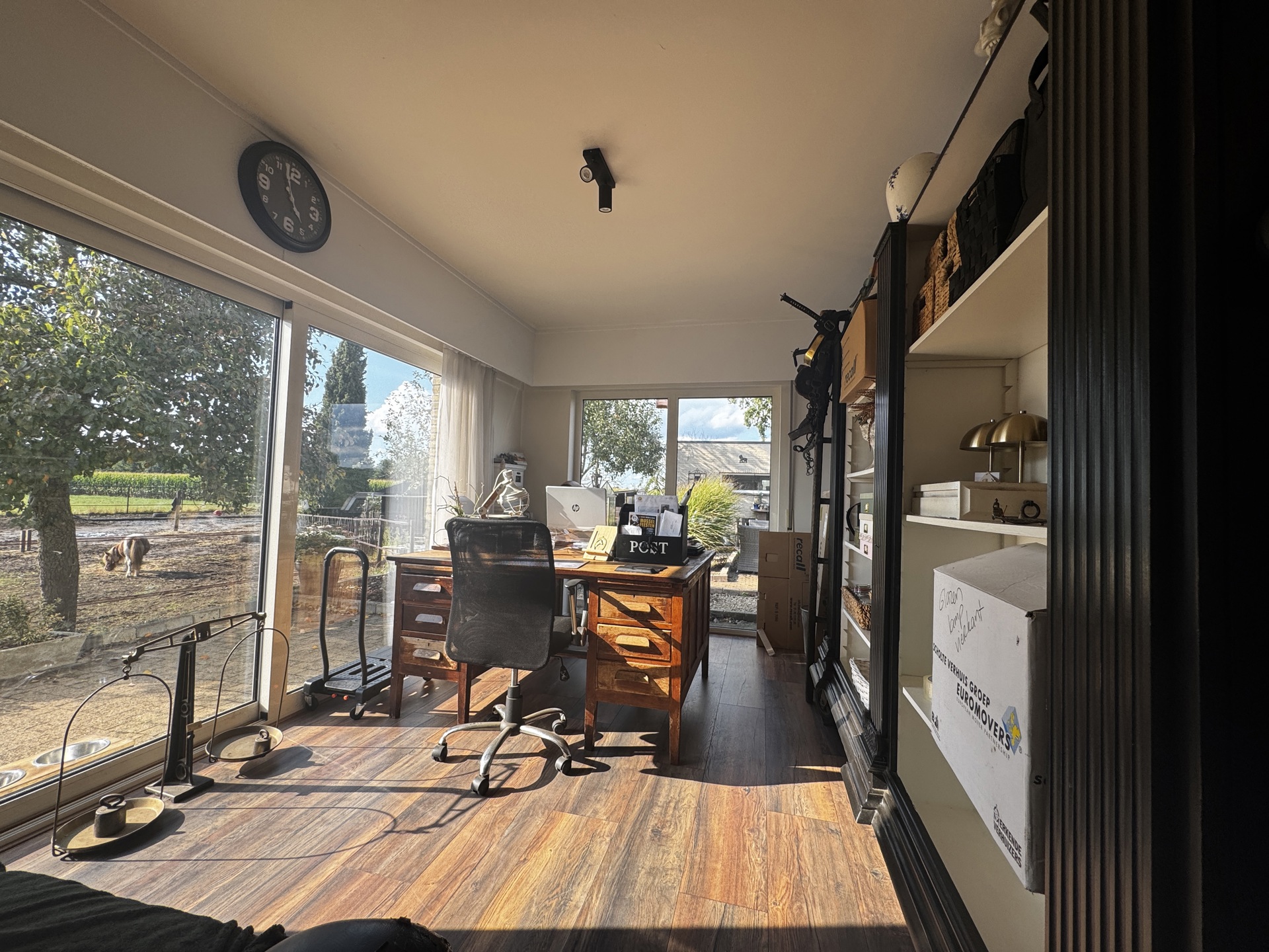 Indeling: inkomhal, inpandige garage, woonkamer, keuken, polyvalente kamer, nachthal, dressing, 2 slaapkamers, badkamer, zolder, uitpandige garage, terras, tuin, tuinhuis en weiland.