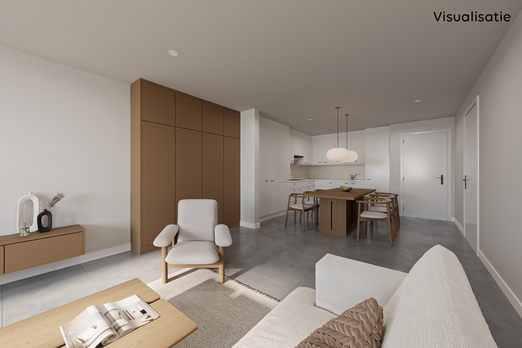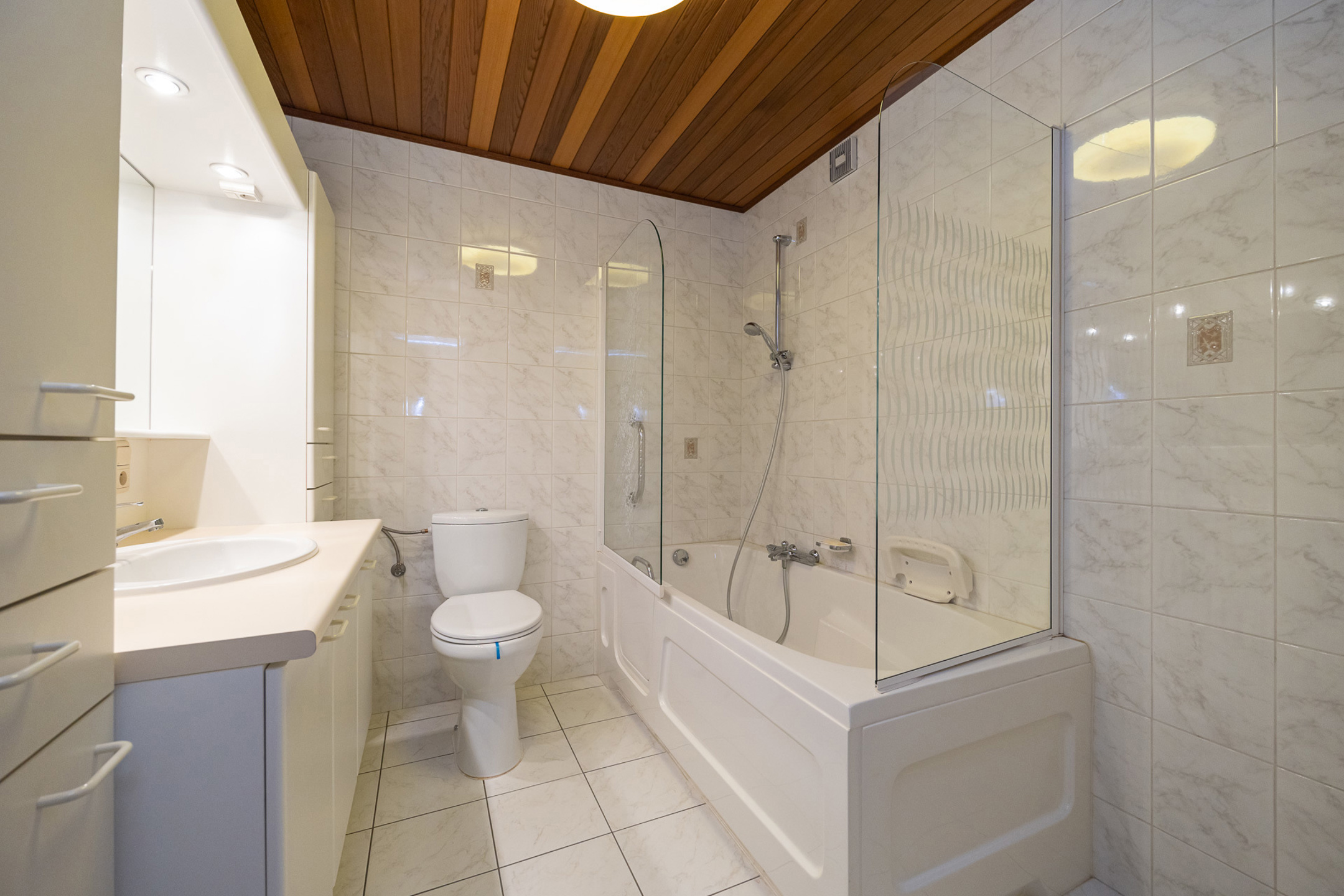 Omschrijving: we betreden het appartement via de inkomhal met apart gastentoilet. Deze geeft uit op de ruime leefruimte met open keuken waar plaats is voor zowel een zit- als een eethoek. De keuken is uitgerust met een ingebouwde ijskast en diepvries, elektrisch vuur met dampkap en een dubbele spoelbak. Tegenover de keuken hebben we een ruime berging waar aansluiting voor wasmachine en droogkast voorzien is. Hiernaast ligt de badkamer welke voorzien is van een groot lavabomeubel met veel opbergruimte, toilet en een bad in douche, welke beschikt over een poortje waardoor u hier zonder moeite in kan stappen!