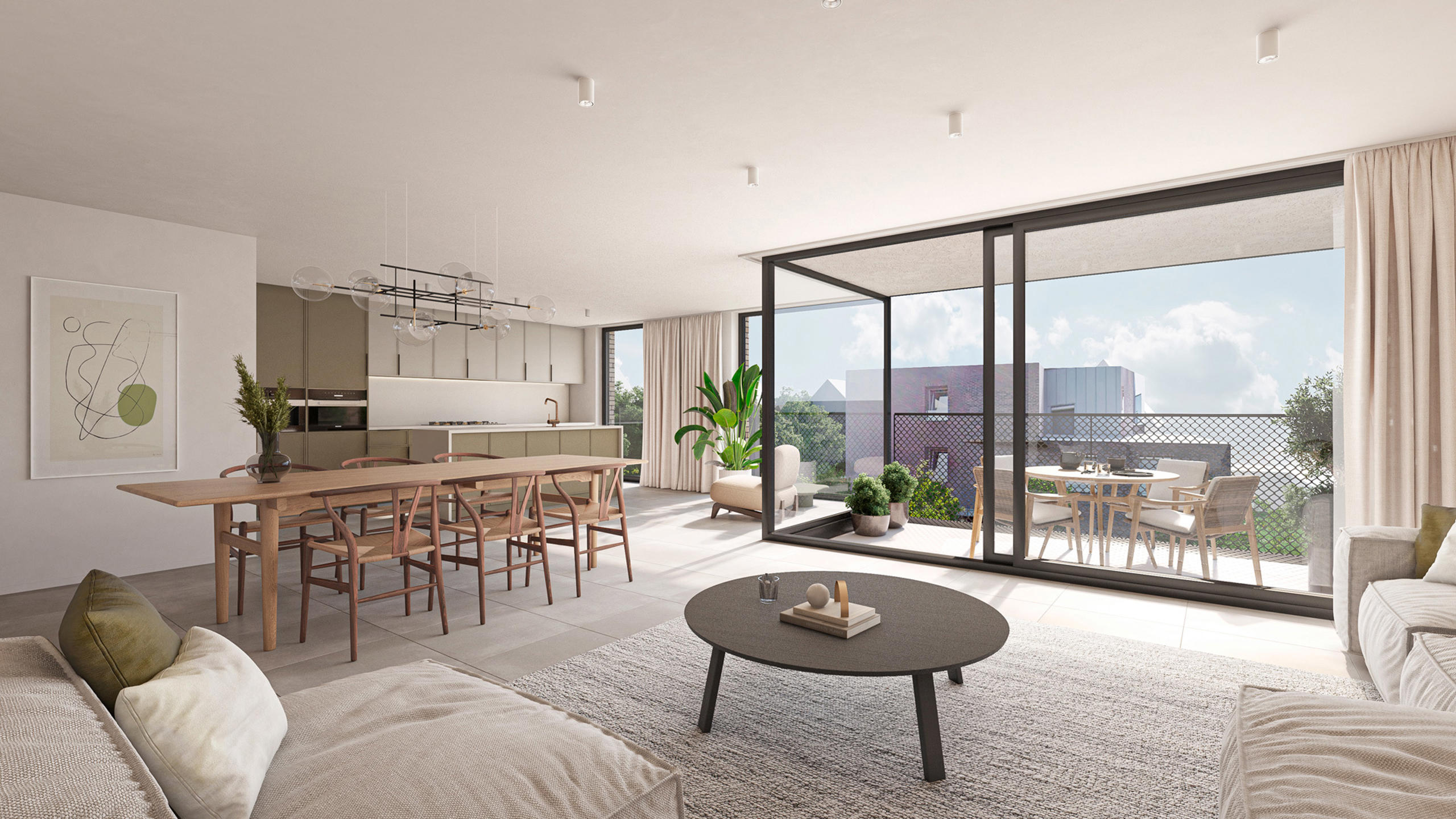 Appartement A3.2 bevindt zich op de derde verdieping en heeft een oppervlakte van 103m². Het beschikt over een open ingerichte keuken, 2 slaapkamers en een ruim terras van 16m².