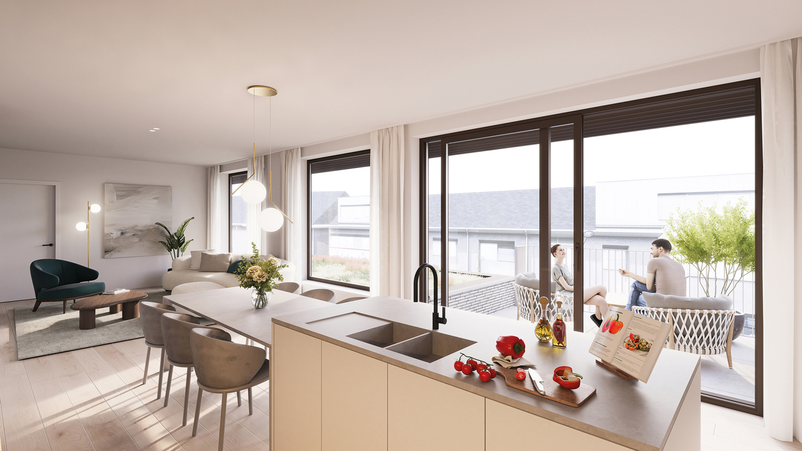 Appartement A0.3 bevindt zich op het gelijkvloers en heeft een oppervlakte van 169,06 m². Het beschikt over een open ingerichte keuken, 3 slaapkamers, een terras van 13,5 m² en een tuin van 101,35 m².