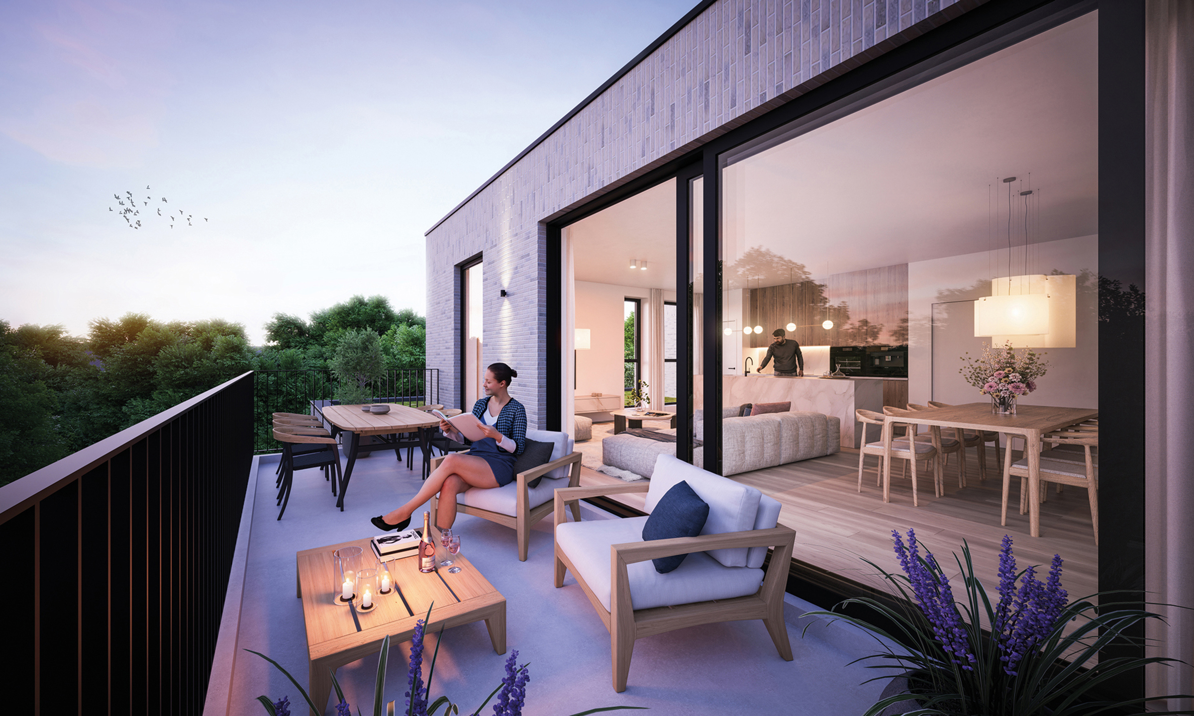 Appartement D.2.1 bevindt zich op de tweede verdieping in gebouw D. De penthouse heeft een oppervlakte van 136m². Het beschikt over een open ingerichte keuken, 3 slaapkamers en drie terrassen.