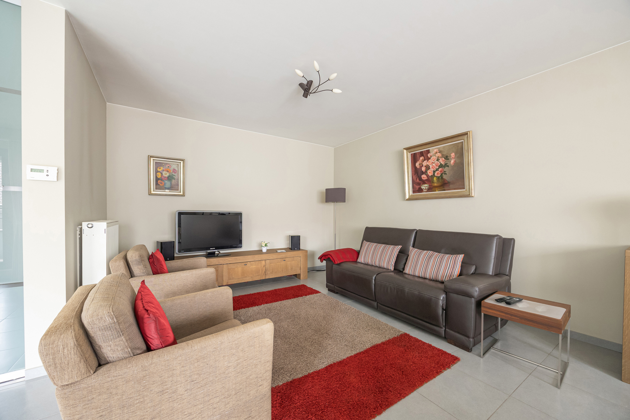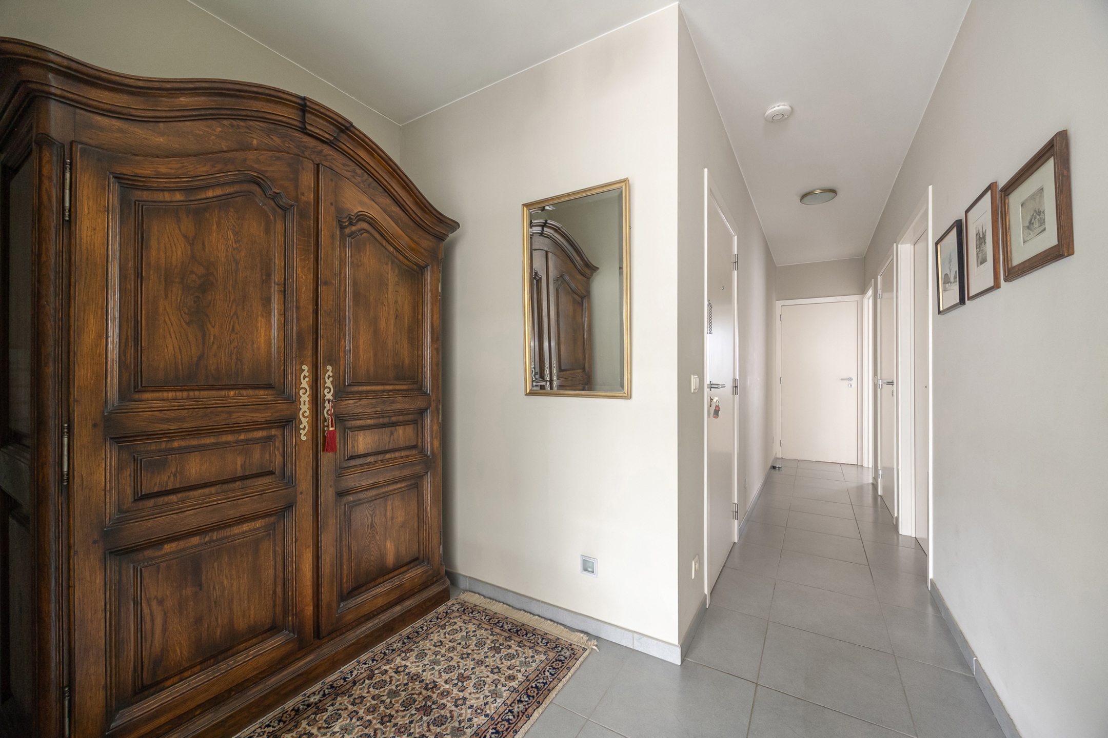 Bij het betreden van het appartement komt u in de inkomhal, waar aan de rechterzijde een handige nis voorzien is voor een vestiairekast. Via een grote glazen deur bereikt u de lichtrijke leefruimte met twee grote raampartijen die zorgen voor een aangename natuurlijke lichtinval. Aansluitend bevinden zich de eetkamer en de volledig uitgeruste keuken met gasvuur, dampkap, dubbele spoelbak, vaatwasser, oven, microgolf en koelkast. Daarnaast is er voldoende kastruimte voorzien. Naast de keuken treft u nog een ruime berging, welke dienst doet als wasplaats en als voorraadkamer. Vanuit de keuken heeft u toegang tot een eerste terras van 7,26 m².