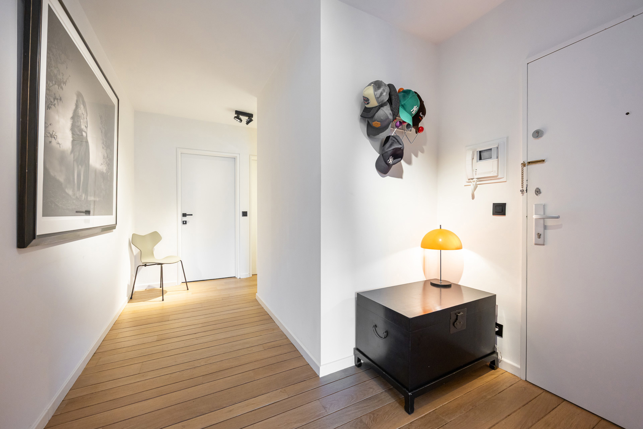 Benedenverdieping (verdieping 4): inkomhal met gastentoilet. Een erg lichte en ruime woonkamer afgewerkt met een eiken parketvloer en een open trap naar de duplexverdieping. Aansluitend een vernieuwd terras. Keuken met kastwerk en AEG toestellen. Achteraan treffen we 2 slaapkamers en een badkamer met badkamermeubel en ligbad.