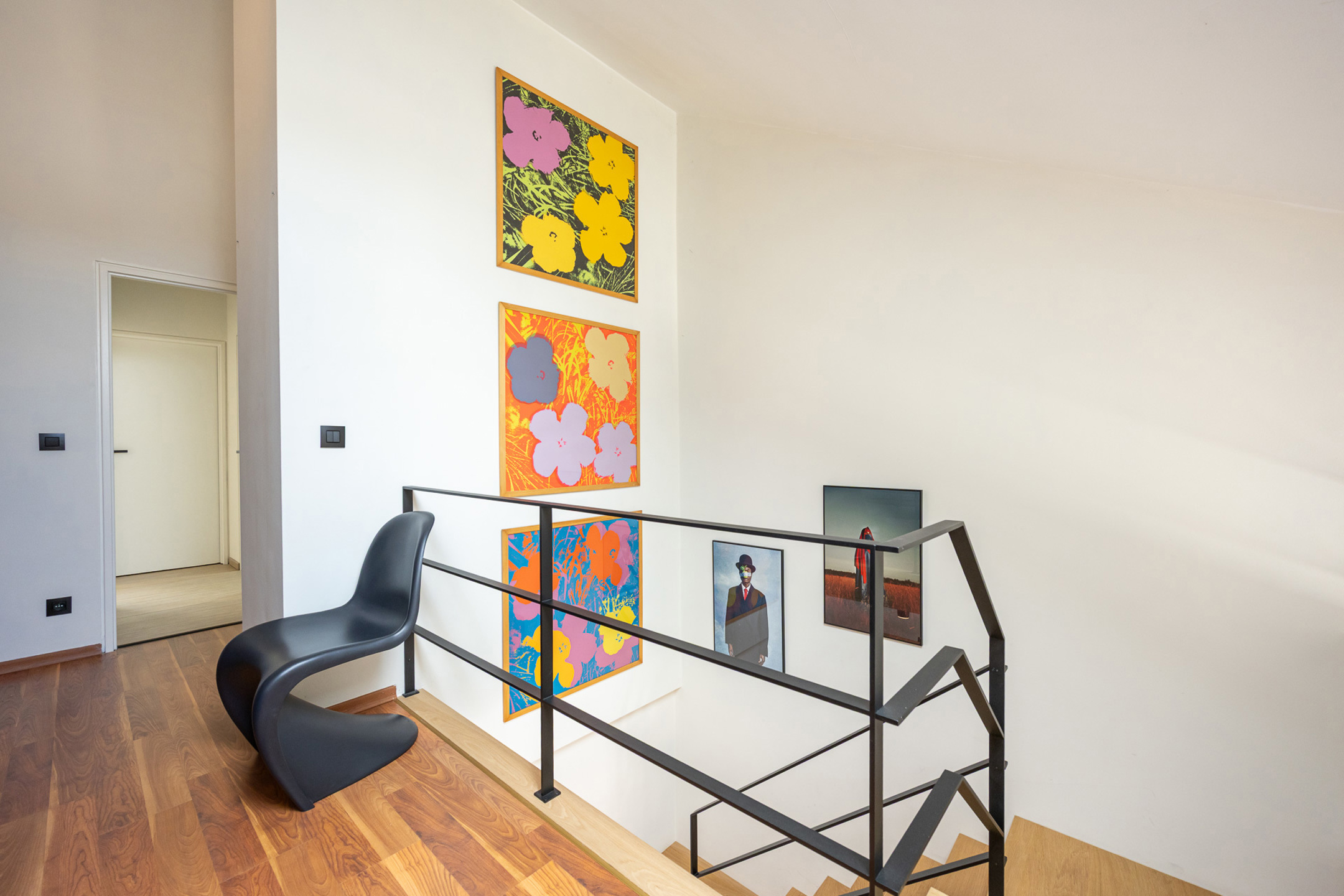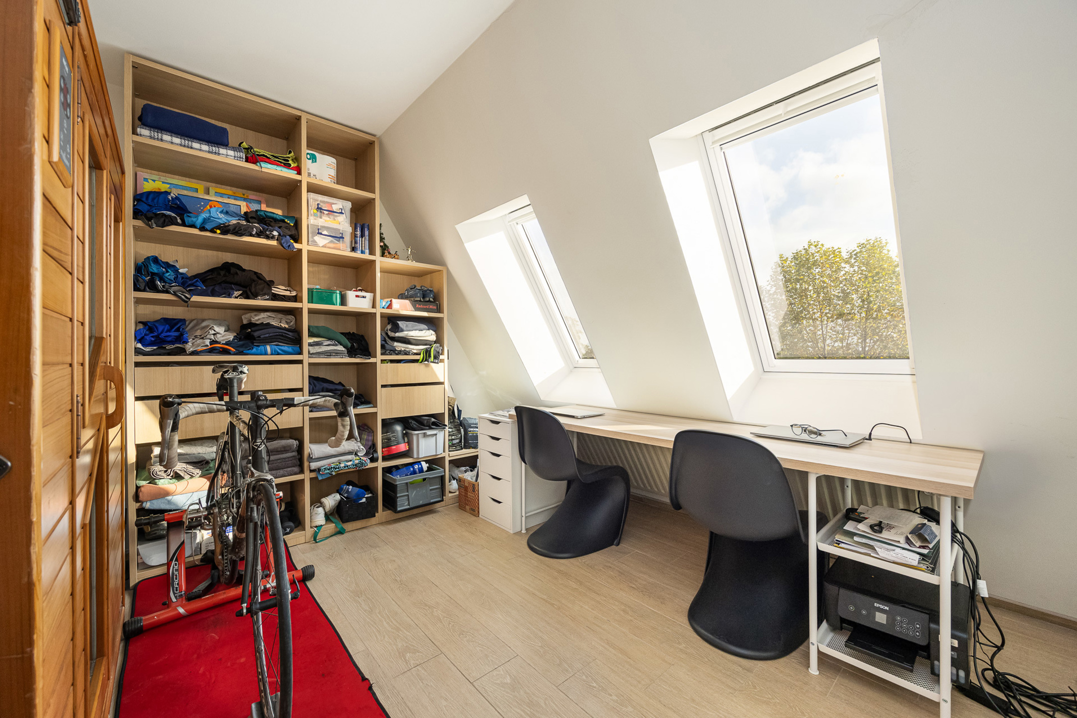 Bovenverdieping (verdieping 5): via de trap bereiken we de mezzanine met een gezellige zithoek/hobbyruimte. De mezzanine loopt over in de nachthal. Hier treffen we slaapkamer 3, de douchekamer en de wasplaats met berging.
