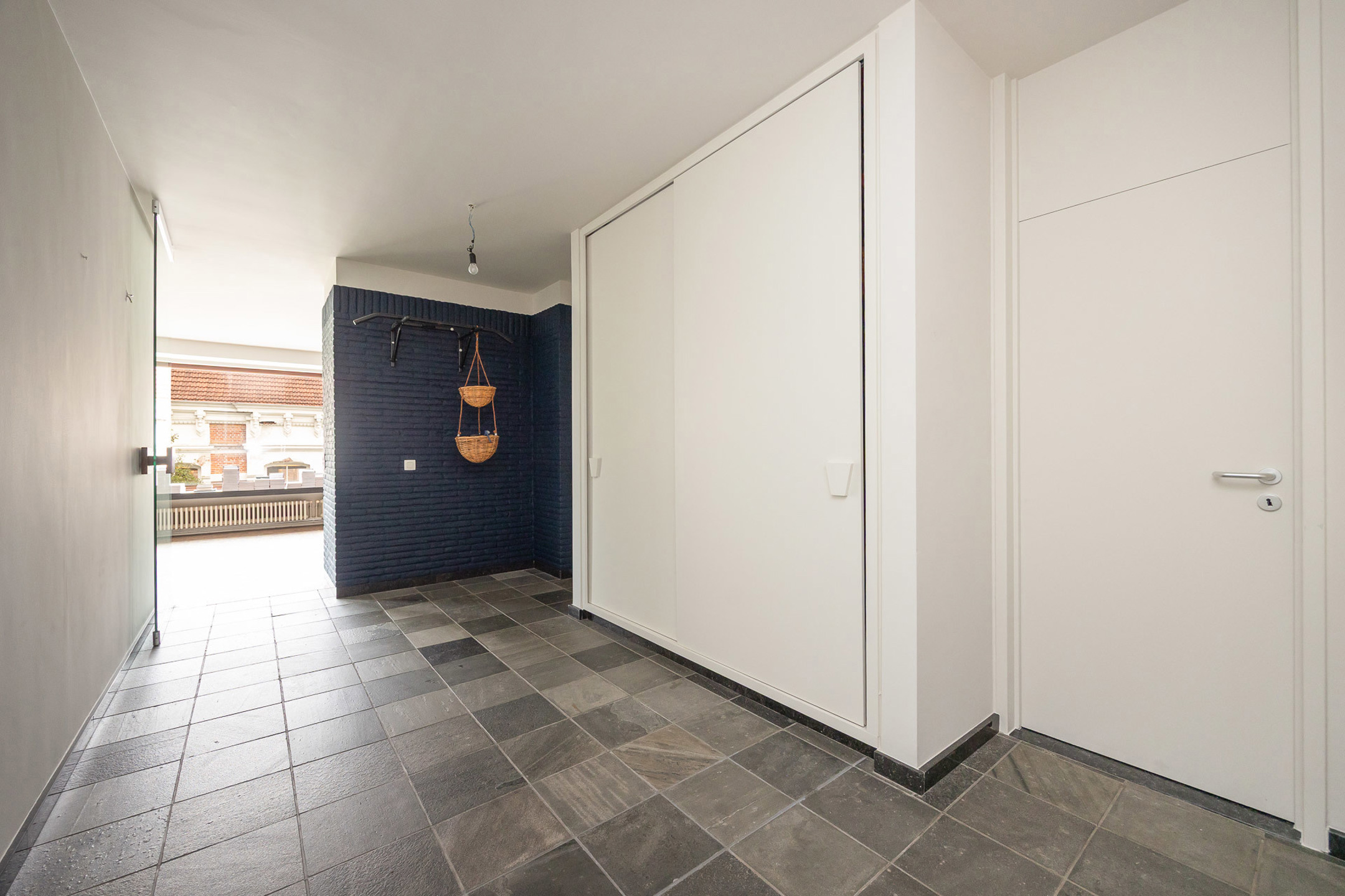 De tweepersoonslift geeft toegang tot de derde verdieping. Een ruime inkomhal met ingebouwde kast leidt via een glazen deur naar de woonkamer aan de voorzijde van het appartement. Grote ramen zorgen voor verrassend veel licht.