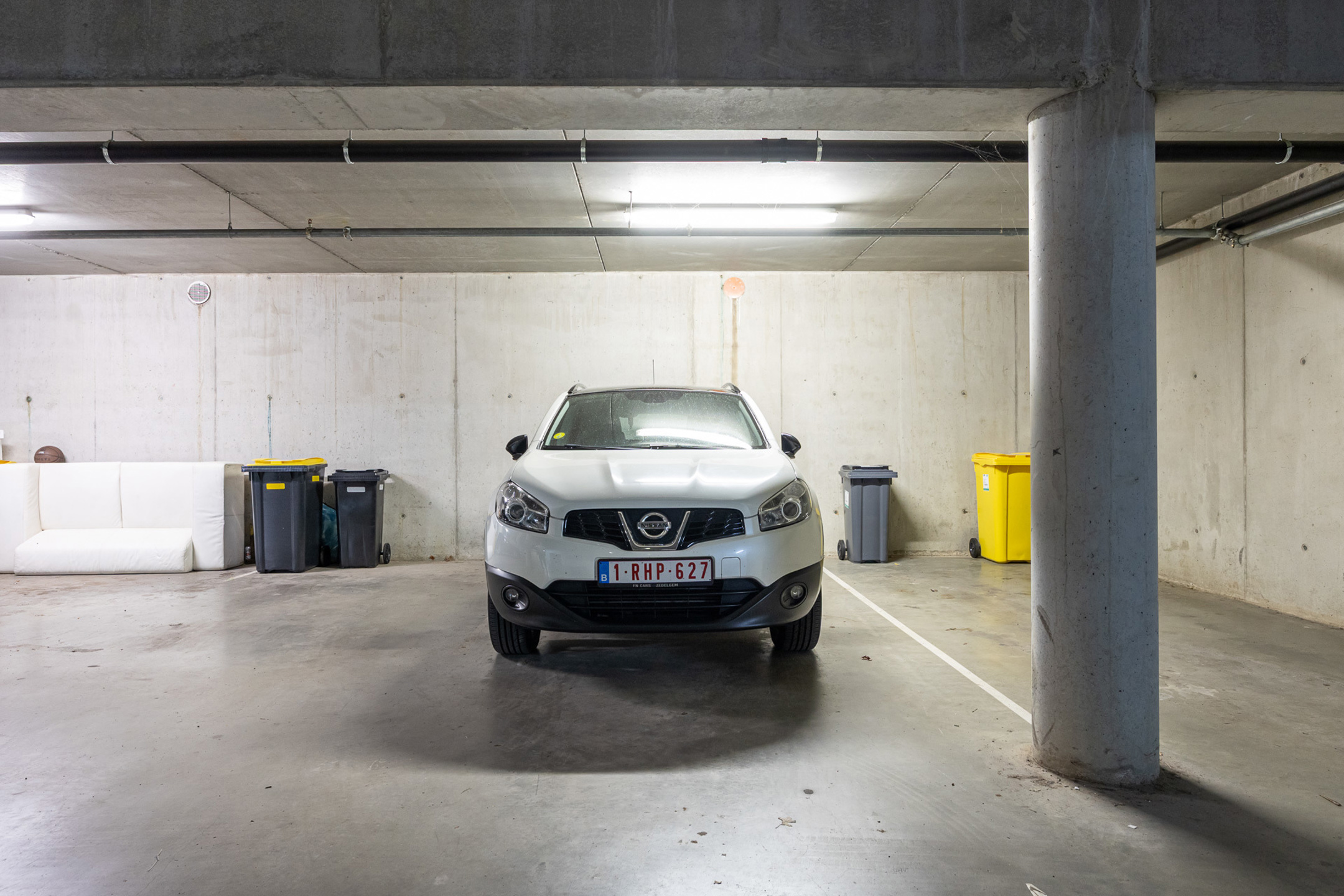 Buiten is er een overdekt terras, afgewerkt met een glazen balustrade. Deze zorgt ervoor dat het licht ongehinderd binnenvalt en u volop kunt genieten van de zon. Bij het appartement hoort een ondergrondse autostaanplaats en een private kelderberging, samen verplicht bij aan te kopen voor €25.000.