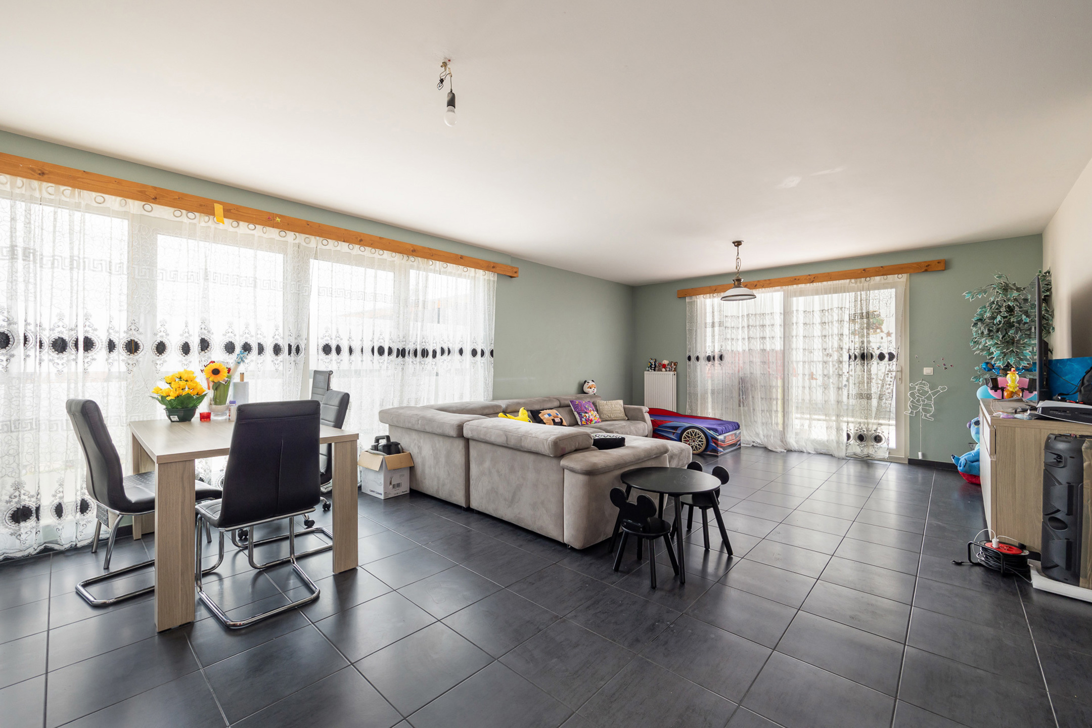 Dankzij de grote raampartijen aan twee zijden van de woonkamer geniet het appartement van veel natuurlijk licht. Via het schuifraam heeft u toegang tot het zuidgerichte terras van 30,45 m² – ideaal om van de zon te genieten.