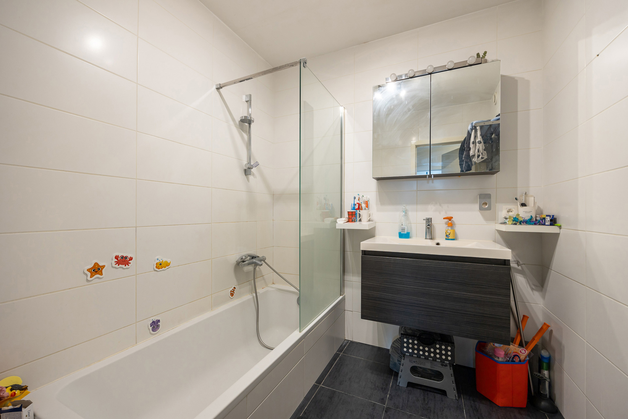 Dit appartement bevindt zich op de eerste verdieping en is bereikbaar via de trap of lift. U komt binnen via de inkomhal, die toegang biedt tot de badkamer, uitgerust met een douche in bad en een wastafel. Naast de badkamer bevindt zich een apart toilet.