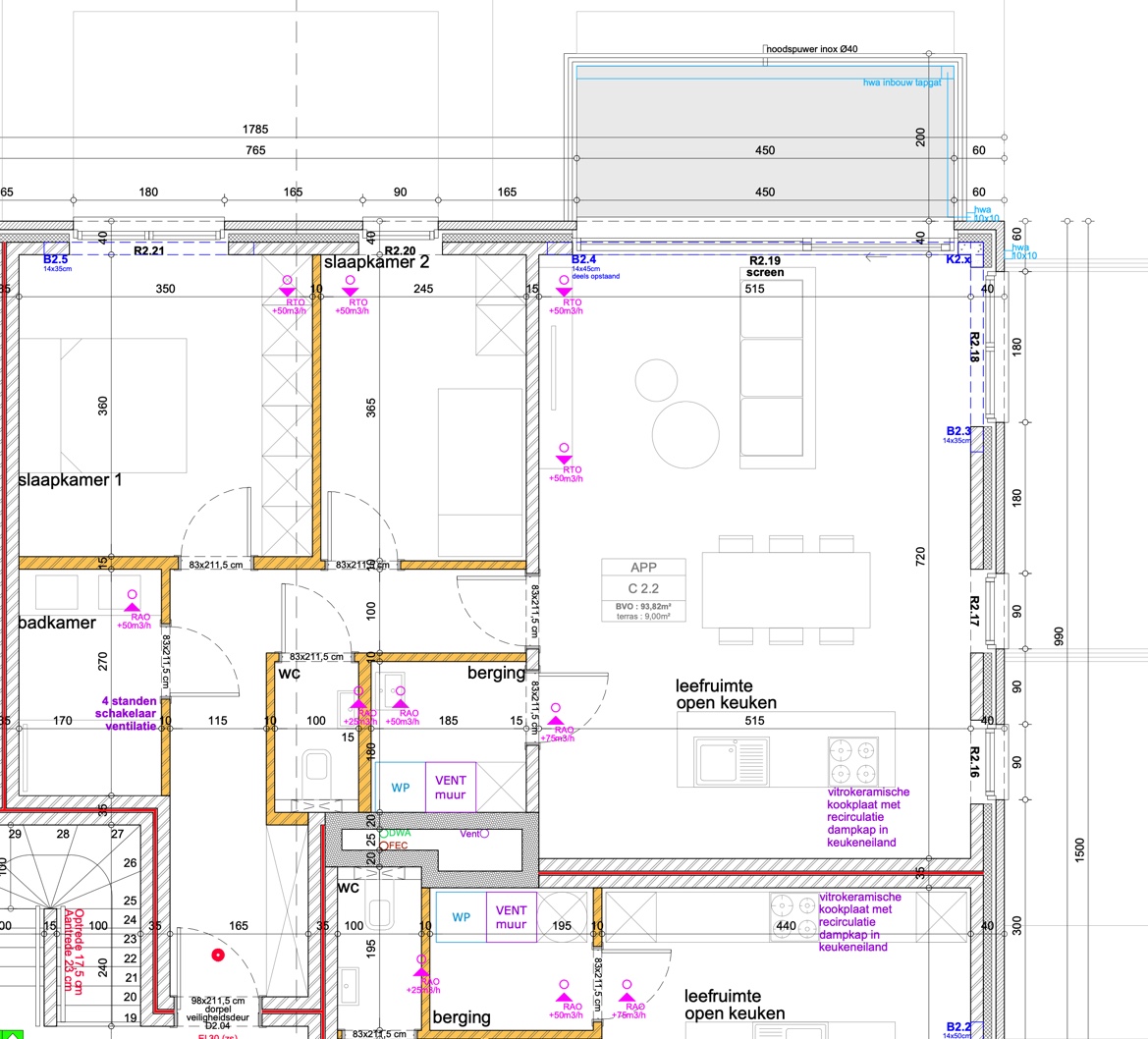 Indeling: inkomhal, woonkamer, keuken, keukenberging, toilet, badkamer, twee slaapkamers, terras, kelderberging, ondergrondse autostaanplaats, gemeenschappelijke fietsenberging en huisvuilberging