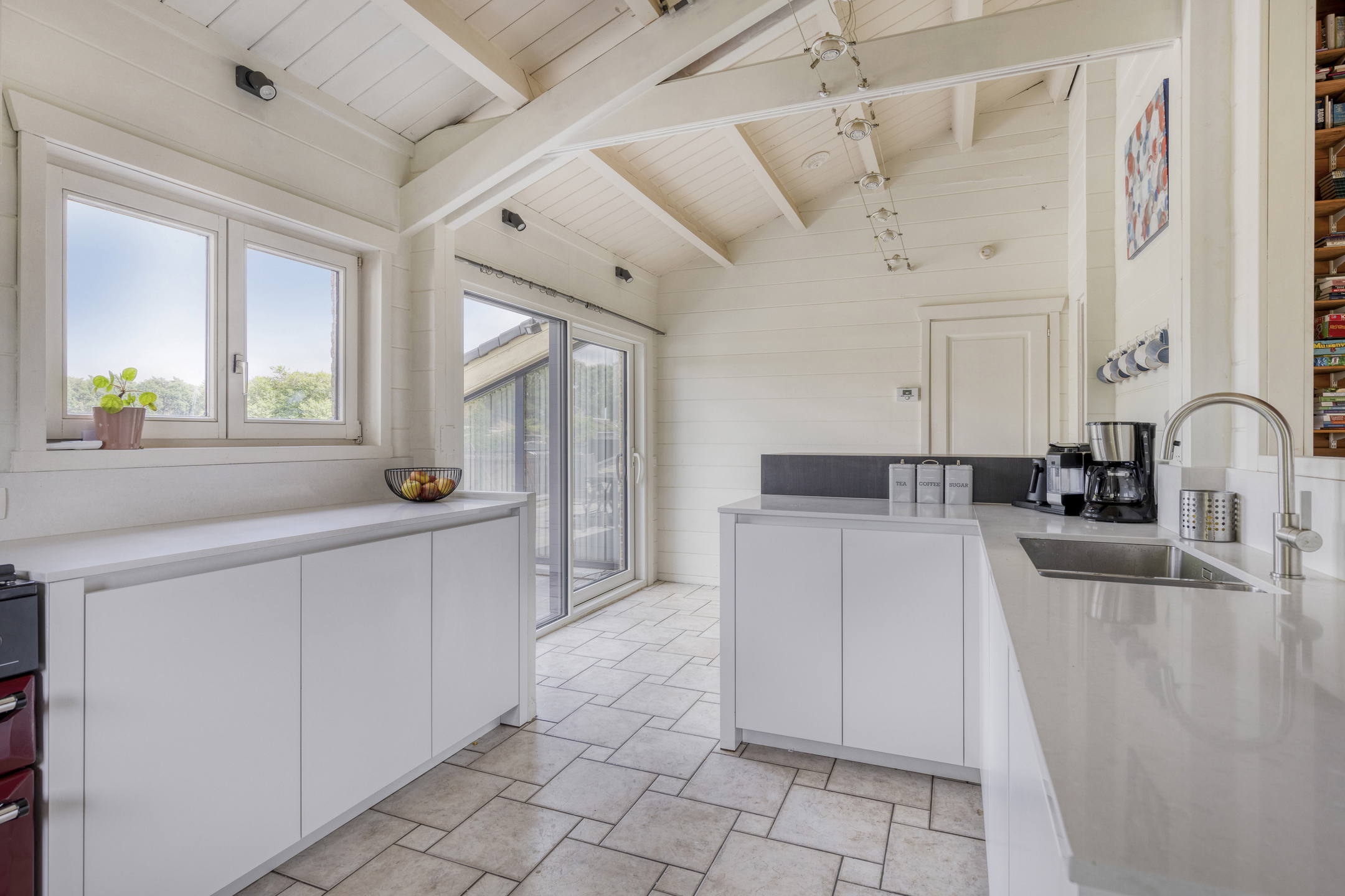 De leefruimte is ruim, lichtrijk en open tot in de nok. Dit alles in combinatie met de houtkachel zorgt voor een aangenaam ruimtegevoel. Aansluitend is er de halfopen keuken dewelke in 2022 geplaatst werd en volledig is uitgerust naar hedendaagse normen. Vanuit de keuken kijkt men uit over de tuin en is er via de schuifraam toegang naar het erg ruime terras.