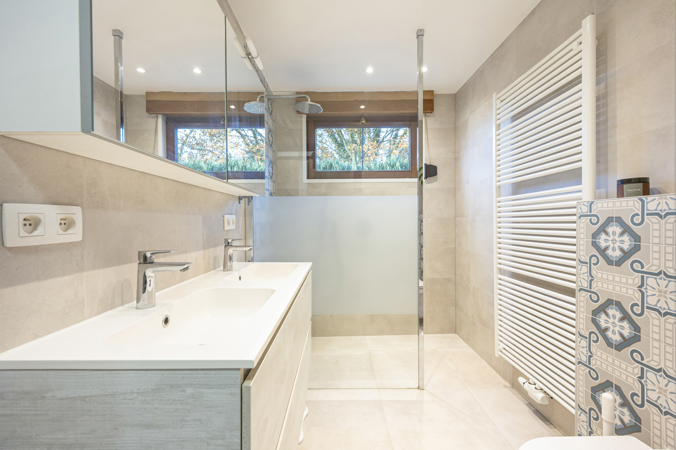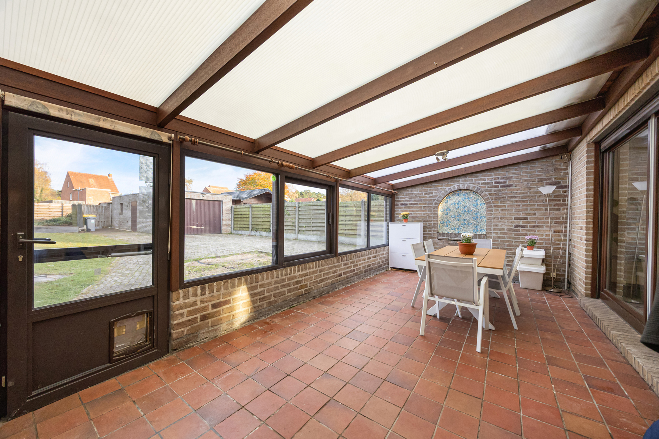 Buiten is de woning voorzien van een grote dubbele garage, een tuinhuis, een terras en een zwembad.