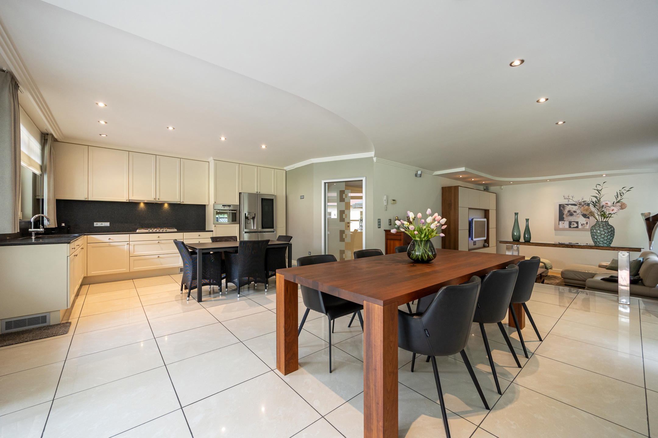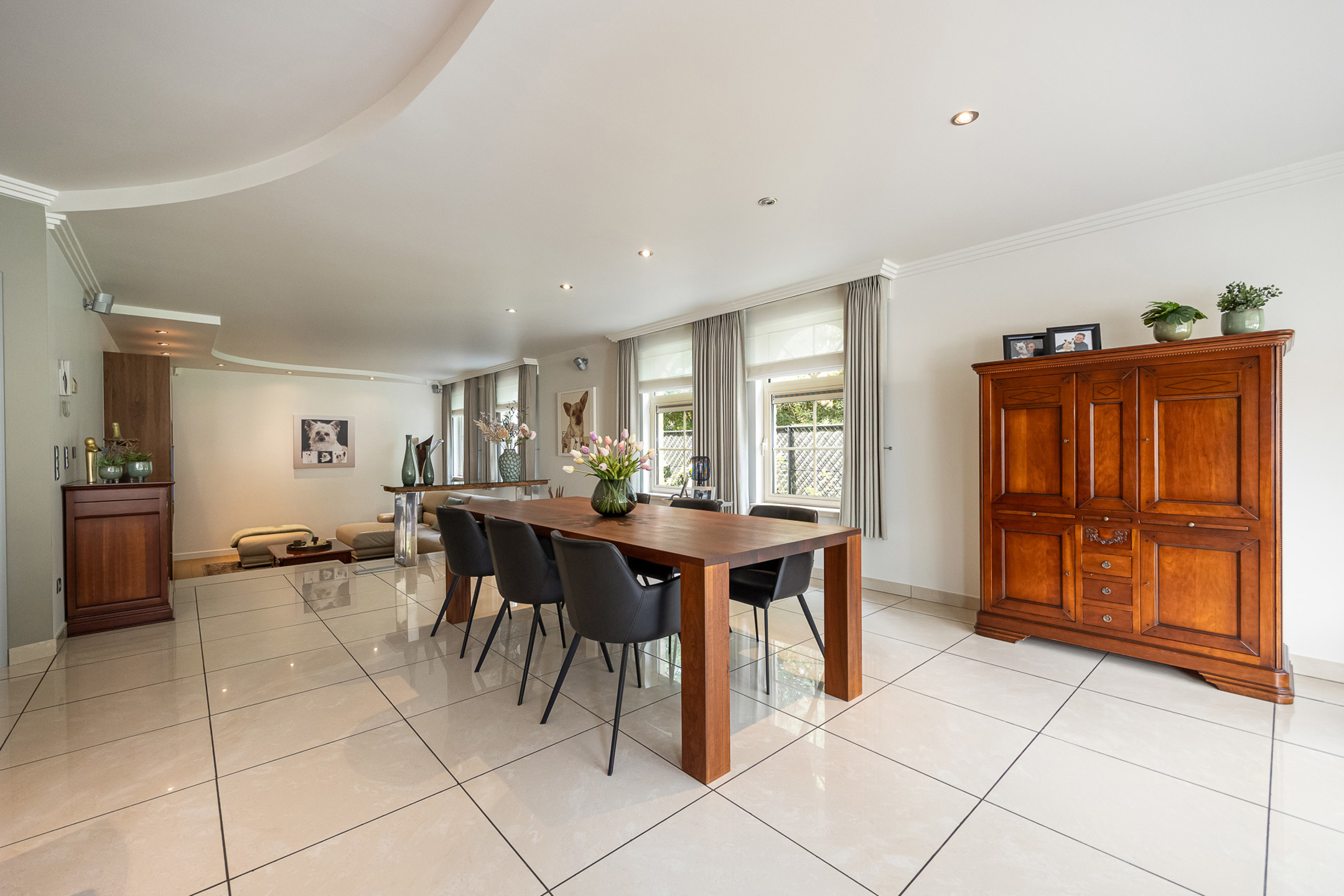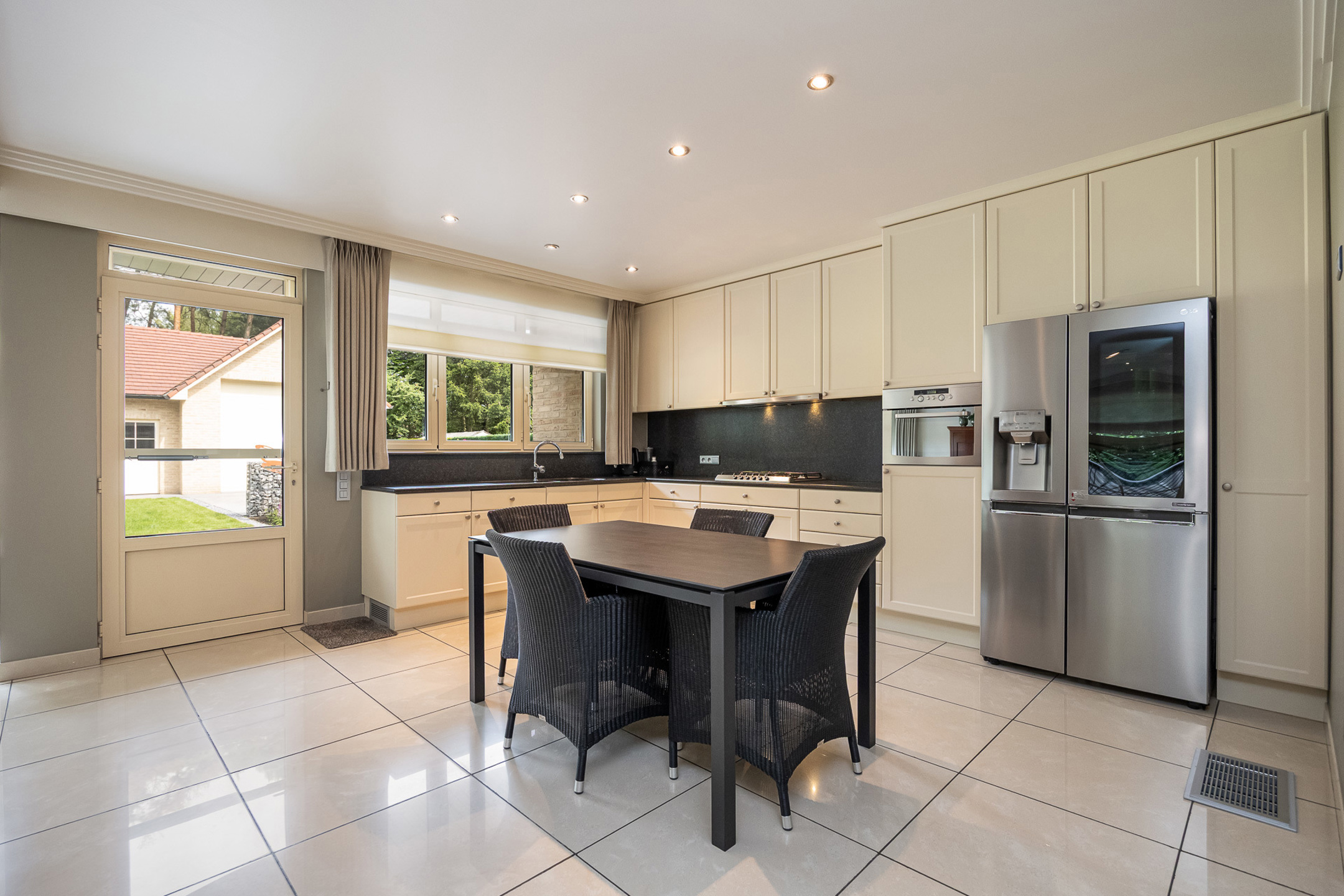 Beschrijving: Binnenkomen doet u in de ruime inkomhal met apart toilet. Als we doorlopen, komen we in de grote leefkeuken die voorzien is van alle comfort (alle toestellen van Miele en Smeg; kookvuur op gas, combi heteluchtoven met microgolf, vaatwasser, grote Amerikaanse ijskast) en zicht biedt op de tuin. Aansluitend bevindt zich de leefruimte die onderverdeeld is in een eetplaats en een zitput met een prachtige ingemaakt TV-meubel. Van zowel deze leefkeuken als de living hebt u zicht op het terras en de onderhoudsvriendelijke tuin die aangelegd is incl. beregening (diepteboring).