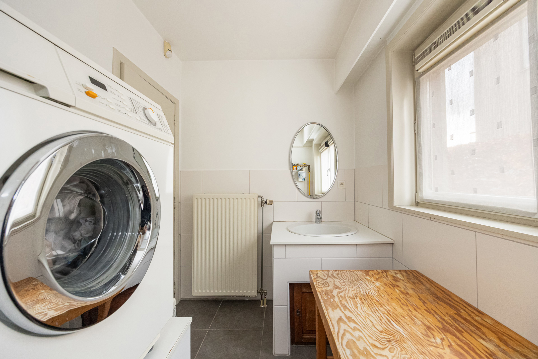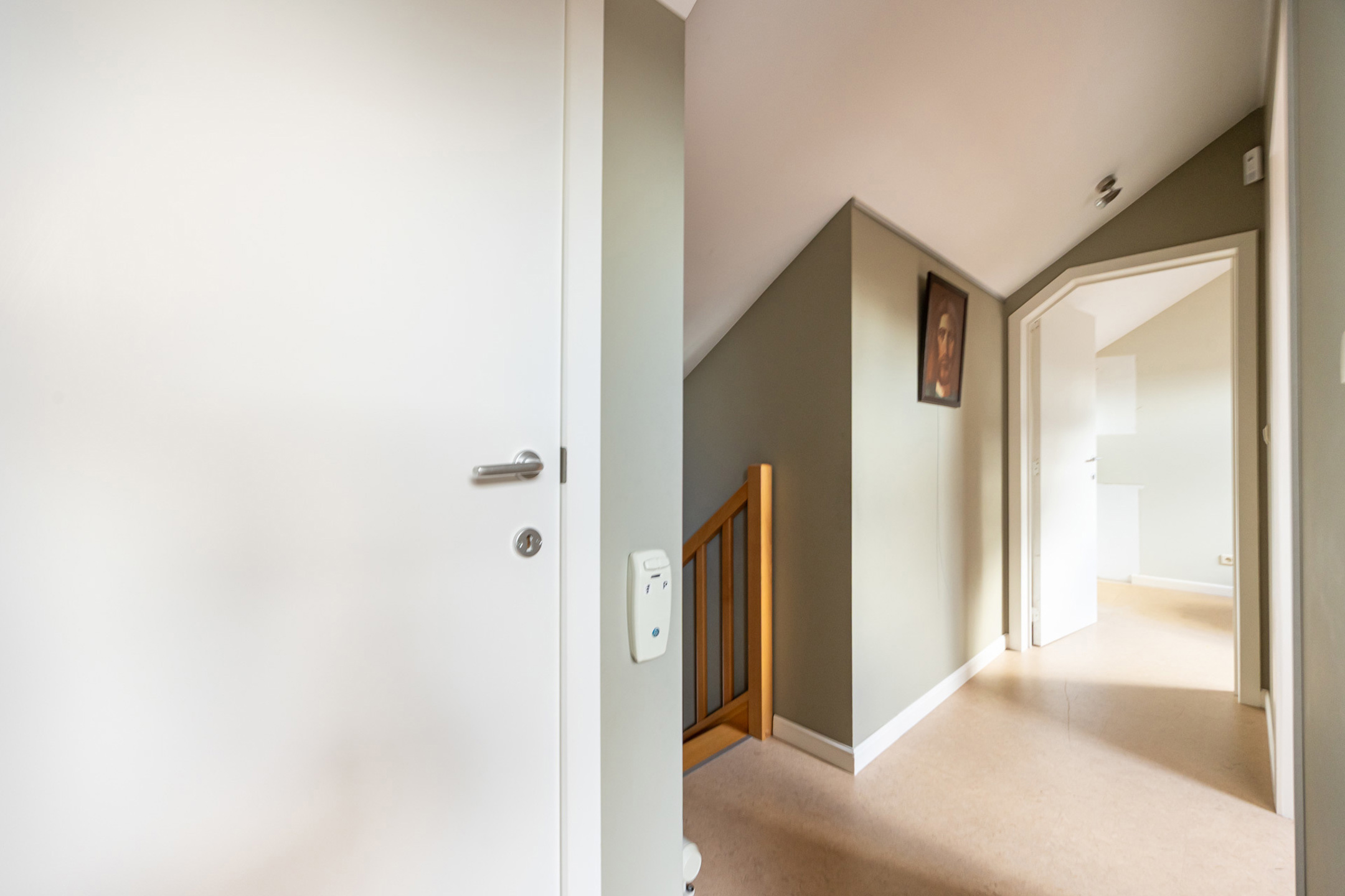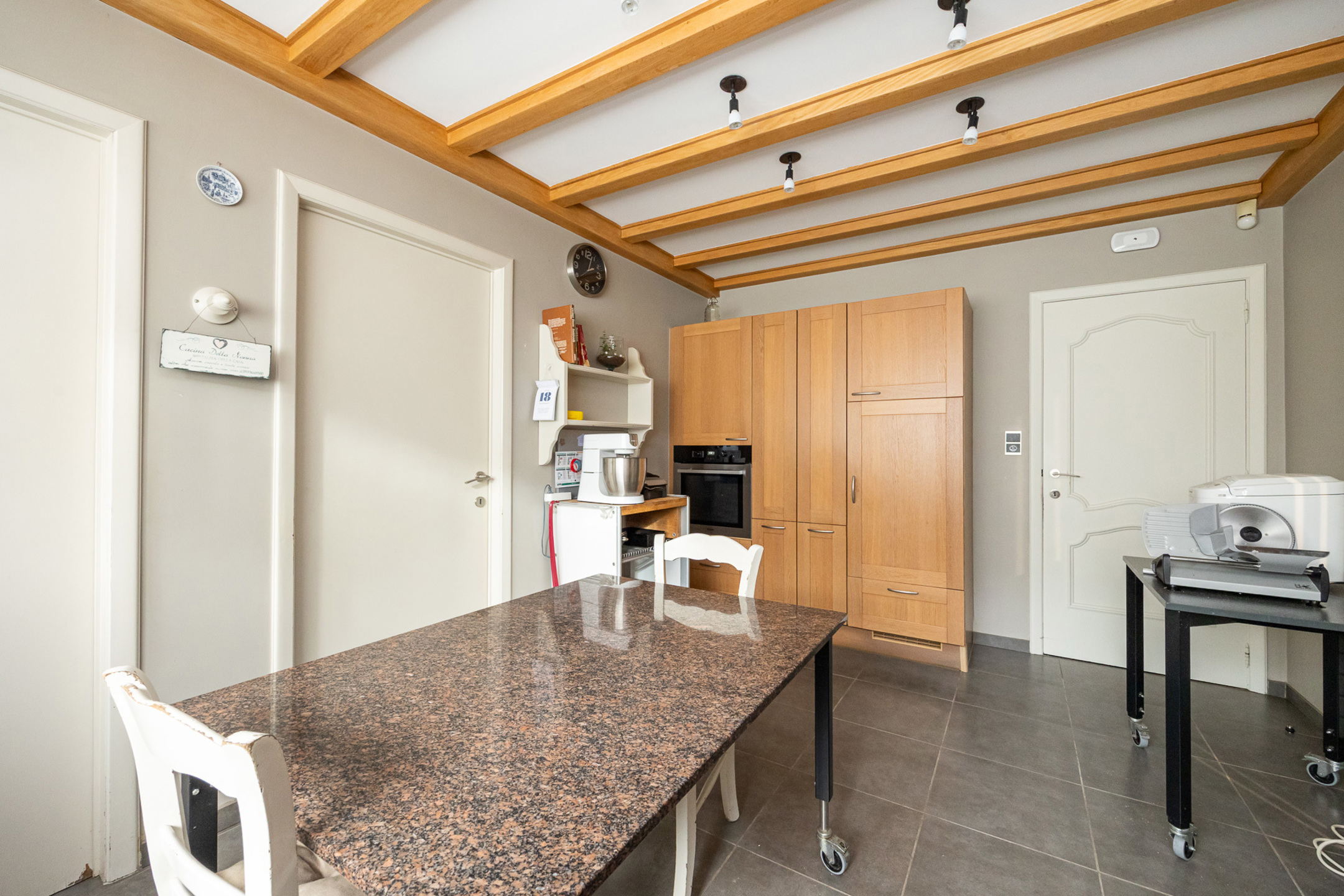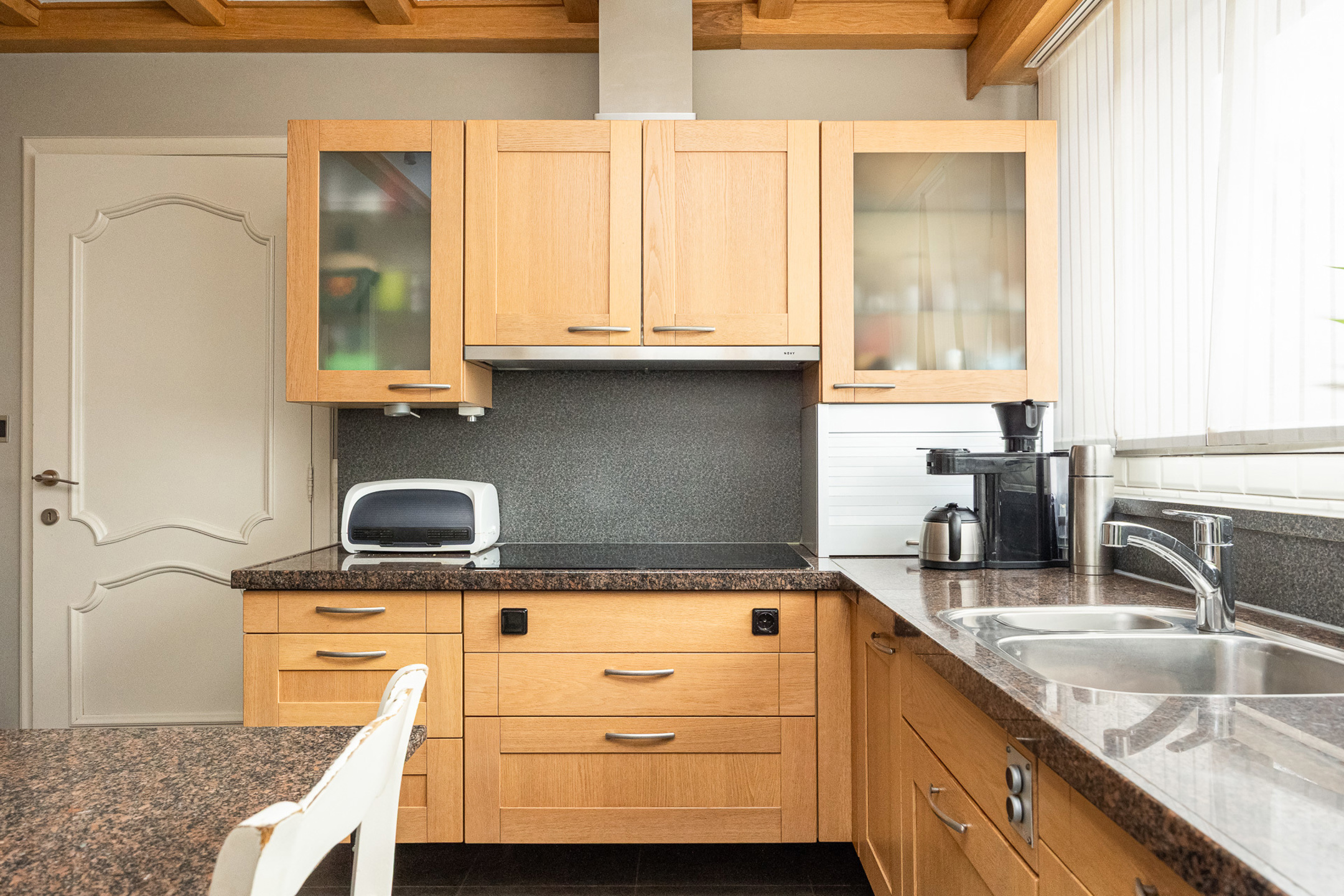 Aan de zijkant van de woning vinden we de inkomhal met gastentoilet en vestiaire. Als we doorlopen naar de achterzijde van de woning, komen we in de leefruimte met ingemaakte kasten, gashaard en aanpalende veranda. Door de grote raampartijen geniet men over de gehele woning veel lichtinval. Verder naar de keuken vinden we veel opbergruimte. Verder is deze geïnstalleerd met een inductie kookplaat, afzuigkap, wastafel, koelkast, vaatwasmachine en heteluchtoven. Bovendien is de volledige keuken in hoogte verstelbaar waardoor zowel groot als klein zich hier kan uitleven. Achter de keuken komt u aan de zijingang van de woning en vervolgens een berging met ingebouwde kasten.