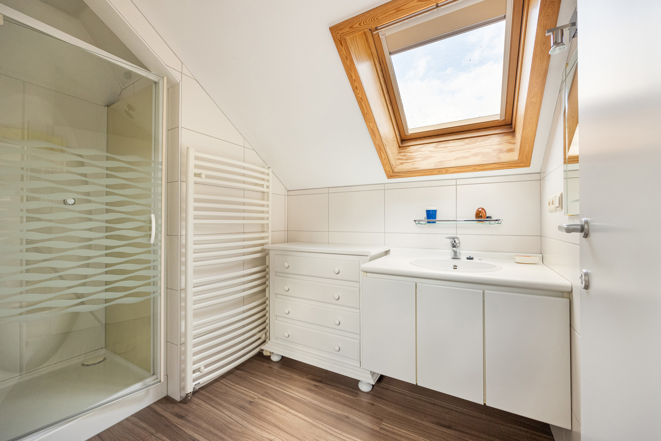 Terug via de centrale hal bereiken we de ruime badkamer en 2 slaapkamers. De badkamer is volledig betegeld en voorzien van een dubbele wastafel, een ligbad en douche.