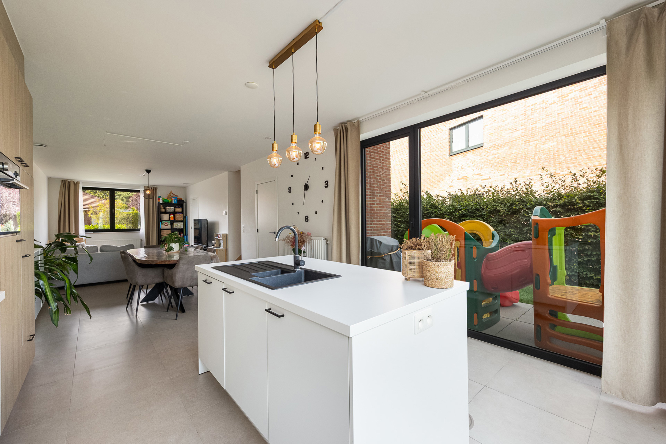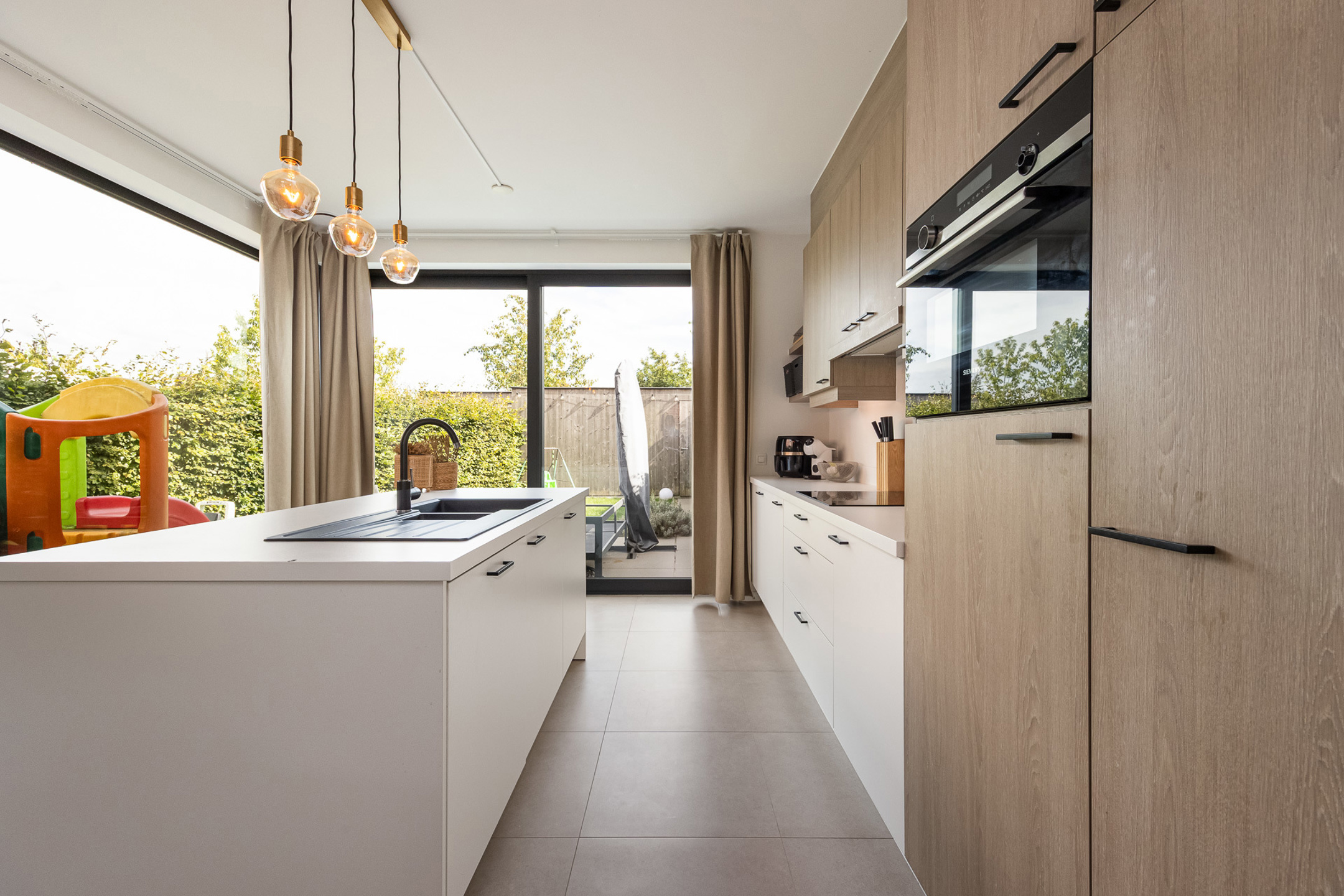 De moderne keuken geniet van veel natuurlijk licht dankzij de grote raampartijen en biedt een mooi uitzicht op de tuin. Ze is uitgerust met een keukeneiland, ruime werk- en opbergmogelijkheden, en kwalitatieve toestellen waaronder een inductiekookplaat, dampkap, combi-oven, vaatwasser, dubbele spoeltafel en koelkast. Aansluitend bevindt zich een praktische berging met rechtstreekse toegang tot de achtertuin.