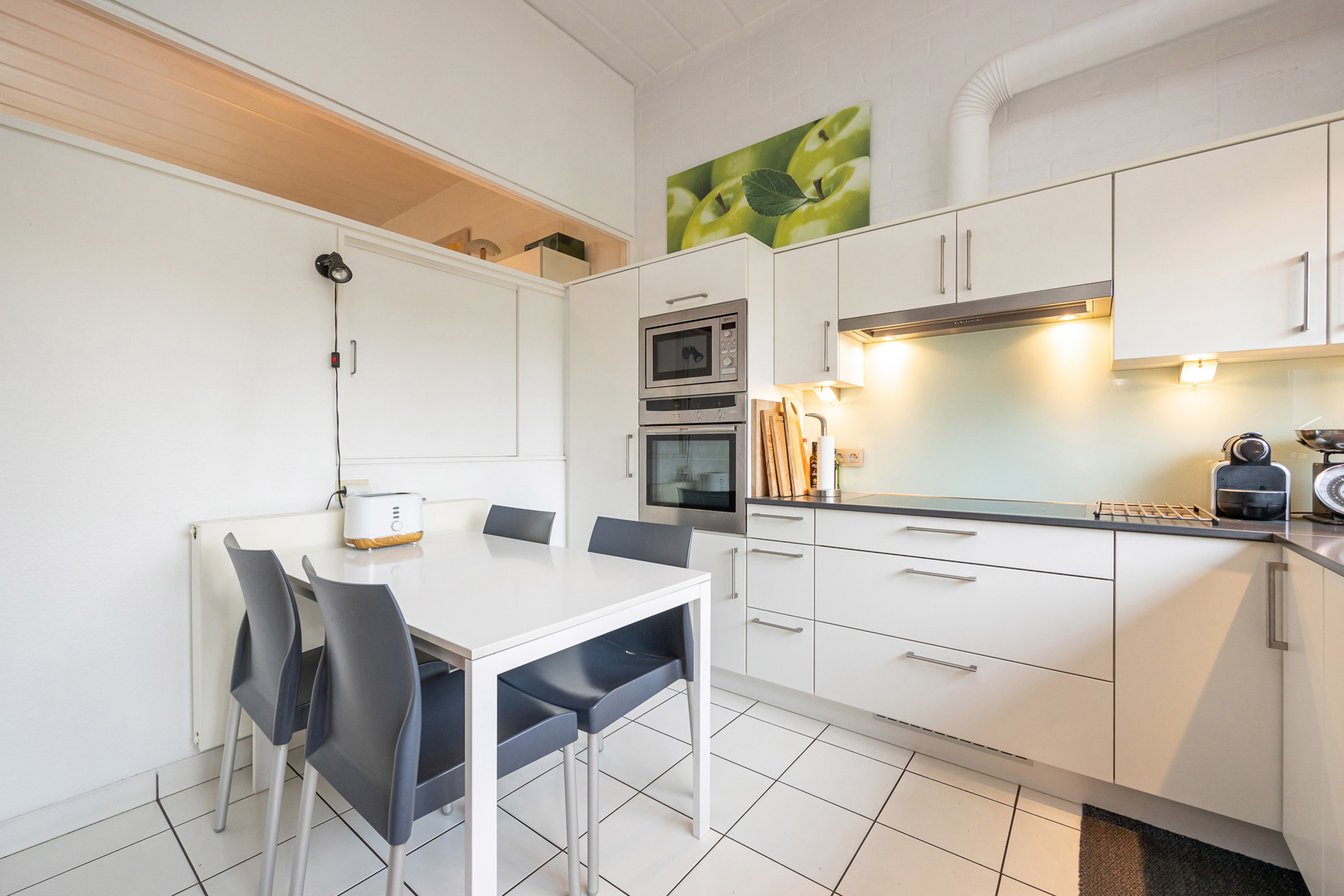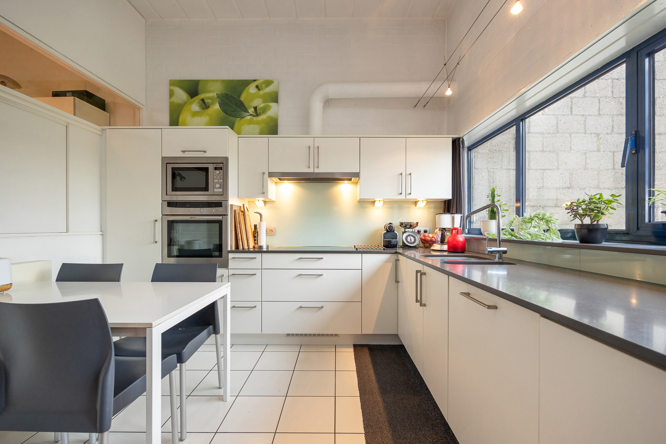 Via een kleine trap komt u in de leefruimte, waar de lichtstrook en het doorgeefluik zorgen voor een mooie connectie met de keuken.