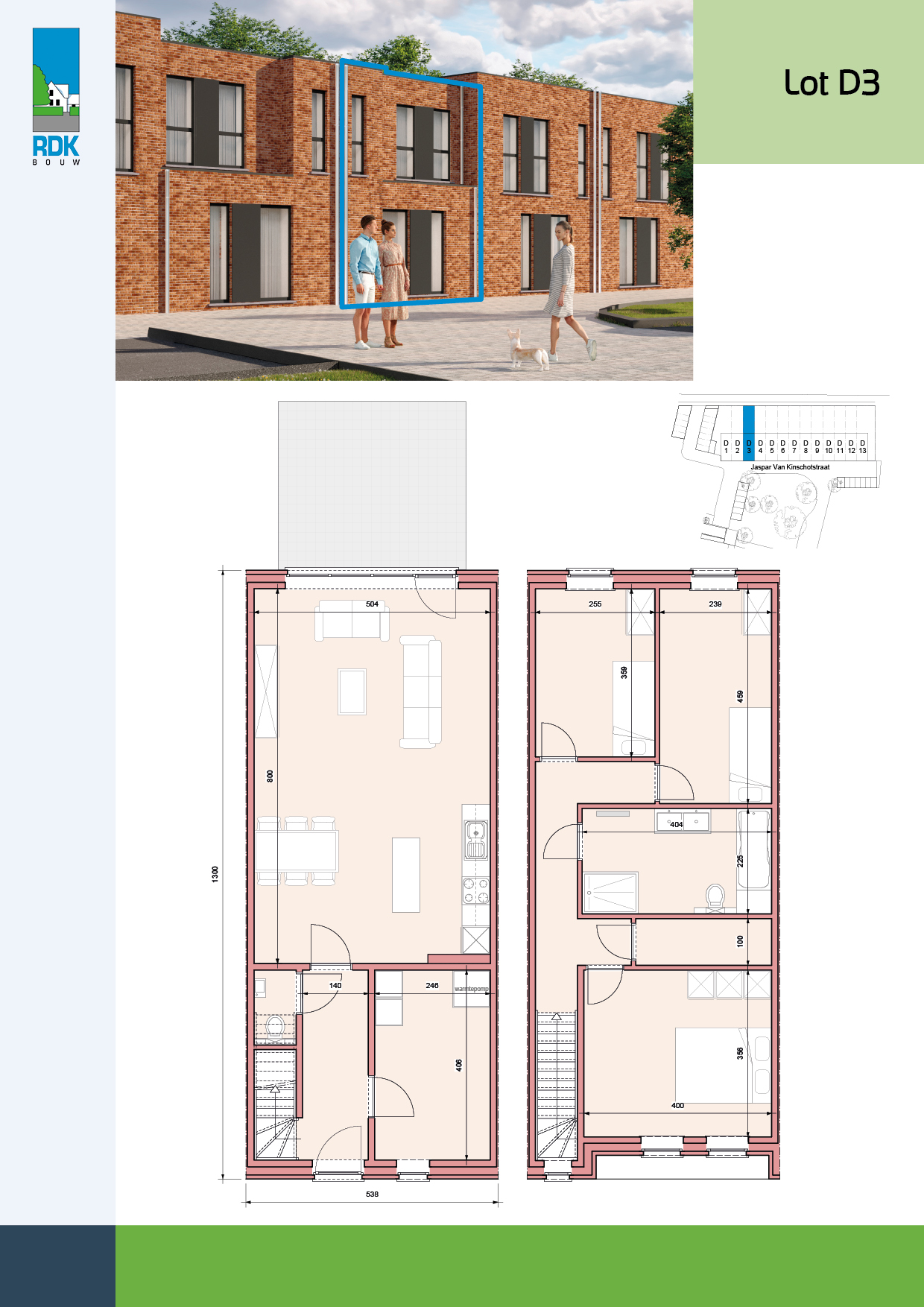 Woning 3 is een gesloten bebouwing met een bruto bewoonbare oppervlakte van 138 m². De woning beschikt over drie slaapkamers, woonkamer met open leefkeuken, berging, toilet, badkamer met ligbad, douche, dubbel lavabomeubel en toilet. Daarnaast is er een tuin met fietsenberging en privé-autostaanplaats onder carport.