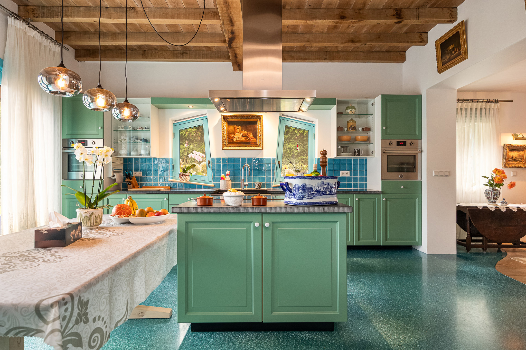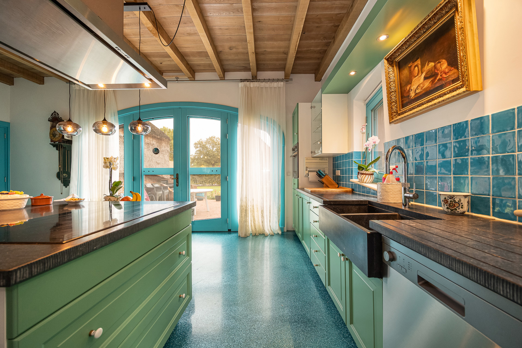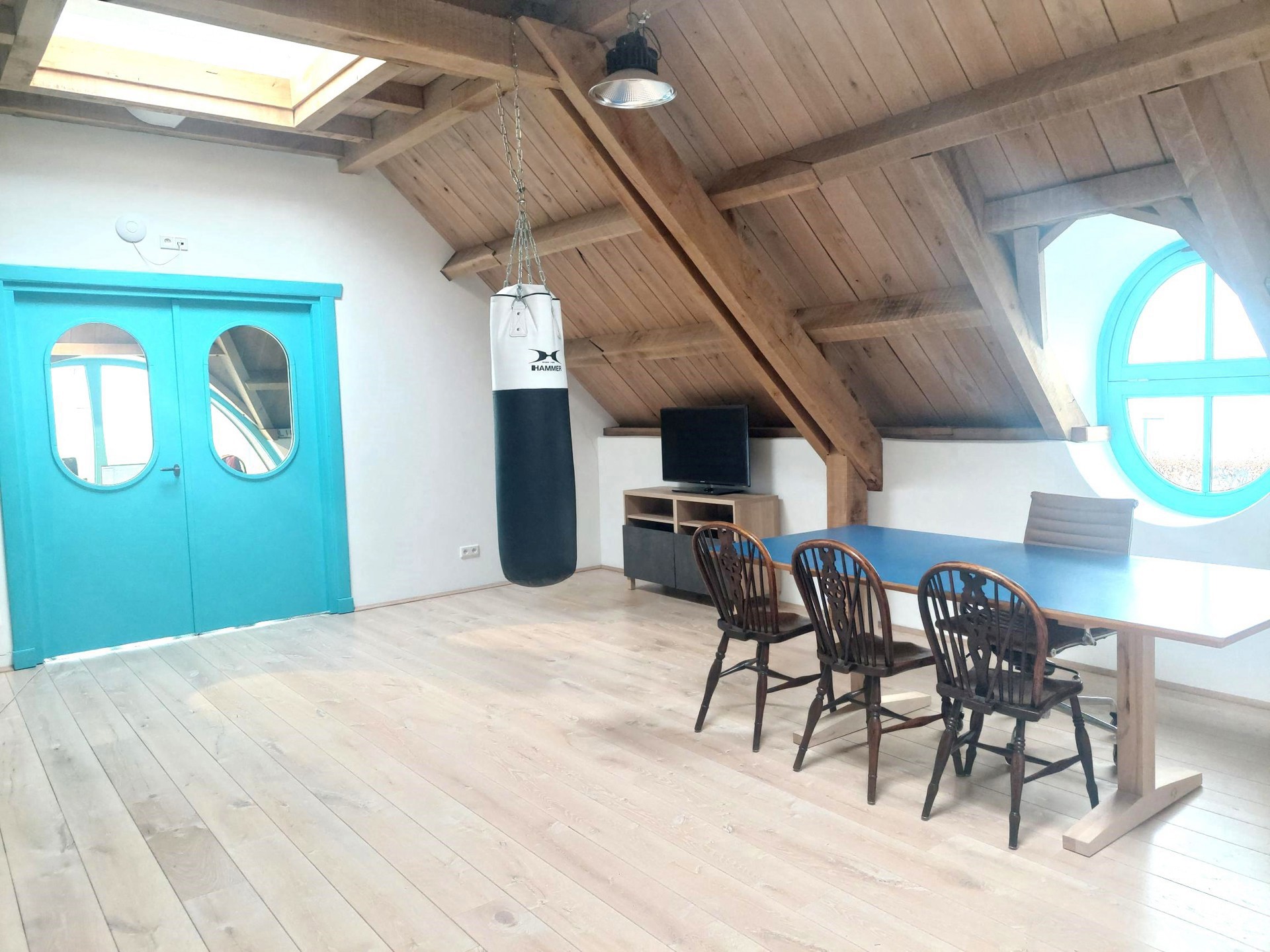 Indeling: Gelijkvloers: ruime woonkamer met open keuken, prachtige parket- en epoxyvloeren, veel lichtinval, badkamer met ligbad en wasplaats