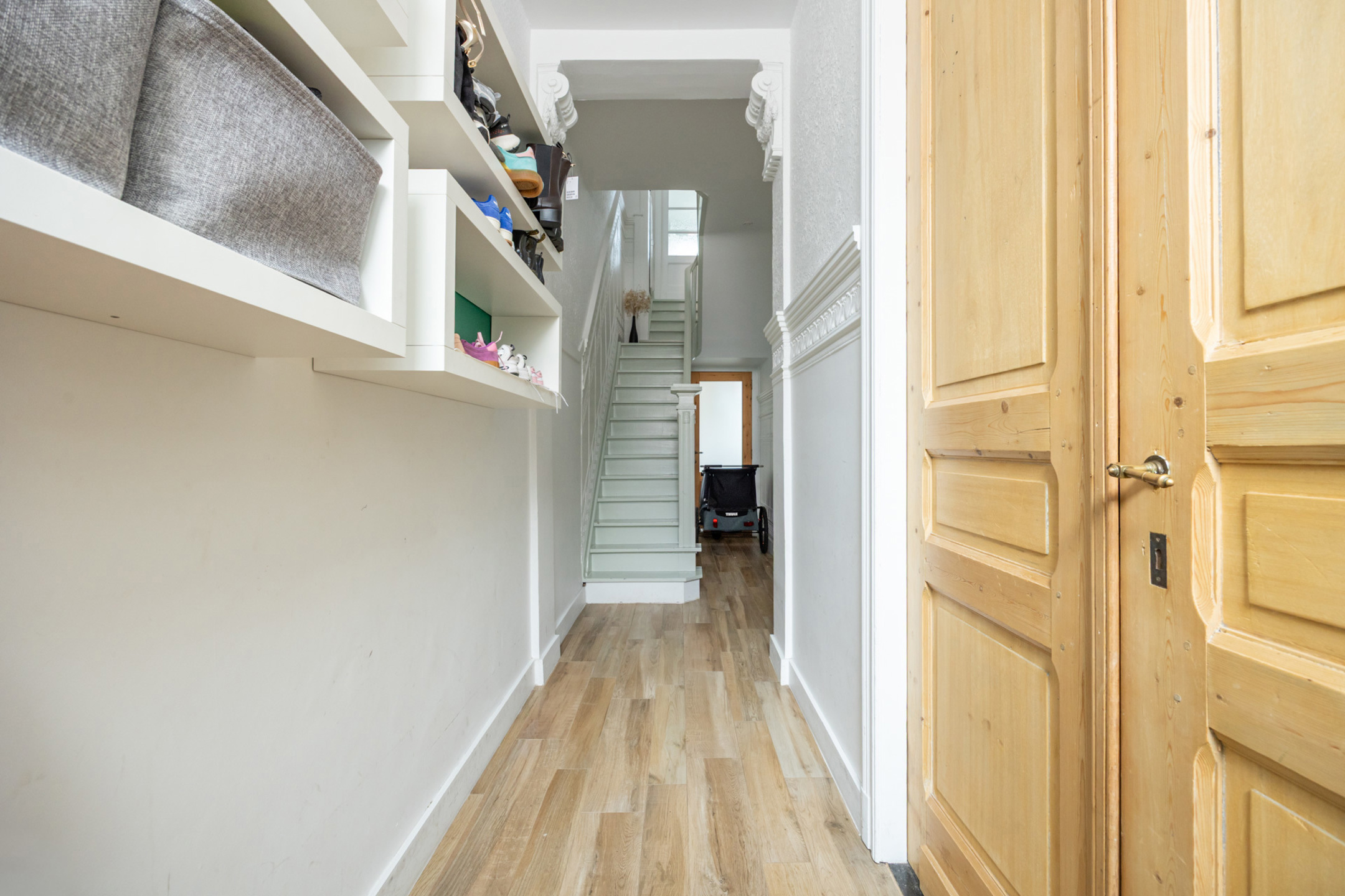 Bij het betreden van de woning komt u in de statige inkomhal, gekenmerkt door een rozet en moulures aan het plafond – echte blikvangers die meteen de sfeer zetten. De inkomhal biedt daarnaast voldoende ruimte voor jassen en schoenen. Via de grote houten deuren bereikt u rechts de gezellige leefruimte, waar de parketvloer en de natuurstenen schouw zorgen voor een authentieke uitstraling.