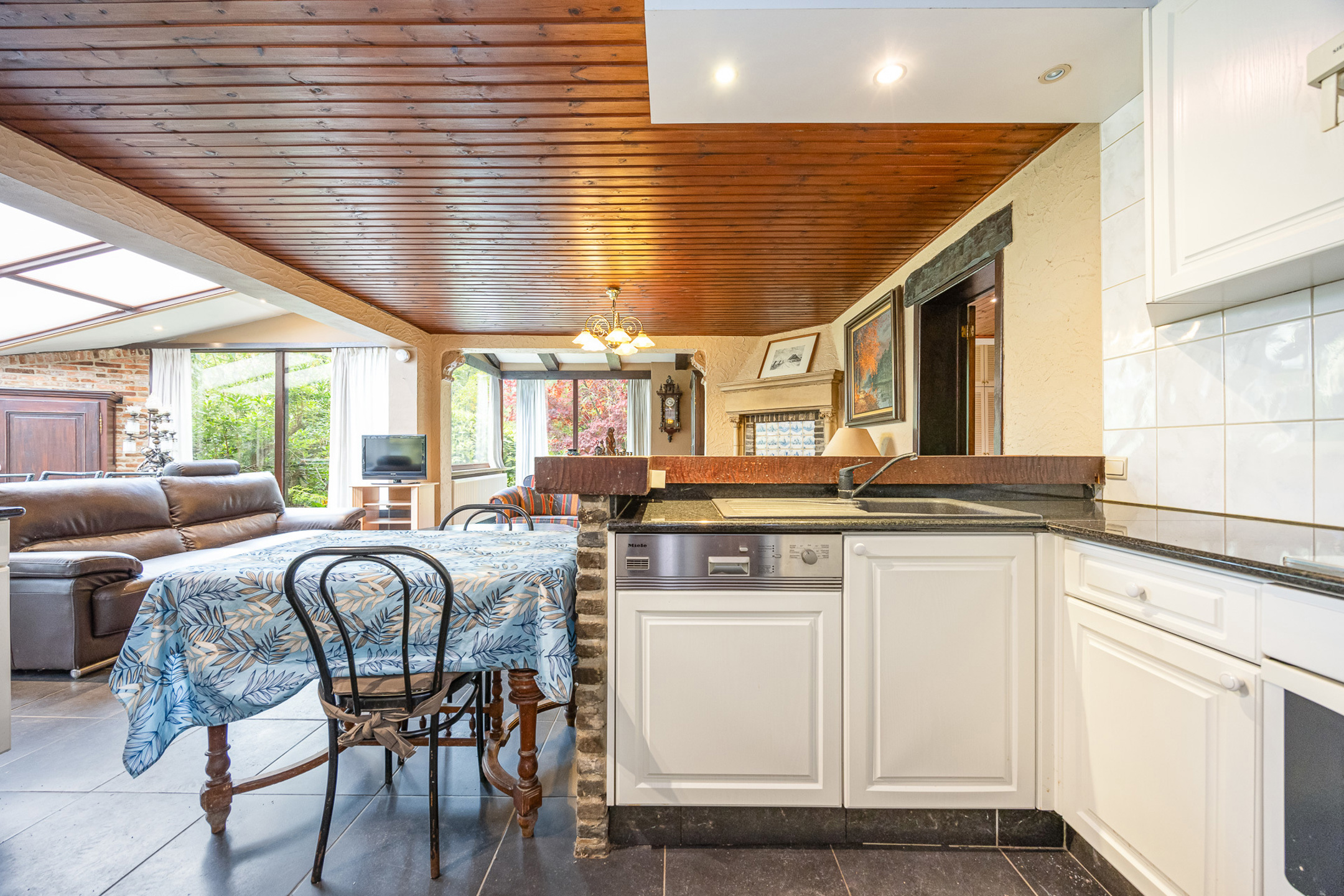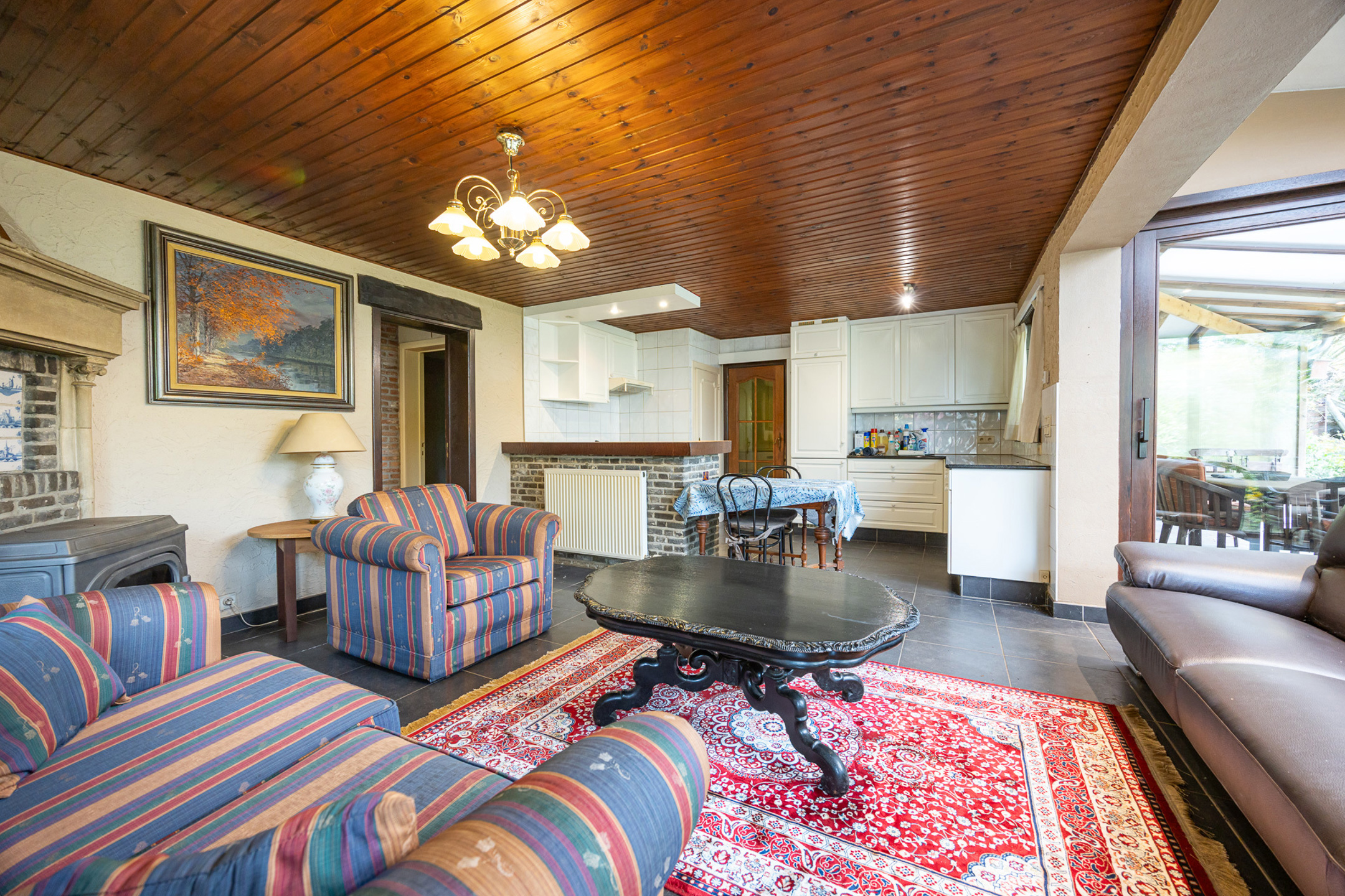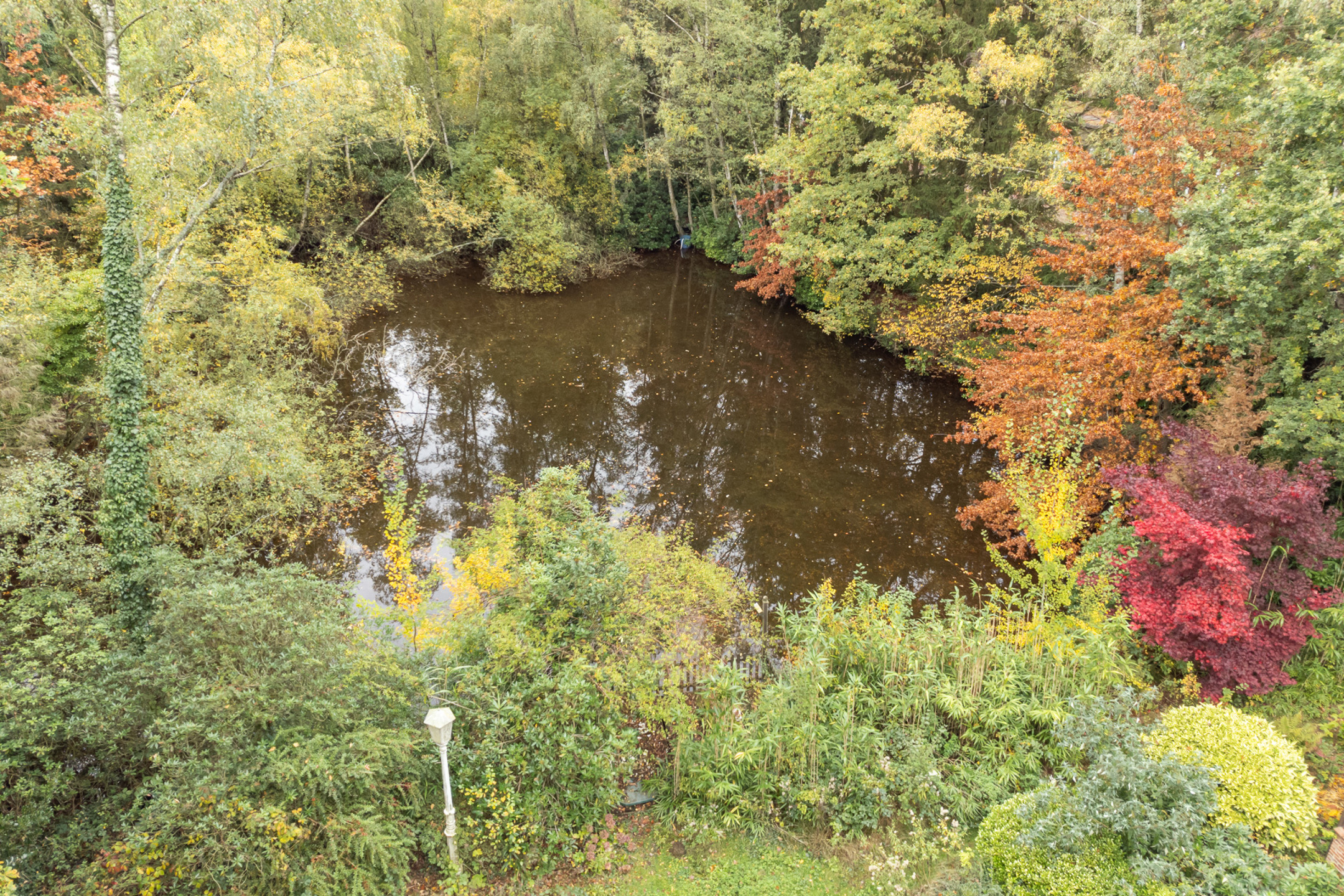 Ligging: woonkamer, keuken, twee slaapkamers, wasplaats, terras, tuin, vijverpartij