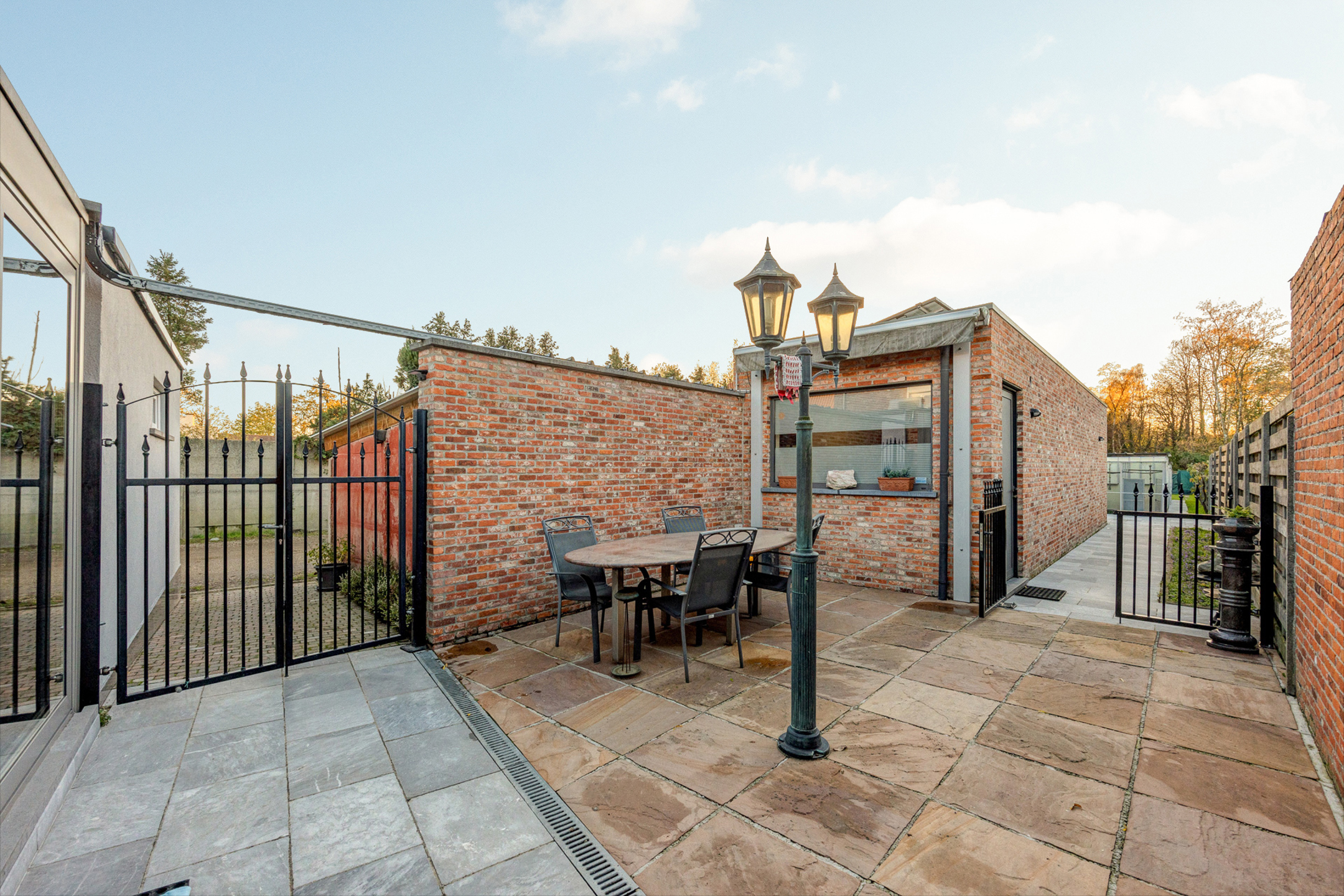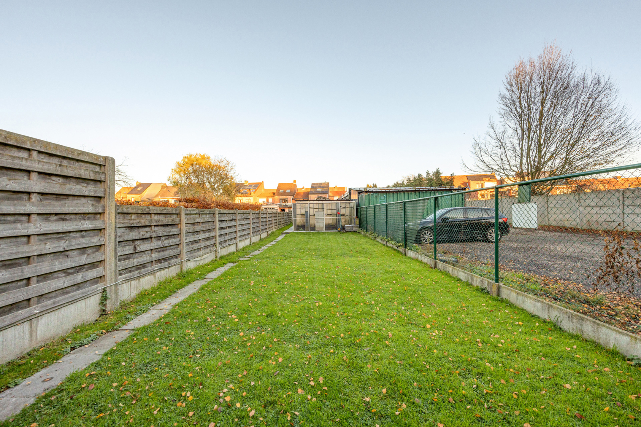 Als we de tuin betreden passeren we eerst de servitudeweg die zowel door u als door de buren gebruikt kan worden. Dit maakt dat fietsen, vuilbakken en dergelijke dus niet mee door de woning genomen moeten worden! Als we doorlopen komen we bij het bijgebouw van zo'n 36 m² waar u dus veel materiaal in kan opslagen, uw hobby kan uitoefenen, ... Verderop staat momenteel een hele reeks volières die mee overgenomen kunnen worden, maar evengoed weg worden gehaald door de eigenaars indien u hier geen behoefte aan heeft!