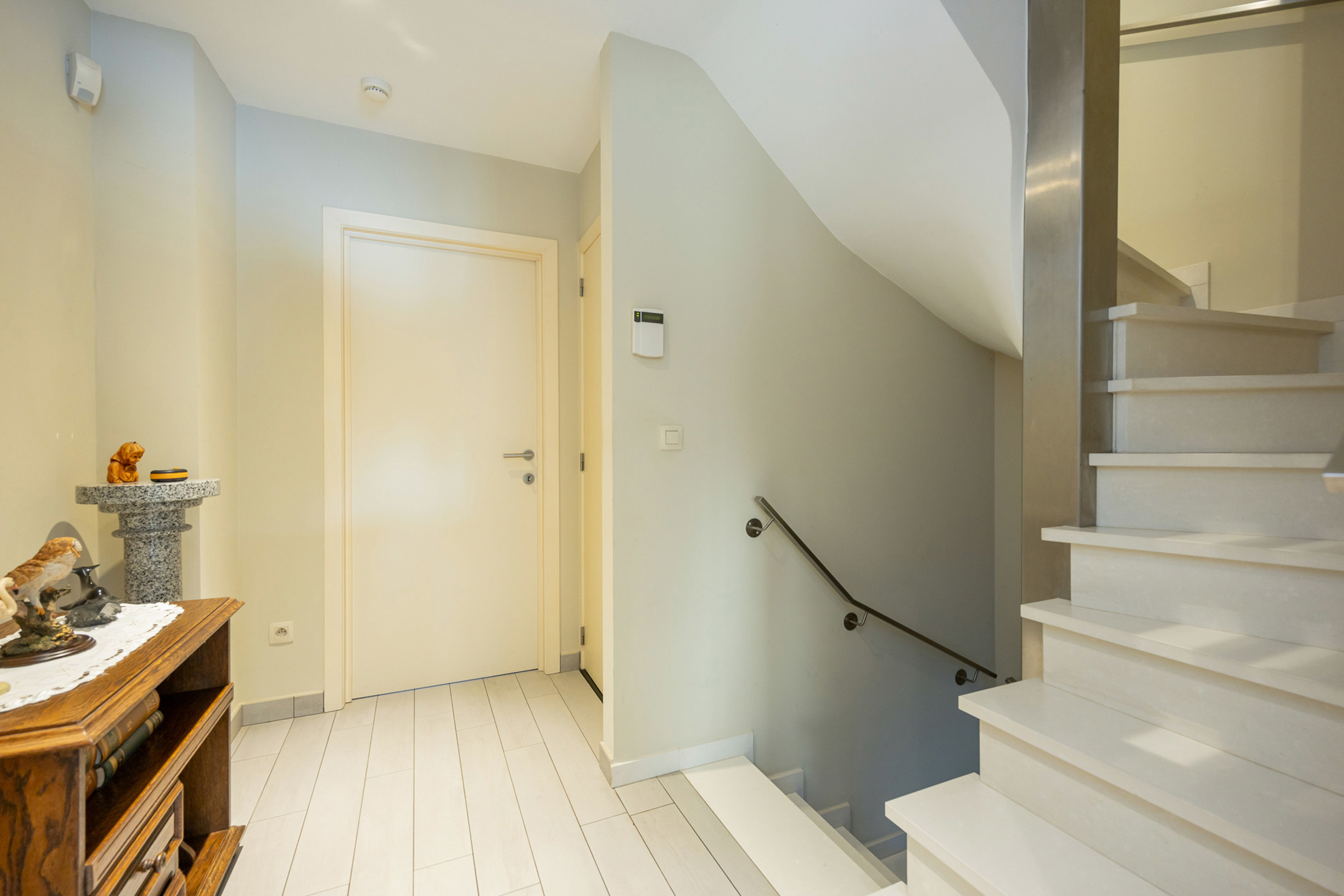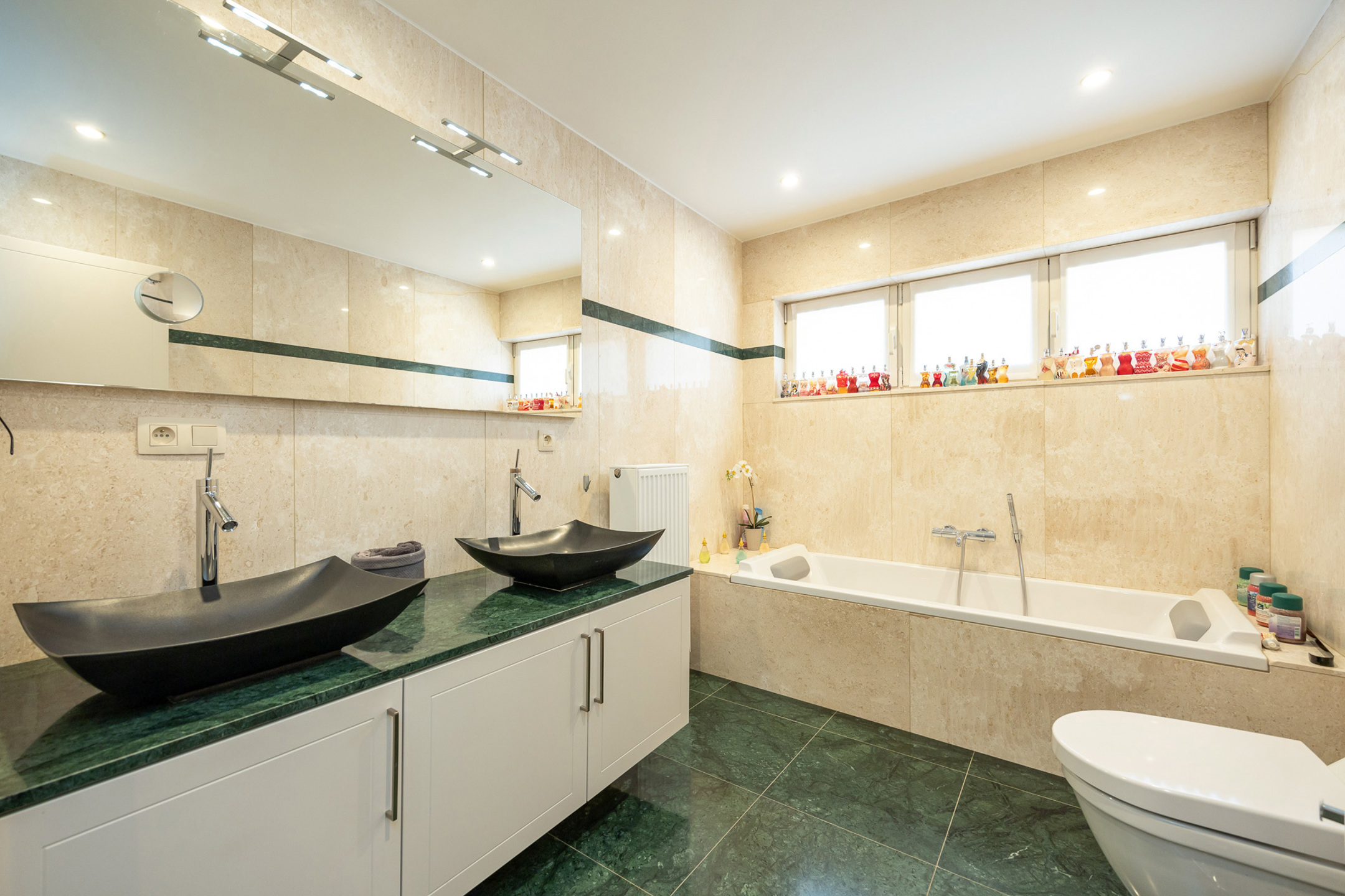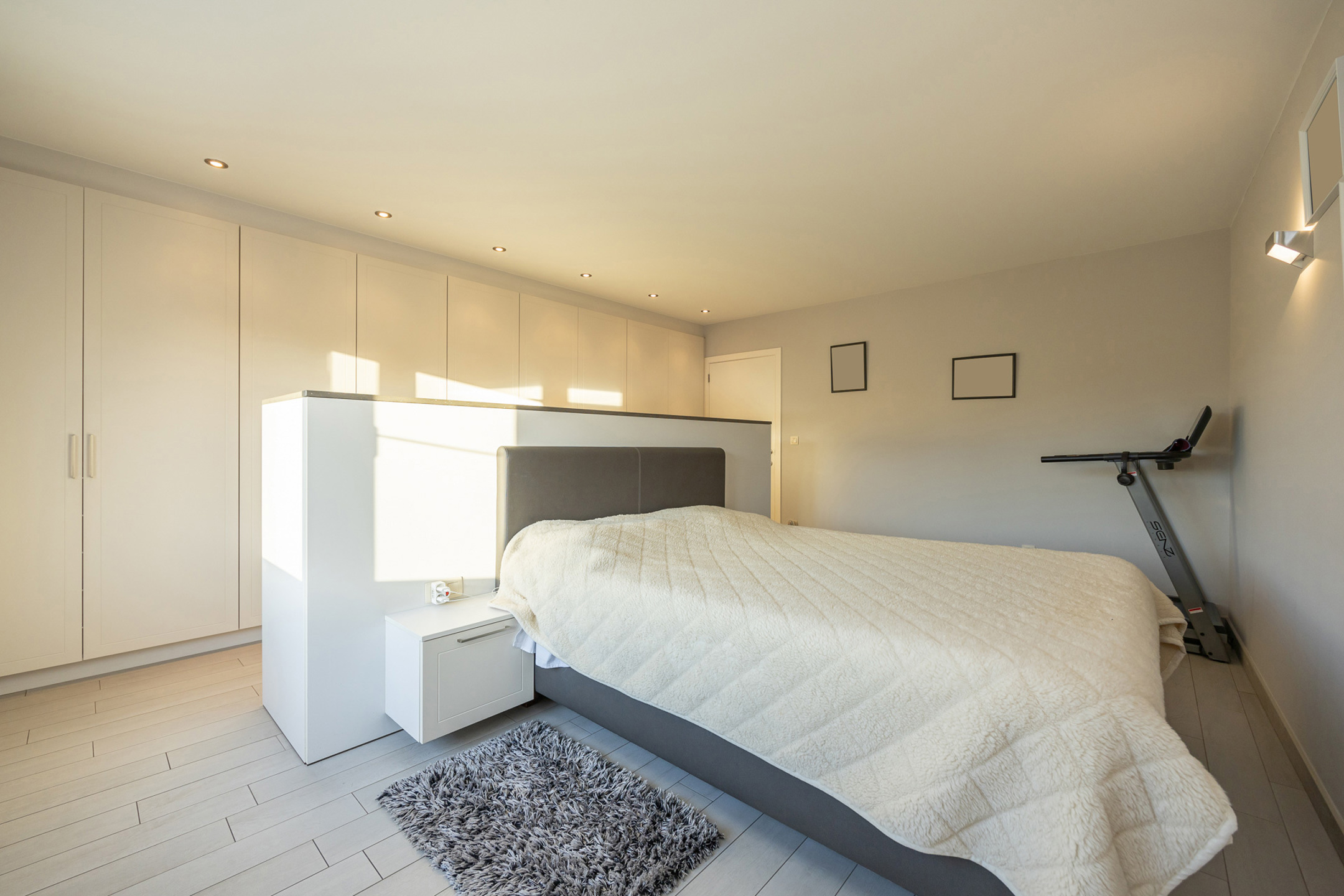 Op de eerste verdieping komen we bij de eerste twee slaapkamers. De master bedroom is voorzien van airco en een heel resem aan dressingkasten. De kleinere slaapkamer is momenteel ingericht als wasplaats maar kan met gemak terug omgevormd worden tot een volwaardige slaapkamer. Daarnaast hebben we nog de badkamer welke werd afgewerkt met natuursteen en uitgerust is met een grote inloopdouche, een ligbad, een lavabomeubel met dubbele spoelbak en een toilet.