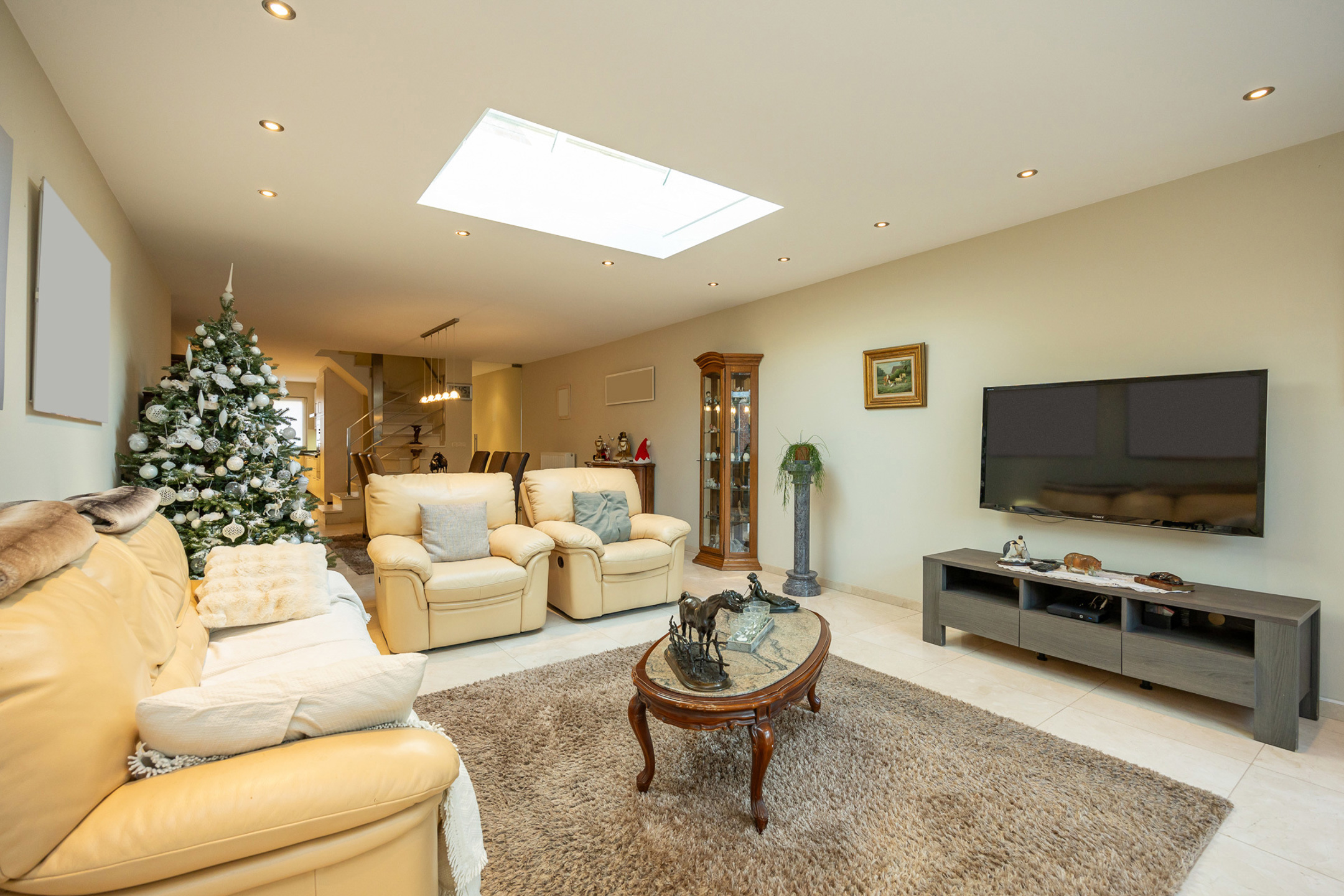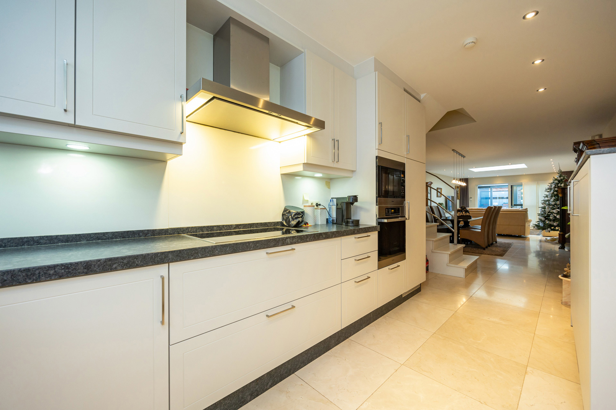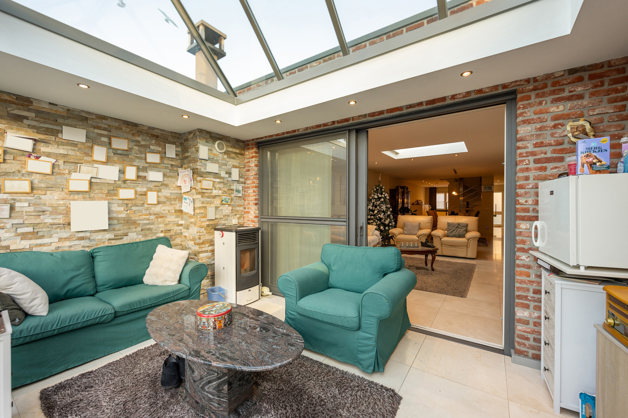 Omschrijving: deze woning werd in 2011 gebouwd en voldoet dus volledig aan de hedendaagse normen! We komen binnen in de inkomhal welke voorzien is van een aparte vestiaire en gastentoilet. Als we doorlopen komen we in de leefruimte waar een lichtkoepel met zonnewering vervaardigd werd zodat het maximale aan natuurlijk daglicht binnengetrokken kan worden. Aansluitend de open keuken welke uitgerust is met een ingemaakte koelkast, inductiekookplaat met dampkap, oven en microgolf, vaatwasser, quooker en ruim voldoende kastruimte. Achteraan de woning is het heerlijk vertoeven in de veranda waar u in de winter kan genieten van de warmte van de voorziene pelletkachel!